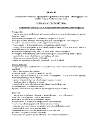 KLASA III Nauczyciel dostosowuje wymagania do potrzeb rozwojowych i edukacyjnych oraz możliwości psychofizycznych ucznia. EDUKACJA POLONISTYCZNA Umiejętności społeczne warunkujące porozumiewanie się i kulturę języka Celujący (6) • wypowiada się na każdy temat wieloma rozbudowanymi zdaniami tworzącymi spójną i logiczną całość; • posiada bogate słownictwo, dostosowuje ton głosu do sytuacji; • nadaje właściwą intonację zdaniom pytającym, oznajmującym i rozkazującym; • uważnie i ze zrozumieniem słucha wypowiedzi innych; • bierze udział w dyskusjach korzysta z przekazanych informacji; • zawsze chętnie uczestniczy w rozmowach, zadaje pytania i odpowiada na nie, wyciąga wnioski i prezentuje własne zdanie; • ciekawie interpretuje różne teksty, stosując wiele środków ekspresji; • bezbłędnie recytuje teksty z zastosowaniem odpowiedniej intonacji, tempa i pauz; • samodzielnie czyta teksty lektur opowiadając ich treść; • aktywnie korzysta ze zbiorów biblioteki; • sprawnie wyszukuje informację w tekstach i innych źródłach Bardzo dobry (5) • wypowiada się na każdy temat w uporządkowanej formie kilkoma rozbudowanymi zdaniami; • dba o wzbogacanie słownictwa; • uważnie słucha i rozumie wypowiedzi innych; • zwykle chętnie uczestniczy w rozmowach, zadaje pytania i odpowiada na nie, wyciąga wnioski i prezentuje własne zdanie; • spójnie i komunikatywnie udziela odpowiedzi na pytania; • wygłasza teksty z właściwą intonacją; • samodzielnie czyta teksty lektur, potrafi opowiedzieć ich treść; • często korzysta ze zbiorów biblioteki; • potrafi samodzielnie wyszukiwać informację w różnych źródłach Dobry (4) • wypowiada się pełnymi zdaniami w sposób logiczny i uporządkowany; • stara się systematycznie bogacić słownictwo; • słucha ze zrozumieniem wypowiedzi innych; • bierze udział w rozmowach związanych z tematem lekcji; • zazwyczaj udziela poprawnych odpowiedzi na pytania; • recytuje poprawnie wiersze bez zachowania odpowiedniej intonacji; • samodzielnie czyta obowiązujące lektury; • opowiada fragmenty lektur pod kierunkiem nauczyciela; • czasami korzysta ze zbiorów biblioteki; • radzi sobie z wyszukiwaniem informacji we wskazanych źródłach Dostateczny (3) • wypowiada się wyrazami i krótkimi zdaniami popełniając błędy gramatyczne i stylistyczne; • nie zawsze chętnie uczestniczy w rozmowach, zadaje proste pytania, odpowiada na nie prostymi zdaniami; • stara się gromadzić nowe słownictwo i struktury składniowe; • nieuważnie słucha wypowiedzi innych; • recytując wiersze popełnia błędy i nie zachowuje odpowiedniej intonacji; • czyta lektury pod kierunkiem nauczyciela; • wymienia bohaterów i miejsca akcji; • rzadko korzysta ze zbiorów biblioteki; • z pomocą nauczyciela wyszukuje informacje we wskazanych źródłach Dopuszczający (2) • niechętnie i z trudem wypowiada się na określony temat; • ma ubogie słownictwo; • odpowiada na pytania wyrazami lub pojedynczymi zdaniami; • nie skupia uwagi na wypowiedziach innych; • recytuje teksty z dużą pomocą nauczyciela, bez odpowiedniej intonacji, często popełniając błędy; • niechętnie czyta obowiązujące lektury; • z pomocą innych wymienia bohaterów i miejsce akcji; • bardzo rzadko korzysta ze zbiorów biblioteki; • z trudem wyszukuje informacji we wskazanych źródłach Niedostateczny (1) • nie chce wypowiadać się na określony temat; • nie potrafi dobrać odpowiednich słów do wypowiedzi nawet przy pomocy nauczyciela; • nie udziela odpowiedzi na pytania; • nie korzysta z informacji przekazywanych przez innych; • posiada bardzo ubogie słownictwo; • nie potrafi recytować wierszy; • nie wyraża chęci do poznawania lektur; • nie korzysta ze zbiorów biblioteki; • nie wyszukuje informacji we wskazanych źródłach Umiejętność czytania i pisania Celujący (6) • czyta wyraziście, płynnie i biegle każdy tekst; • chętnie samodzielnie czyta czasopisma i różne książki; • czyta ze zrozumieniem po cichu i głośno polecenia oraz różne teksty; • sprawnie korzysta z podręcznika i zeszytu ćwiczeń; • samodzielnie i bezbłędnie redaguje oraz zapisuje wielozdaniowe wypowiedzi: list, opis, życzenia, zaproszenie, opowiadanie i sprawozdanie; • pisze czytelnie i estetycznie, zawsze przestrzega zasad kaligrafii; • zawsze bezbłędnie przepisuje oraz pisze z pamięci i ze słuchu nawet trudne teksty, zna i stosuje zasady ortograficzne; • zawsze przestrzega poprawności gramatycznej, stylistycznej, ortograficznej i interpunkcyjnej; • potrafi korzystać ze słownika ortograficznego; • bezbłędnie różnicuje pojęcia: głoska, litera, sylaba, wyraz, zdanie Bardzo dobry (5) • poprawnie i bezbłędnie czyta tekst zwracając uwagę na płynność i wyrazistość; • czyta cicho ze zrozumieniem polecenia i teksty; • umie właściwie korzystać z podręczników i zeszytów ćwiczeń; • zwykle samodzielnie i bezbłędnie redaguje oraz zapisuje krótkie opowiadania, opisy, życzenia, zaproszenia, listy, sprawozdania; • pisze czytelnie i estetycznie, z reguły przestrzega zasad kaligrafii; • w przepisywaniu oraz pisaniu z pamięci i ze słuchu sporadycznie popełnia błędy; • zna i stosuje zasady ortograficzne; • systematycznie korzysta ze słownika ortograficznego; • w pracach pisemnych przestrzega zasad gramatyki, ortografii i interpunkcji; • z reguły bezbłędnie różnicuje pojęcia: głoska, litera, sylaba, wyraz, zdanie Dobry (4) • czyta poprawnie i wyraziście w tempie umiarkowanym; • samodzielnie potrafi wypowiedzieć kilka zdań na temat przeczytanego tekstu; • zazwyczaj korzysta z opracowanych tekstów kultury oraz podręczników i zeszytów ćwiczeń; • stara się samodzielnie i poprawnie zapisywać redagowane zespołowo opisy i krótkie opowiadania; • stara się pisać czytelnie i estetyc