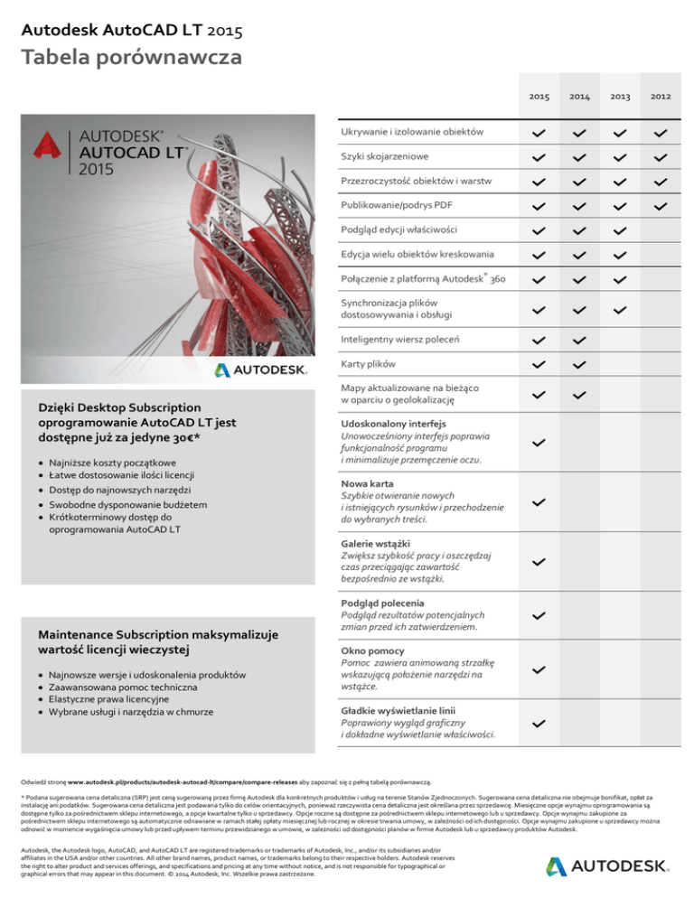 Autodesk AutoCAD LT 2015 Tabela porównawcza 2015 2014 2013 2012 Ukrywanie i izolowanie obiektów Szyki skojarzeniowe Przezroczystość obiektów i warstw Publikowanie/podrys PDF Podgląd edycji właściwości Edycja wielu obiektów kreskowania ® Połączenie z platformą Autodesk 360 Synchronizacja plików dostosowywania i obsługi Inteligentny wiersz poleceń Karty plików Dzięki Desktop Subscription oprogramowanie AutoCAD LT jest dostępne już za jedyne 30€* • Najniższe koszty początkowe • Łatwe dostosowanie ilości licencji • Dostęp do najnowszych narzędzi • Swobodne dysponowanie budżetem • Krótkoterminowy dostęp do oprogramowania AutoCAD LT Mapy aktualizowane na bieżąco w oparciu o geolokalizację Udoskonalony interfejs Unowocześniony interfejs poprawia funkcjonalność programu i minimalizuje przemęczenie oczu. Nowa karta Szybkie otwieranie nowych i istniejących rysunków i przechodzenie do wybranych treści. Galerie wstążki Zwiększ szybkość pracy i oszczędzaj czas przeciągając zawartość bezpośrednio ze wstążki. Maintenance Subscription maksymalizuje wartość licencji wieczystej • • • • Najnowsze wersje i udoskonalenia produktów Zaawansowana pomoc techniczna Elastyczne prawa licencyjne Wybrane usługi i narzędzia w chmurze Podgląd polecenia Podgląd rezultatów potencjalnych zmian przed ich zatwierdzeniem. Okno pomocy Pomoc zawiera animowaną strzałkę wskazującą położenie narzędzi na wstążce. Gładkie wyświetlanie linii Poprawiony wygląd graficzny i dokładne wyświetlanie właściwości. Odwiedź stronę www.autodesk.pl/products/autodesk-autocad-lt/compare/compare-releases aby zapoznać się z pełną tabelą porównawczą. * Podana sugerowana cena detaliczna (SRP) jest ceną sugerowaną przez firmę Autodesk dla konkretnych produktów i usług na terenie Stanów Zjednoczonych. Sugerowana cena detaliczna nie obejmuje bonifikat, opłat za instalację ani podatków. Sugerowana cena detaliczna jest podawana tylko do celów orientacyjnych, ponieważ rzeczywista cena detaliczna jest określana przez sprzedawcę. Miesięczne opcje wynajmu oprogramowania są dostępne tylko za pośrednictwem sklepu internetowego, a opcje kwartalne tylko u sprzedawcy. Opcje roczne są dostępne za pośrednictwem sklepu internetowego lub u sprzedawcy. Opcje wynajmu zakupione za pośrednictwem sklepu internetowego są automatycznie odnawiane w ramach stałej opłaty miesięcznej lub rocznej w okresie trwania umowy, w zależności od ich dostępności. Opcje wynajmu zakupione u sprzedawcy można odnowić w momencie wygaśnięcia umowy lub przed upływem terminu przewidzianego w umowie, w zależności od dostępności planów w firmie Autodesk lub u sprzedawcy produktów Autodesk. Autodesk, the Autodesk logo, AutoCAD, and AutoCAD LT are registered trademarks or trademarks of Autodesk, Inc., and/or its subsidiaries and/or affiliates in the USA and/or other countries. All other brand names, product names, or trademarks belong to their respective holders. Autodesk reserves the right to alter product and services offerings, and specifications and pricing at any time without notice, and is not responsible for typographical or graphical errors that may appear in this document. © 2014 Autodesk, Inc. Wszelkie prawa zastrzeżone.