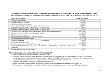 ZESTAWIENIE TERENÓW ZIELENI GMINY CZERWONAK - PRZEZNACZONYCH DO KONSERWACJI W 2016 R. Część III. Nr WKŚ.272.3.2016. (parki zabytkowe: pałacowy, przy cmentarzu na ul. Kolejowej w Owińskach oraz przy kaplicy na ul. Szkolnej w Bolechowie, dz. 76/2 i 78). Lp 1. 2. 3. 4. 5. 6. 7. 8. 9. 10. 11. 12. 13. 14. 15. Prace do wykonania Ilość do wykonania 2 Żywopłoty cięcie z ziemi 5.000 m 2 Żywopłoty cięcie z rusztowań 450 m 2 Zgrabienie pędów z żywopłotów 5.450 m p 2 Systematyczne odchwaszczanie żywopłotów - (podlewanie) 2.550 m p 2 Systematyczne przekopanie i pielenie skupin - (podlewanie) 210 m p Systematyczne przekopanie i pielenie misek - (podlewanie) 600 szt. 2 Koszenie mech. trawników i poboczy dróg na ter. płaskim, w tym łąki ekologicznej 161.230 m 2 Koszenie mech. trawników i poboczy dróg na skarpach 24.300 m 2 Zgrabienie skoszonej trawy 180.000 m 2 Zgrabienie liści (wiosna, jesień) – wszystkie trawniki 50.700 m Usuwanie odrostów drzew i krzewów 5.500 szt. p 2 Założenie trawników - (podlewanie) 3.500 m 2 Zamiatanie dróg parkowych 7.930 m 2 Porządkowanie terenów objętych konserwacją 161.230 m Zakup palików (impregn. o śred. 8 cm z wiązaniami) z uzupełnieniem lub wymianą palików przy 50 szt. drzewach 2 16. Oczyszczanie brzegów stawów z roślin 500 m Prace , których wykonanie należy uwzględnić w kosztach ogólnych: - transport materiałów biodegradowalnych, zrębkowanie gałęzi, - systematyczne utrzymanie porządku na wszystkich terenach objętych konserwacją (w tym zbierania śmieci: papiery, kapsle, butelki, niedopałki papierosów, szkło) wraz z wywozem odpadów na Składowisko Odpadów Komunalnych i uiszczeniem obowiązujących opłat, - kompostowanie masy organicznej we własnym zakresie lub przekazywanie jej do kompostowania, - systematyczne sprzątanie gałęzi i liści, również po silnych wiatrach, 2 - uzupełnienie siewem wypadów trawy w miejscach wskazanych przez Zamawiającego, na powierzchni ok. 1.000 m , - 3-krotny oprysk podszytu parków, w miejscach wskazanych przez Zamawiającego wraz z ochroną gatunków występujących w 1 podszycie, w tym zakup środków chemicznych, - jednorazowe wygrabienie terenu całych parków z wszystkich gałęzi i liści, do końca maja 2016r., - zabezpieczenie i zwalczanie chemiczne chorób grzybowych oraz szkodliwych owadów występujących na drzewach i krzewach oraz zwalczanie herbicydami chwastów na trawnikach oraz barszczu Sosnowskiego, w tym zakup środków chemicznych, 3 - zakupienie kory 15 m oraz uzupełnienie ubytków na konserwowanych terenach, - niżej wymienione prace zostaną wykonane na zlecenie Zamawiającego: 2 założenie trawników na powierzchni 3.500 m , zgodnie z instrukcją wymagań dla Wykonawcy, na terenie Gminy Czerwonak, 2 uzupełnienie siewem wypadów trawy w miejscach wskazanych przez Zamawiającego, na powierzchni ok. 1.000 m , 2 2 podlewanie drzew, krzewów oraz trawników - 6.260 m x 12 l./m do dziesięciu razy w miesiącu przez 4 miesiące w sezonie tj. 3.004.800 l. w sezonie, zabezpieczenie i zwalczanie chemiczne chorób grzybowych oraz szkodliwych owadów występujących na drzewach i krzewach oraz zwalczanie herbicydami chwastów na trawnikach oraz barszczu Sosnowskiego, w tym zakup środków chemicznych, 3 zakupienie kory 15 m oraz uzupełnienie ubytków na konserwowanych terenach, Uwagi: - rozpoczęcie prac od dnia podpisania umowy, ale nie wcześniej niż od 11 kwietnia 2016r., - do koszenia parku należy również koszenie w pasie przy barierkach, przy ul. ks. Piotrkowskiego oraz pobocze ul. Parkowej w Owińskach, - pod pojęciem zgrabienia liści rozumie się dokładne wygrabienie liści, w szczególności na nowo założonych trawnikach, - pod pojęciem zamiatania dróg parkowych rozumie się systematyczne zamiatanie ścieżek spacerowych; w okresie wiosennym i jesiennym, nie rzadziej niż 1x w tygodniu, - termin zgrabienia i wywiezienia odpadów biodegradowalnych, nie może przekroczyć 24 godz. od chwili skoszenia, z wyjątkiem trawnika przed pałacem, gdzie termin zgrabienia i wywiezienia odpadów biodegradowalnych nie może przekroczyć 12 godz., - odpady winny być zagospodarowane zgodnie z ustawą o odpadach. Karty przekazania odpadów biodegradowalnych należy dostarczyć Zamawiającemu, w terminie 7 dni od ich sporządzenia, - podlewanie i pielenie krzewów według potrzeb – bez zlecenia Zamawiającego. 2