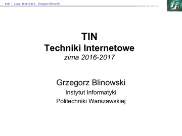 TIN – zima 2016-2017, Grzegorz Blinowski TIN Techniki Internetowe zima 2016-2017 Grzegorz Blinowski Instytut Informatyki Politechniki Warszawskiej TIN – zima 2016-2017, Grzegorz Blinowski Plan wykładów 2 3 4 5 6, 7, 8 9, 10, 11 12 13 Intersieć, ISO/OSI, protokoły sieciowe, IP Protokoły transportowe: UDP, TCP Model klient-serwer, techniki progr. serwisów Protokoły aplikacyjne: telnet, ftp, smtp, nntp, inne HTTP HTML, XML Aplikacje WWW, CGI, sesje, serwery aplikacji serwlety, integracja z backended SQL Aspekty zaawansowane: wydajność, przenośność, skalowalność; klastering SOAP TIN – zima 2016-2017, Grzegorz Blinowski Aplikacje WWW TIN – zima 2016-2017, Grzegorz Blinowski Wymagania • • • • • • • Otwartość (w sensie obsługi standardów) Skalowalność, Wydajność Stabilność Bezpieczeństwo Integralność transakcji (Ochrona inwestycji ) TIN – zima 2016-2017, Grzegorz Blinowski Aplikacje WWW • Aplikacje Web - nowe ucieleśnienie modelu klient- serwer: – przeglądarka - klient – Serwer: serwer WWW, serwer aplikacji, serwer bazy danych (źródła danych), monitor transakcji Dlaczego aplikacje Web? – Dostępna, powszechna, standardowa technologia – Standardy otwarte - pozwalają na wdrożenie intranetu i ekstranetu - nie możemy zakładać, że klienci (partnerzy) będą się dostosowywać do naszych rozwiązań – B. duża oferta serwerów, narzędzi, itp. – Niski koszt utrzymania klienta - klientem jest przeglądarka lub applet Java, w przypadku awarii lub złego funkcjonowania reinstalacja jest b. prosta - przeglądarka - prosta w obsłudze i administracji, tania, wymienna TIN – zima 2016-2017, Grzegorz Blinowski Thin/fat client Klient - interfejs GUI i "logika biznesowa" "Fat Client" GUI + aplikacja Źródło danych Klient - tylko GUI i prosta weryfikacja danych Serwer aplikacji logika biznesowa "Thin Client" Serwer aplikacji Źródło danych TIN – zima 2016-2017, Grzegorz Blinowski Warstwy aplikacji WWW • Klient: prezentacja, elementarna logika (JavaScript - np. weryfikacja danych wejściowych, obsługa słowników) • Serwer WWW – strony statyczne – (prosty serwer aplikacji) • Serwer Aplikacji – – – – warstwa prezentacji warstwa sesji warstwa logiki (aplikacji) warstwa komunikacji z: backend, innymi S.A., innymi serwerami • Źródła danych – bazy relacyjne – inne bazy danych (n.p. full-text, …) TIN – zima 2016-2017, Grzegorz Blinowski Podstawowe mechanizmy klienckie • Formularze – Podstawowe kontrolki interaktywne: pola tekstowe, przyciski, listy wyboru, checkbox, radio, ... – Dość ubogie w stosunku do kontrolek typowego GUI • JavaScript (ECMA Script) • “Applety” – – – – Java "Komponenty" (inne applety): ActivX, COM, … TIN – zima 2016-2017, Grzegorz Blinowski Formularze HTML • Formularz zawarty między tagami: <form> </form> • atrybuty formularza: – <form method="GET|POST" action="/path/program" enctype="application/x-www-form-urlencoded|multi-part/formdata"> – brak akcji - zgłoszenie do aktualnego URL • Elementy formularza: – statyczne zmienne ukryte - hidden – kontrolki "input" • pola tekstowe zwykłe (text) i z ukrytym tekstem (password) • radio, checkbox • przyciski specjalne: submit i reset (przywróć) – Pola tekstowe (textarea) – listy wyboru - jednokrotne (select), wielokrotne(select multiple) TIN – zima 2016-2017, Grzegorz Blinowski HIDDEN <input type="hidden" name="Nazwa" Value="Wartosc"> • Tworzy element formularza, który nie jest w żaden sposób wyświetlany w przeglądarce • Elementy hidden wykorzystywane są do przenoszenia danych między formularzami • Przykładowo: – aktualnego języka – identyfikatora użytkownika – danych sesji, itp. TIN – zima 2016-2017, Grzegorz Blinowski INPUT TEXT, PASSWORD <input type="text" name="Nazwa" Value="tekst poczatkowy" size="nnn" maxsize="mmm" > <input type="password" name="Nazwa" Value="tekst poczatkowy" size="nnn" maxsize="mmm" > Tworzy jednolinijkowe pole tekstowe Jest to domyślny typ elementu input Value określa tekst domyślny zawarty w polu Size określa rozmiar widocznego pola, a maxsize maksymalną długość przyjmowanego tekstu • Dla password echo tekstu ma postać "*" • Uwaga - password w żaden sposób nie zabezpiecza danych przed podsłuchem! • • • • TIN – zima 2016-2017, Grzegorz Blinowski INPUT CHECKBOX <input type="checkbox" name="Nazwa" Value="wartosc" [checked]> Tworzy binarny przełącznik Z formularza zwracane są tylko te przełączniki, które zostały zaznaczone • Zwracana jest watość podana w value • Można utworzyć wiele przełączników o tej samej nazwie, wartości zaznaczone zostaną wtedy zgrupowane • • TIN – zima 2016-2017, Grzegorz Blinowski INPUT RADIO <input type="radio" name="Nazwa" Value="wartosc" [checked]> • • • • Tworzy przełącznik typu "1-z-wielu" Grupa przełaczników radio identyfikowana jest wspólną nazwą W obrębie grupy tylko jeden przełącznik może być zaznaczony Zwracana jest watość podana w value (jedna) TIN – zima 2016-2017, Grzegorz Blinowski INPUT BUTTON <input type="Button" name="Nazwa" Value="Opis"> • • Tworzy przycisk o nazwie name z opisem value Przycisk nie przekazuje informacji jako rezultat działania formularza, może być jednak użyty poprzez zdarzenia JavaScript TIN – zima 2016-2017, Grzegorz Blinowski INPUT SUBMIT <input type="submit" Value="wartosc"> <input type="reset" Value="wartosc"> • Submit: – Tworzy przycisk zgłaszający formularz – Domyślny przekazywany tekst to "Submit" • Reset: – Naciśnięcie powoduje powrót wszystkich wartości formularza do domyślnych TIN – zima 2016-2017, Grzegorz Blinowski INPUT FILE <input type="file" name="nazwa" value="nazwapliku" accept="lista typów MIME"> Tworzy dialog wyboru pliku otwierany przyciskiem "browse" Plik zostanie wczytany i przesłany do serwera dopiero w momencie zgloszenia formularza • value określ