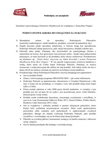 Podwójne, na szczęście! InstruktaŜ wprowadzający Partnerów Handlowych do współpracy z firmą Beer Fingers. PODSTAWOWE KROKI DO OSIĄGNIECIA SUKCESU 1. Skompletuj zestaw do sprzedaŜy Podwójnych Paluszków (materiały marketingowe: ulotki handlowe, produkty, wieszaki do paluszków itp.). 2. Znajdź dowolny punkt sprzedaŜy detalicznej, w którym mogą być sprzedawane Podwójne Paluszki (sklep spoŜywczy, pub, stacja benzynowa, sklepiki szkolne itp.) 3. Odwiedź dany punkt. Pamiętaj, aby przychodzić do potencjalnego klienta z uśmiechem na twarzy, być grzecznym oraz pewnym siebie - dzięki temu jednocześnie pokazujesz, Ŝe masz pewność co do produktu, który chcesz zaoferować. Przedstawiasz się klientowi np. „Dzień dobry, nazywam się Adam Kowalski i jestem Partnerem Handlowym firmy Beer Fingers.” W ten sposób rozpoczynasz rozmowę handlową z osobą, która moŜe od Ciebie kupić Podwójne Paluszki. Pamiętaj, Ŝe musisz rozmawiać z osobą decyzyjną lub zdobyć do niej kontakt. Jeśli takiej osoby nie ma w danej chwili na miejscu, postaraj się umówić na kolejną wizytę handlową. 4. Przedstawiając ofertę Podwójnych Paluszków uŜywaj następujących argumentów: • Jest to produkt Polski • Znany z telewizyjnego programu DRAGONS DEN – jak zostać milionerem • Podwójne Paluszki są opatentowane, chronionym w Urzędzie Patentowym i nikt inny w kraju ich nie produkuje, w związku z tym, taki produkt sklep moŜe kupić tylko u Ciebie. • Firma została załoŜona w roku 2006 przez dwóch studentów, w związku z tym produkt jest juŜ od paru lat na rynku i jest poszukiwany przez wielu klientów, których grono wciąŜ rośnie. • Produkt został wielokrotnie doceniony, otrzymując wyróŜnienia i certyfikaty, w tym m.in. Laur Konsumenta Odkrycie Roku 2011, Doceń Polskie, Polska Jakość, Rynkowy Lider Innowacji 2012 i inne. • Jest to wyjątkowy i unikalny produkt w postaci sklejonych paluszków, które kiedyś były symbolem przynoszącym szczęście. DuŜa część społeczeństwa potwierdza efekt szukania tych podwójnych w opakowaniach zwykłych paluszków, dlatego teŜ chętnie wybierają Podwójne Paluszki, jako produkt szczęśliwy i wyróŜniający się na tle klasycznej słonej przekąski. • Paluszki są wysokiej jakości, konsumenci uznają je za bardzo smaczne i zdrowsze od np. chipsów. • Jest to idealna przekąska dla kaŜdego i na kaŜdą okazję. www.podwójnepaluszki.pl Podwójne, na szczęście! Produkt ma konkurencyjną cenę - sugerowane ceny dla konsumenta to: Podwójne Paluszki z solą (80 gram) – 1,49 złotych Podwójne Paluszki z sezamem (60 gram) – 1,49 złotych Podwójne Paluszki w polewie (60 gram) – 2,99 złotych • W sytuacji, kiedy potencjalny klient stwierdzi, Ŝe są za drogie, wtedy moŜesz zaproponować ofertę promocyjną - 3 opakowania (po jednym kaŜdego smaku) za 5 złotych. • Jeśli potencjalny klient nie ma pewności co do jakości produktu, moŜesz go poczęstować paluszkami, aby mógł samodzielnie się o tym przekonać. Warto w takiej sytuacji zadać dodatkowe pytania klientowi, np.: o Jakiego smaku chciałby/chciałaby spróbować? o Zapytaj czy potencjalny klient próbował kiedyś połączenia smaku chrupiących paluszków z czekoladą? KaŜdy kto próbuje od razu kupuje! o MoŜesz takŜe zaproponować przeprowadzenie degustacji dla klientów tego sklepu, aby mogli spróbować produktu i od razu go kupić – przyspiesza to znacząco odsprzedaŜ z punktu detalicznego. Zapewnij klienta, Ŝe organizację całej degustacji bierze na siebie firma (logistycznie i finansowo), my zajmujemy się organizacją, przygotowaniem stoiska, zapewniamy hostessę, a wszystkie sprzedane ze sklepu paluszki to czysty zysk dla sklepu! 5. W momencie otrzymania zamówienia, moŜesz je zrealizować w następujący sposób: • Jeśli masz ze sobą towar, sprzedajesz produkty od reki, wystawiasz fakturę sprzedaŜy i odbierasz gotówkę od Twojego klienta. • Jeśli nie masz ze sobą towaru, dajesz klientowi do podpisania i opieczętowania druk zamówienia i ustalasz termin dostawy. 6. Pozyskanego klienta wprowadzasz do bazy CRM i otrzymujesz później stosowną premię. 7. Staraj się dobrze wyeksponować Podwójne Paluszki w sklepie, tak aby odsprzedaŜ ze sklepu była na poziomie minimum po 1 kartonie kaŜdego smaku, w ciągu 1 miesiąca. W takiej sytuacji moŜesz liczyć na większy obrót i częstsze zamówienia, a tym samym, na większy zysk. • DODATKOWE WSKAZÓWKI ABY SZYBCIEJ OSIĄGNĄĆ SUKCES W BUDOWIE BAZY KLIENTÓW: Zorganizuj sprzedaŜ bezpośrednią do konsumentów (finalnych odbiorców) poprzez udział w róŜnego rodzaju imprezach masowych lub takich wydarzeniach gdzie spotkać moŜna duŜą ilość osób np. bazarki, festyny, koncerty, róŜne wydarzenia kulturalne, imprezy sportowe itp. Częstuj ludzi Podwójnymi Paluszkami i sprzedawaj pakiety za 5 złotych lub pojedyncze opakowania za 2 lub 3 złote. POWODZENIA! www.podwójnepaluszki.pl