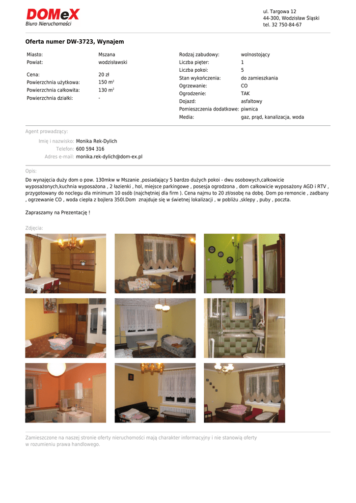 ul. Targowa 12 44-300, Wodzisław Śląski tel. 32 750-84-67 Oferta numer DW-3723, Wynajem Miasto: Mszana Rodzaj zabudowy: wolnostojący Powiat: wodzisławski Liczba pięter: 1 Cena: 20 zł Liczba pokoi: 5 Powierzchnia użytkowa: 150 m2 Stan wykończenia: do zamieszkania Powierzchnia całkowita: 130 m2 Ogrzewanie: CO Powierzchnia działki: - Ogrodzenie: TAK Dojazd: asfaltowy Pomieszczenia dodatkowe: piwnica Media: gaz, prąd, kanalizacja, woda Agent prowadzący: Imię i nazwisko: Monika Rek-Dylich Telefon: 600 594 316 Adres e-mail: [email protected] Opis: Do wynajęcia duży dom o pow. 130mkw w Mszanie ,posiadający 5 bardzo dużych pokoi - dwu osobowych,całkowicie wyposażonych,kuchnia wyposażona , 2 łazienki , hol, miejsce parkingowe , posesja ogrodzona , dom całkowicie wyposażony AGD i RTV , przygotowany do noclegu dla minimum 10 osób (najchętniej dla firm ). Cena najmu to 20 zł/osobę na dobę. Dom po remoncie , zadbany , ogrzewanie CO , woda ciepła z bojlera 350l.Dom znajduje się w świetnej lokalizacji , w pobliżu ,sklepy , puby , poczta. Zapraszamy na Prezentację ! Zdjęcia: Zamieszczone na naszej stronie oferty nieruchomości mają charakter informacyjny i nie stanowią oferty w rozumieniu prawa handlowego.