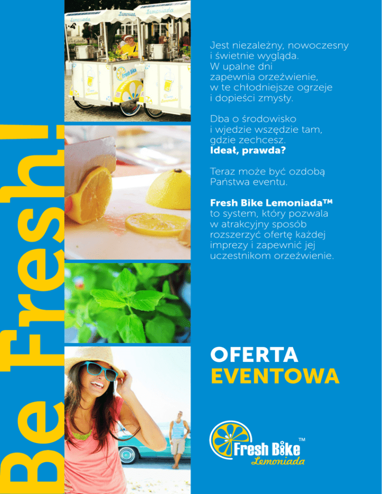 Jest niezależny, nowoczesny i świetnie wygląda. W upalne dni zapewnia orzeźwienie, w te chłodniejsze ogrzeje i dopieści zmysły. Dba o środowisko i wjedzie wszędzie tam, gdzie zechcesz. Ideał, prawda? Teraz może być ozdobą Państwa eventu. Fresh Bike Lemoniada™ to system, który pozwala w atrakcyjny sposób rozszerzyć ofertę każdej imprezy i zapewnić jej uczestnikom orzeźwienie. OFERTA EVENTOWA FRESH START – czyli kilka słów o nas FRESH BIKE to w pełni mobilny i stylowy rower, który pełni funkcję niezależnego punktu sprzedaży lemoniady. Dlaczego postawiliśmy właśnie na lemoniadę? Chyba każdy z nas zna jej smak. Lubią ją dzieci, młodzież i dorośli. Chłodzi, orzeźwia i gasi pragnienie, a przy okazji wspaniale poprawia humor. Lemoniada, którą serwujemy przygotowywana jest wyłącznie ze świeżych produktów, bez żadnych konserwantów i sztucznych dodatków. Właśnie dlatego jest tak pyszna, zdrowa i orzeźwiająca. Dlatego jest niezastąpiona! Nasze certyfikaty i pozwolenia FRESH BIKE prawnie - to wózek rowerowy, spełniający wszelkie wymogi stawiane przez Kodeks Ruchu Drogowego oraz inne regulacje prawne. FRESH IDEA – jesteśmy unikalni Nasz pomysł jest w 100% polską inicjatywą, podobnie jak kapitał, który finansuje projekt. Stawiamy na innowacje, ekologię i jakość. Rowery jeżdżące pod marką FRESH BIKE zostały specjalnie zaprojektowane na potrzeby całego systemu. Są atrakcyjne wizualnie, stylowe, zaawansowane technologicznie i przede wszystkim ekologiczne. Każdy z nich może być mini punktem turystycznym, w którym uczestnicy eventu mogą otrzymać materiały promocyjne, np. mapy, ulotki i broszury z programem wydarzenia. Posiada on niezbędne oświetlenie oraz wymagane oznaczenia. System obiegu wody użytkowej spełnia wymogi HACCP, zaś całość została zaprojektowana i wyprodukowana zgodnie z wymogami sanepidu. FRESH BIKE – jaki jestem? NIEZALEŻNY I PRZYJAZNY FRESH BIKE napędzany jest siłą mięśni nóg rowerzysty, a zasilany jest energią słoneczną. Do produkcji energii elektrycznej stosujemy panele fotowoltaiczne. Dzięki temu generujemy 150W czystej i darmowej energii. Naszym priorytetem jest wykorzystywanie alternatywnych źródeł energii. Rowery FRESH BIKE są przyjazne dla środowiska oraz wyprodukowane jedynie z takich materiałów, które nie są szkodliwe dla natury i mogą być utylizowane zgodnie z zasadami recyklingu. Podczas projektowania FRESH BIKE uwzględniono szereg cech potrzebnych do osiągnięcia pełnej niezależności. Specjalnie zaprojektowana lokacja schowków i sakw umożliwia odpowiednie przechowywanie produktów na cały dzień intensywnej pracy. MOBILNY To właśnie mobilność FRESH BIKE jest jego największym atutem. Może swobodnie przemieszczać się: na ulicy, rynku, promenadzie, drodze rowerowej czy w parku. Może więc stać się atrakcją turystyczną w miejscach niedostępnych dla stacjonarnych punktów sprzedaży. Posiada lekką konstrukcję, a jego prowadzenie nie wymaga szczególnego wysiłku. Dzięki mobilności, sprzedawca ma szerszy dostęp do potencjalnych klientów. ZMYSŁOWY FRESH BIKE działa na wszystkie zmysły: wzrok, zapach, słuch, smak, dotyk. Dzięki tej „grze zmysłów” możesz poczuć i odkryć w pełni tajemnicę lemoniady serwowanej przez FRESH BIKE! UNIWERSALNY FRESH BIKE jest dobry na każdą pogodę, ponieważ możemy serwować lemoniadę na zimno i na ciepło. W czasie upału, schłodzona doskonale nawadnia i orzeźwia nasz organizm. Podczas ochłodzenia proponujemy lemoniadę na ciepło z dodatkiem świeżo startego imbiru. Lemoniada w takim wydaniu staje się napojem rozgrzewającym. DOBRZE ZAPROJEKTOWANY FRESH BIKE kusi oryginalnym i stylowym designem. Postanowiliśmy stworzyć rower, który jest prosty w obsłudze, a jednocześnie budzi ciekawość przechodniów i kierowców. Designerski, słoneczny i nowoczesny wzbudza pozytywne emocje i dodatkowo zachęca, by podejść i skosztować pysznej lemoniady. NOWOCZESNY Do powstania FRESH BIKE zastosowano innowacyjne rozwiązania techniczne. Do konstrukcji ramy wykorzystano aluminium stopu 6061 T6, które cechuje się dużą odpornością na złamania i uderzenia oraz warunki atmosferyczne. Dzięki takiemu rozwiązaniu, konstrukcja roweru jest lekka i wytrzymała. FRESH BIKE jest wyposażony w centralny panel umożliwiający sterowanie wszystkimi zamontowanymi urządzeniami oraz system GPS, który pozwala na kontrolę terytorialną rowerów FRESH BIKE przez franczyzobiorcę. Ułatwia także zlokalizowanie roweru w razie ewentualnej kradzieży. FRESH BIKE - Oferta eventowa W ramach współpracy: zapewniamy obsługę roweru, transport oraz zaopatrzenie w półprodukty, proponujemy sprawdzone warianty współpracy w oparciu o nasze doświadczenie, jesteśmy kreatywni i otwarci na nowe pomysły, umożliwiamy obrandowanie roweru. Szczegóły oferty Obsługa eventów realizowana jest przez Franczyzobiorców systemu Fresh Bike Lemoniada. Szczegółowe warunki oferty zależne są od indywidualnych ustaleń, lokalizacji eventu oraz wybranego modelu wspołpracy. Warianty współpracy I. zakontraktowana liczba napojów II. zakontraktowana cena jednego napoju Obsługujemy: imprezy plenerowe koncerty imprezy firmowe, integracyjne Zapraszamy do kontaktu: targi, pokazy [email protected] pikniki, festyny imprezy zamknięte, okolicznościowe +48 58 678 81 30 więcej informacji znajdziesz na inne wydarzenia www.freshbike.eu