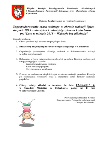 Miejska Komisja Rozwiązywania Problemów Alkoholowych i Przeciwdziałania Narkomanii działająca przy Burmistrzu Miasta Człuchowa Ogłasza konkurs ofert na realizację zadania : Zagospodarowanie czasu wolnego w okresie wakacji lipiecsierpień 2015 r. dla dzieci i młodzieży z terenu Człuchowa pn.”Lato w mieście 2015 – Wakacje bez alkoholu” Warunki konkursu: 1. Oferta powinna być złożona na specjalnym druku. 2. Druk oferty znajduje się na stronie Urzędu Miejskiego w Człuchowie. 3. Organizacje pozarządowe składają wniosek o dofinansowanie wakacji w trybie małych dotacji 4. Dokonując wyboru najkorzystniejszych ofert powołana Komisja weźmie pod uwagę następujące kryteria: - Wartość merytoryczna projektu. - Koszt realizacji projektu . - Dotychczasową współpracę . 5. Z uwagi na zachowanie ciągłości zajęć w okresie wakacji, powołana Komisja po rozpatrzeniu wniosków wraz z oferentami ustali terminy realizacji projektów. 6. Oferty należy składać w terminie do dnia 12.06.2015 r. w Urzędzie Miejskim w Człuchowie, pokój nr 11 lub w sekretariacie Urzędu. Przewodnicząca Miejskiej Komisji Rozwiązywania Problemów Alkoholowych Grażyna Radziemska