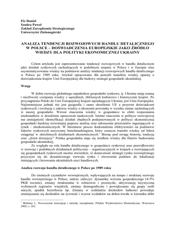 Fic Daniel Szudra Paweł Zakład Zarządzania Strategicznego Uniwersytet Zielonogórski ANALIZA TENDENCJI ROZWOJOWYCH HANDLU DETALICZNEGO W POLSCE – DOŚWIADCZENIA EUROPEJSKIE JAKO ŹRÓDŁO WIEDZY DLA POLITYKI EKONOMICZNEJ UKRAINY Celem artykułu jest zaprezentowanie tendencji rozwojowych w handlu detalicznym jako działań rynkowych zachodzących w podobnym stopniu w Polsce i w Europie oraz usystematyzowanie wiedzy na podstawie analizy tendencji rozwojowych handlu detalicznego w Polsce po 1989 roku. Artykuł opracowano dla potrzeb transferu wiedzy opartej o doświadczenia krajów Unii Europejskiej dla budowy strategii gospodarki ukraińskiej. Wstęp W dobie rozwoju globalnego najmłodsze gospodarki rynkowe, tj. Ukraina mają szansę i możliwość czerpania wiedzy z sąsiednich, zbliżonych kulturowo i historycznie krajów. Po przystąpieniu Polski do Unii Europejskiej krajem sąsiadującym Ukrainy jest Unia Europejska. Najistotniejsza jednak nie jest geografia i samo określenie UE a przyrost doświadczeń rynkowych i ewolucja z zakresu wiedzy o ekonomii powstałej w wyniku zmian zachodzących w naszej gospodarki. Wzrost znaczenia wiedzy w gospodarce to efekt rozpoznania niedostatków w dziedzinie opracowań naukowych. Istotne znaczenie w polityce rozwojowej ma umiejętność identyfikacji działań zbędnych podejmowanych w polityce ekonomicznej gospodarki bardziej rozwiniętej poprzez analizę oraz odrzucenie priorytetów ingerujących w rynek - nieekonomicznych. W literaturze proces doskonalenia efektywności na podstawie liderów rynkowych nazywamy benchmarkingiem, który oznacza transfer wiedzy od lidera osiągnięć w określonych działaniach ekonomicznych.1 Biorąc pod uwagę historię, tradycję oraz „dzień dzisiejszy” Polska gospodarka staje się źródłem wiedzy dla filarów budowania gospodarki ukraińskiej. Ze względu na rolę handlu detalicznego w gospodarce rynkowej oraz prawidłowości w rozwoju i podobnych działaniach polityczno – organizacyjnych w krajach o rozwijających się gospodarkach rynkowych można stwierdzić, iż skuteczność strategii rynku wewnętrznego przyczyni się do dynamicznego rozwoju rynku i stworzenia podstaw do lokalizacji istniejących i kreowania ukraińskich sieci handlowych. Analiza rozwoju handlu detalicznego w Polsce po 1989 roku Do istotnych czynników wewnętrznych, wpływających na tempo i strukturę rozwoju handlu wewnętrznego w Polsce, należy zaliczyć: dynamikę wzrostu gospodarczego (4-5% PKB rocznie), zmiany strukturalne w rolnictwie i przemyśle, aktywizację turystyczną wybranych regionów wiejskich, zmiany demograficzne i powiększanie się grupy osób starych, spadek bezrobocia itp. Zmiany w rozkładzie dochodów ludności powoduje zmniejszanie się dochodów na żywność i wyrost wydatków na dobra trwałe w kierunku dóbr 1 Brilman J., Nowoczesne koncepcje i metody zarządzania. Polskie Wydawnictwo Ekonomiczne, Warszawa 2002, s. 262. 42 Fic Daniel, Szudra Paweł luksusowych o wysokich jakości, będących dla niektórych grup dochodowych przejawem konsumpcji prestiżowej. Równolegle rośnie zapotrzebowanie na masową produkcję towarów, które spełniają wymogi nowoczesności, ale oferowane są po stosunkowo niskich cenach. Inna grupa czynników wewnętrznych, decydujących o rozwoju handlu wewnętrznego, dotyczy barier wynikających z aktualnego ukształtowania i pozycji polskich przedsiębiorstw handlowych na rynku. Powodują one nadmierne rozdrobnienie (dominująca pozycja małych sklepów i hurtowni), utrzymywanie tradycyjnych więzi dystrybucyjnych z wytwórcami, słabą kondycję finansową, (która nie pozwala na rozwój), bardzo niski poziom koncentracji organizacyjnej oraz znaczne opóźnienie w rozwoju infrastruktury technicznej. Ten ostatni czynnik jest pozostałością w polskim handlu z sytuacji sprzed 1990 roku. Jeśli do tego zespołu niekorzystnych uwarunkowań dodać trudności z uzyskaniem kredytów na rozwój małych i średnich firm, a także silny nacisk konkurencyjny firm reprezentujących kapitał zagraniczny, to staje się jasnym, że szybkie zmiany tego stanu są ograniczone.2 Stan obecny handlu detalicznego w Polsce jest wynikiem dynamiki dwóch zmiennych zaistniałych w polskim handlu tj. liczba przedsiębiorstw handlowych i liczba zatrudnionych w handlu (rysunek 1). Rysunek 1. Dynamika zmian strukturalnych handlu detalicznego w Polsce w latach 1989 2003 2003 1998 1989 0 500000 1000000 Liczba przedsiębiorstw 1500000 2000000 2500000 Liczba zatrudnionych Źródło: opracowanie własne na podstawie danych GUS. Zmiany w handlu detalicznym po roku 1989 przedstawiały się następująco: • zmiany w liczbie przedsiębiorstw handlowych Wzrost liczby sklepów z 120 000 (1989) do 450 000 (1998), spadek do 400 000 (2003). Na rynku pojawia się coraz więcej sklepów dyskontowych oraz innych wielkopowierzchniowych obiektów handlowych oraz galerii handlowych. 2 Strużycki M. Polski handel wewnętrzny na przełomie XX i XXI wieku – warunki i kierunki rozwoju. In: Warunki funkcjonowania i rozwoju handlu w Polsce pod red. A. Szromnika. Kraków: Akademia Ekonomiczna, 1998, s. 12. Analiza tendencji rozwojowych handlu detalicznego w Polsce – doświadczenia europejskie ... 43 • zmiany w zatrudnieniu w handlu detalicznym Wzrost zatrudnienia w handlu z 1300000 osób (1989) do 2000000 osób (1998) i 2028000 osób (2003).3 Modele rozwoju handlu detalicznego w Europie Według ocen ekspertów zagranicznych niektóre tendencje rozwoju handlu w Polsce przypominają model rozwoju handlu włoskiego oraz francusko – niemiecko - hiszpańskiego, lecz z okresów wcześniejszych, tj. przełomu lat 60. i 70.(Francja, Niemcy) oraz 80. i 90. (Włochy, Hiszpania).4 Porównanie cech dwóch modeli przedstawiono w tabeli 1. Tabela 1. Cechy modeli rozwoju handlu detalicznego Model francusko – niemiecko - hiszpański • motorem rozwoju handlu są ceny, • • różnice regionalne w rozwoju handlu, • loka