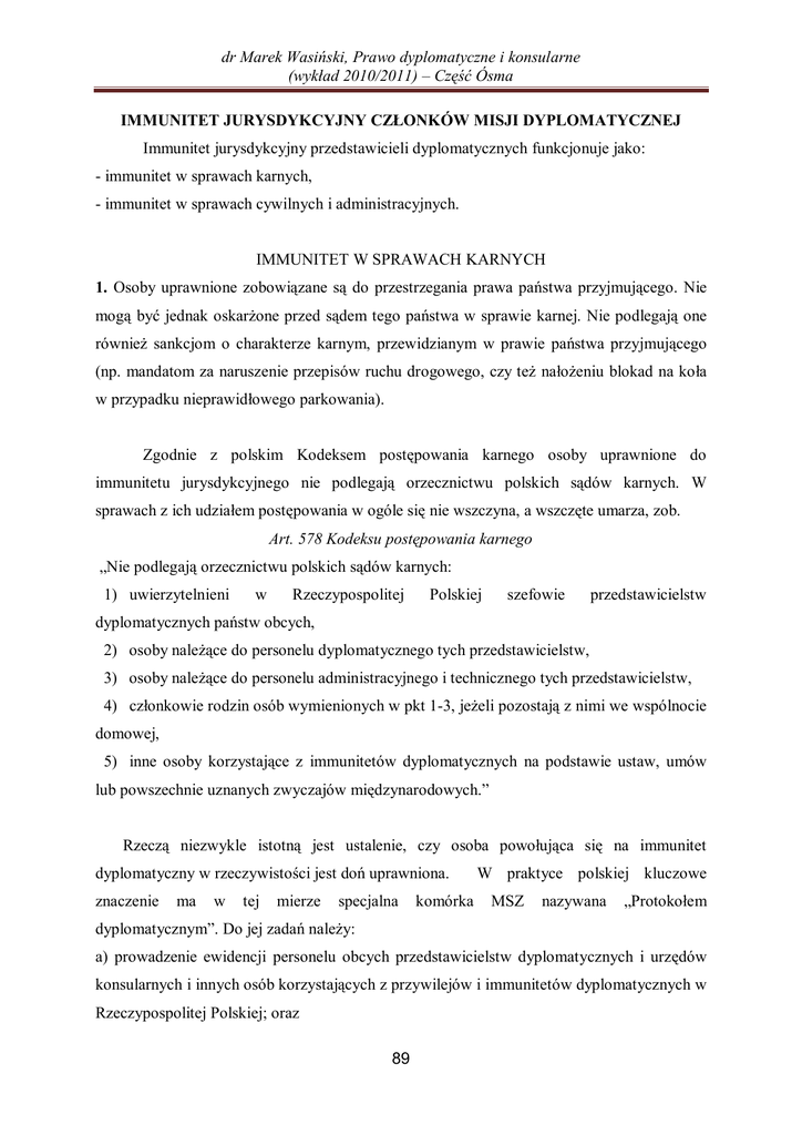dr Marek Wasiński, Prawo dyplomatyczne i konsularne (wykład 2010/2011) – Część Ósma IMMUNITET JURYSDYKCYJNY CZŁONKÓW MISJI DYPLOMATYCZNEJ Immunitet jurysdykcyjny przedstawicieli dyplomatycznych funkcjonuje jako: - immunitet w sprawach karnych, - immunitet w sprawach cywilnych i administracyjnych. IMMUNITET W SPRAWACH KARNYCH 1. Osoby uprawnione zobowiązane są do przestrzegania prawa państwa przyjmującego. Nie mogą być jednak oskarżone przed sądem tego państwa w sprawie karnej. Nie podlegają one również sankcjom o charakterze karnym, przewidzianym w prawie państwa przyjmującego (np. mandatom za naruszenie przepisów ruchu drogowego, czy też nałożeniu blokad na koła w przypadku nieprawidłowego parkowania). Zgodnie z polskim Kodeksem postępowania karnego osoby uprawnione do immunitetu jurysdykcyjnego nie podlegają orzecznictwu polskich sądów karnych. W sprawach z ich udziałem postępowania w ogóle się nie wszczyna, a wszczęte umarza, zob. Art. 578 Kodeksu postępowania karnego „Nie podlegają orzecznictwu polskich sądów karnych: 1) uwierzytelnieni w Rzeczypospolitej Polskiej szefowie przedstawicielstw dyplomatycznych państw obcych, 2) osoby należące do personelu dyplomatycznego tych przedstawicielstw, 3) osoby należące do personelu administracyjnego i technicznego tych przedstawicielstw, 4) członkowie rodzin osób wymienionych w pkt 1-3, jeżeli pozostają z nimi we wspólnocie domowej, 5) inne osoby korzystające z immunitetów dyplomatycznych na podstawie ustaw, umów lub powszechnie uznanych zwyczajów międzynarodowych.” Rzeczą niezwykle istotną jest ustalenie, czy osoba powołująca się na immunitet dyplomatyczny w rzeczywistości jest doń uprawniona. znaczenie ma w tej mierze specjalna komórka W praktyce polskiej kluczowe MSZ nazywana „Protokołem dyplomatycznym”. Do jej zadań należy: a) prowadzenie ewidencji personelu obcych przedstawicielstw dyplomatycznych i urzędów konsularnych i innych osób korzystających z przywilejów i immunitetów dyplomatycznych w Rzeczypospolitej Polskiej; oraz 89 dr Marek Wasiński, Prawo dyplomatyczne i konsularne (wykład 2010/2011) – Część Ósma b) potwierdzanie statusu prawnego osoby uprawnionej do przywilejów i immunitetów. 2. Immunitet ten jest immunitetem absolutnym, tzn. przysługuje uprawnionemu niezależnie od ciężaru naruszenia. 3. Gdy osoba uprawniona do powoływania się na immunitet łamie prawo państwa przyjmującego, to ostatnie może: a) zażądać od państwa wysyłającego uchylenia immunitetu. W przypadku uchylenia immunitetu naruszyciel będzie mógł być pociągnięty do odpowiedzialności karnej przed właściwym organem państwa przyjmującego. b) uznać naruszyciela za osobę niemile widzianą/niepożądaną; c) żądać od państwa wysyłającego osądzenia osoby uprawnionej do immunitetu we własnym zakresie. Państwo wysyłające nie ma jednak prawnomiędzynarodowego obowiązku w tej mierze. IMMUNITET DYPLOMATYCZNY W SPRAWACH CYWILNYCH I ADMINISTRACYJNYCH Zasadą jest, że osoba uprawniona nie podlega jurysdykcji cywilnej i administracyjnej państwa przyjmującego. Wskazana zasada nie dotyczy jednak trzech przypadków: 1. Immunitet nie przysługuje w przypadku skierowania przeciwko osobom objętym immunitetem powództw z zakresu prawa rzeczowego, które dotyczą prywatnego mienia nieruchomego położonego na terytorium państwa przyjmującego. → „Powództwa z zakresu prawa rzeczowego” (powództwa in rem) – są to powództwa, w ramach których dochodzi się skutecznych przeciwko wszystkim roszczeń związanych z prawami rzeczowymi (np. roszczeń dotyczących posiadania, prawa własności, czy ograniczonych praw rzeczowych, np. użytkowania wieczystego), np. Powództwo oparte o art. 222 polskiego Kodeksu cywilnego „(§ 1) Właściciel może żądać od osoby, która włada faktycznie jego rzeczą, ażeby rzecz została mu wydana, chyba że osobie tej przysługuje skuteczne względem właściciela uprawnienie do władania rzeczą; (§ 2) Przeciwko osobie, która narusza własność w inny 90 dr Marek Wasiński, Prawo dyplomatyczne i konsularne (wykład 2010/2011) – Część Ósma sposób aniżeli przez pozbawienie właściciela faktycznego władztwa nad rzeczą, przysługuje właścicielowi roszczenie o przywrócenie stanu zgodnego z prawem i o zaniechanie naruszeń.” § 1 – to tzw. roszczenie windykacyjne. Może z nim wystąpić właściciel nieruchomości np. przeciwko osobie, która jego nieruchomość bezprawnie zajmuje. § 2 – to tzw. roszczenie negatoryjne. Może z nim wystąpić właściciel nieruchomości np. przeciwko sąsiadowi, która bezprawnie składuje odpady na tej nieruchomości. Powództwo rzeczowe (in rem) winno być odróżnione od powództwa o charakterze osobistym (in personam). To ostatnie to, przykładowo, powództwo, w ramach którego na podstawie umowy (kontraktu) konkretny wierzyciel może domagać się od konkretnego dłużnika oznaczonego zachowania. Za „powództwo z zakresu prawa rzeczowego” nie jest natomiast uważane powództwo, w ramach którego powód dochodzi od pozwanego zapłaty czynszu (np. z tytułu umowy najmu nieruchomości). Powództwo takie wynika z kontraktu i skierowane jest przeciwko osobie dyplomaty (powództwo in personam). Dyplomatom przysługuje jednak immunitet nawet w przypadku powództw rzeczowych, jeżeli dotyczą one nieruchomości, nad którymi dyplomata sprawuje władztwo w imieniu państwa wysyłającego dla celów misji (np. jest administratorem budynku, w którym państwo wysyłające zamierza urządzić instytut kulturalny). Za taką nieruchomość nie jest jednak uznawana prywatna rezydencja dyplomaty. Dopuszczalne są zatem powództwa rzeczowe odnośnie prywatnych rezydencji dyplomatycznych (np. powództwo o eksmisję). 2. Immunitet nie przysługuje w przypadku powództw dotyczących spadkobrania, w których uprawniony występuje w charakterze osoby prywatnej, a nie w imieniu