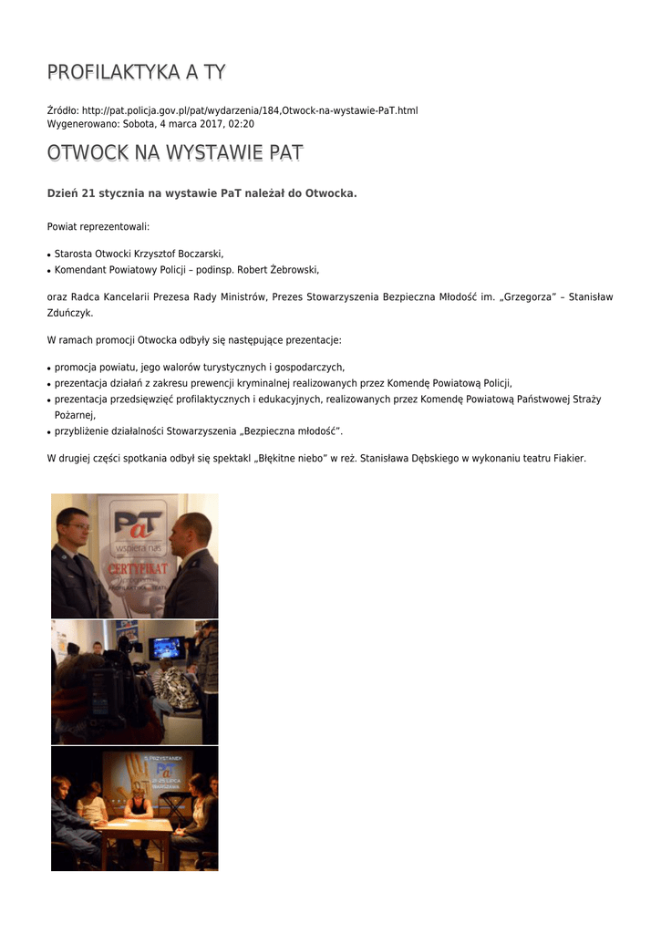 PROFILAKTYKA A TY Źródło: http://pat.policja.gov.pl/pat/wydarzenia/184,Otwock-na-wystawie-PaT.html Wygenerowano: Sobota, 4 marca 2017, 02:20 OTWOCK NA WYSTAWIE PAT Dzień 21 stycznia na wystawie PaT należał do Otwocka. Powiat reprezentowali: ● Starosta Otwocki Krzysztof Boczarski, ● Komendant Powiatowy Policji – podinsp. Robert Żebrowski, oraz Radca Kancelarii Prezesa Rady Ministrów, Prezes Stowarzyszenia Bezpieczna Młodość im. „Grzegorza” – Stanisław Zduńczyk. W ramach promocji Otwocka odbyły się następujące prezentacje: ● promocja powiatu, jego walorów turystycznych i gospodarczych, ● prezentacja działań z zakresu prewencji kryminalnej realizowanych przez Komendę Powiatową Policji, ● prezentacja przedsięwzięć profilaktycznych i edukacyjnych, realizowanych przez Komendę Powiatową Państwowej Straży Pożarnej, ● przybliżenie działalności Stowarzyszenia „Bezpieczna młodość”. W drugiej części spotkania odbył się spektakl „Błękitne niebo” w reż. Stanisława Dębskiego w wykonaniu teatru Fiakier. Ocena: 0/5 (0) Tweetnij