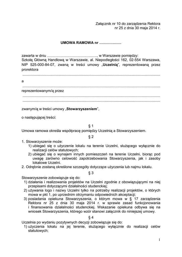 Załącznik nr 10 do zarządzenia Rektora nr 25 z dnia 30 maja 2014 r. UMOWA RAMOWA nr ……………… zawarta w dniu ……………………………….…., w Warszawie pomiędzy: Szkołą Główną Handlową w Warszawie, al. Niepodległości 162, 02-554 Warszawa, NIP 525-000-84-07, zwaną w treści umowy „Uczelnią”, reprezentowaną przez prorektora ...................................................................................................................................... a ...................................................................................................................................... reprezentowanym/ą przez ...................................................................................................................................... ...................................................................................................................................... zwanym/ą w treści umowy „Stowarzyszeniem”, o następującej treści: §1 Umowa ramowa określa współpracę pomiędzy Uczelnią a Stowarzyszeniem. §2 1. Stowarzyszenie moŜe: 1) ubiegać się o uŜyczenie lokalu na terenie Uczelni, słuŜącego wyłącznie do realizacji celów statutowych; 2) ubiegać się o wynajem innych pomieszczeń na terenie Uczelni, biorąc pod uwagę zarówno celowość zapotrzebowania Stowarzyszenia, jak i zasoby lokalowe Uczelni. 2. Odrębnie zostaną określone szczegóły dotyczące uŜyczenia lub najmu lokalu. §3 Stowarzyszenie zobowiązuje się do: 1) działania i realizowania projektów na Uczelni zgodnie z obowiązującymi na niej przepisami dotyczącymi działalności studenckiej; 2) uŜywania logo i nazwy Uczelni tylko na potrzeby realizacji projektów, o których mowa w pkt 1, po uprzednim otrzymaniu odpowiednich akceptacji; 3) posiadania opiekuna Stowarzyszenia, o którym mowa w § 17 zarządzenia Rektora nr 25 z dnia 30 maja 2014 r. w sprawie zasad funkcjonowania i finansowania działalności studenckiej. Wskazanie opiekuna odbywa się na wniosek Stowarzyszenia, którego wzór stanowi załącznik do niniejszej umowy. §4 Uczelnia po wydaniu pozytywnych decyzji zobowiązuje się do: 1) uŜyczenia lokalu na jej terenie, słuŜącego wyłącznie do realizacji celów statutowych; 1 2) wynajmu innych pomieszczeń na jej terenie, z uwzględnieniem moŜliwości lokalowych Uczelni. §5 1. KaŜda ze stron moŜe wypowiedzieć umowę zachowując 30 dniowy okres wypowiedzenia. 2. W przypadku niewypełnienia obowiązków określonych w zarządzeniu Rektora, o którym mowa w § 3 pkt 3 niniejszej umowy, Uczelnia ma prawo wypowiedzieć umowę w trybie natychmiastowym. §6 Wszelkie zmiany umowy mogą nastąpić za zgodą obu stron i wymagają formy pisemnej pod rygorem niewaŜności. §7 Umowa wchodzi w Ŝycie z chwilą podpisania jej przez ostatnią ze stron. §8 1. W sprawach nieuregulowanych niniejszą umową stosuje się odpowiednie przepisy Kodeksu cywilnego. 2. Spory mogące wynikać w związku z powyŜszą umową będzie rozstrzygał sąd powszechny właściwy dla siedziby Uczelni. §9 Umowę sporządzono w dwóch jednobrzmiących egzemplarzach, po jednym dla kaŜdej ze stron. ………………………… Stowarzyszenie …………………………. Uczelnia 2