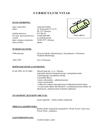 CURRICULUM VITAE DANE OSOBOWE: imię i nazwisko: adres: telefon domowy: tel. kom. grzecznościowy: e-mail: data i miejsce urodzenia: stan cywilny: Anna Kowalska ul. Kościuszki 67 m 23 00 -237 Olsztyn, 627-08-44 0-600 600 600 [email protected] 18.09.1977, Olsztyn panna Moje zdjęcie WYKSZTAŁCENIE: 1998-obecnie Wyższa Szkoła Administracji i Zarządzania w Olsztynie Wydział Marketingu 1993-1997 LO w Olsztynie DOŚWIADCZENIE ZAWODOWE: 01.09.1999 -01.01.2002 MicroComp Sp. z o.o., Olsztyn (sprzedaż sprzętu komputerowego i oprogramowania wspierającego zarządzanie firmą) Asystentka Biura • prace sekretarsko - administracyjne • prace asystenckie • całkowity nadzór nad poprawnym funkcjonowaniem biura • wystawianie faktur dla klientów i ewidencjonowanie faktur od dostawców, nadzorowanie terminów płatności ZNAJOMOŚĆ JĘZYKÓW OBCYCH: język angielski – bardzo dobra znajomość OBSŁUGA KOMPUTERA Bardzo dobra znajomość programów: Word, Excel, Lotus otes; Power Point - podstawy ZAINTERESOWANIA wystrój wnętrz, sport