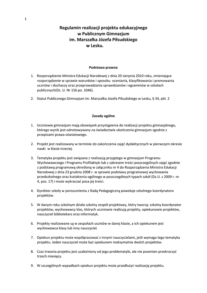 1 Regulamin realizacji projektu edukacyjnego w Publicznym Gimnazjum im. Marszałka Józefa Piłsudskiego w Lesku. Podstawa prawna 1. Rozporządzenie Ministra Edukacji Narodowej z dnia 20 sierpnia 2010 roku, zmieniające rozporządzenie w sprawie warunków i sposobu oceniania, klasyfikowania i promowania uczniów i słuchaczy oraz przeprowadzania sprawdzianów i egzaminów w szkołach publicznych(Dz. U. Nr 156 po. 1046). 2. Statut Publicznego Gimnazjum im. Marszałka Józefa Piłsudskiego w Lesku, § 34, pkt. 2 Zasady ogólne 1. Uczniowie gimnazjum mają obowiązek przystąpienia do realizacji projektu gimnazjalnego, którego wynik jest odnotowywany na świadectwie ukooczenia gimnazjum zgodnie z przepisami prawa oświatowego. 2. Projekt jest realizowany w terminie do zakooczenia zajęd dydaktycznych w pierwszym okresie nauki w klasie trzeciej. 3. Tematyka projektu jest związana z realizacją przyjętego w gimnazjum Programu Wychowawczego i Programu Profilaktyki lub z zakresem treści poszczególnych zajęd zgodnie z podstawą programową określoną w załączniku nr 4 do Rozporządzenia Ministra Edukacji Narodowej z dnia 23 grudnia 2008 r. w sprawie podstawy programowej wychowania przedszkolnego oraz kształcenia ogólnego w poszczególnych typach szkół (Dz.U. z 2009 r. nr 4, poz. 17) i może wykraczad poza jej treści. 4. Dyrektor szkoły w porozumieniu z Radą Pedagogiczną powołuje szkolnego koordynatora projektów. 5. W danym roku szkolnym działa szkolny zespół projektowy, który tworzą: szkolny koordynator projektów, wychowawcy klas, których uczniowie realizują projekty, opiekunowie projektów, nauczyciel bibliotekarz oraz informatyk. 6. Projekty realizowane są w zespołach uczniów w danej klasie, a ich opiekunem jest wychowawca klasy lub inny nauczyciel. 7. Opiekun projektu może współpracowad z innymi nauczycielami, jeśli wymaga tego tematyka projektu. Jeden nauczyciel może byd opiekunem maksymalnie dwóch projektów. 8. Czas trwania projektu jest uzależniony od jego problematyki, ale nie powinien przekroczyd trzech miesięcy. 9. W szczególnych wypadkach opiekun projektu może przedłużyd realizację projektu. 2 Zadania szkolnego koordynatora projektów 1. Koordynacja pracy szkolnego zespołu projektowego; 2. Zebranie od nauczycieli propozycji tematów projektów, sporządzenie ich listy zbiorczej, przedstawienie dyrektorowi szkoły i radzie pedagogicznej oraz upowszechnienie w sposób przyjęty w szkole; 3. Monitorowanie stanu realizacji projektów; 4. Upowszechnienie informacji na temat realizowanych projektów; 5. Organizacja publicznej prezentacji projektów we współpracy z dyrektorem szkoły i zespołem projektowym; 6. Podsumowanie realizacji projektów i przedstawienie Radzie Pedagogicznej sprawozdania zbiorczego na koniec roku szkolnego. 7. Gromadzenie i ewidencja najlepszych efektów pracy grup projektowych, np. prezentacji multimedialnych, folderów, makiet, dokumentów – w bibliotece szkolnej i za zgodą autorów prac. Zadania wychowawcy klasy, której uczniowie realizują projekt 1. Poinformowanie rodziców o warunkach realizacji projektu edukacyjnego – na spotkaniu po I okresie nauki w klasie drugiej i ponownie na początku roku szkolnego w klasie trzeciej; 2. Podział klasy na grupy projektowe wg wybranych przez uczniów tematów – od 3 do 5 uczniów w grupie. Przydzielenie tematów dla poszczególnych grup zgodnie z zainteresowaniami uczniów - do kooca maja danego roku szkolnego; 3. Monitorowanie w czasie godzin z wychowawcą stopnia realizacji projektów, obowiązkowości i zaangażowania uczniów; 4. Współpraca z nauczycielami - opiekunami projektów. Zadania opiekuna projektu 1. Przygotowanie propozycji tematów projektów wraz z celami i określonym problemem oraz z uwzględnieniem ewentualnych propozycji uczniów i przekazanie szkolnemu koordynatorowido kooca kwietnia danego roku szkolnego; 2. Zorganizowanie spotkania z uczniami w celu zapoznania i wprowadzenia w tematykę projektów. Ustalenie i omówienie wspólnie z uczniami celu projektu oraz problemu, który porusza projekt oraz przygotowanie harmonogramu wymaganego podczas realizacji projektu. Opracowanie i przedstawienie kryteriów oceny projektu – do kooca września; 3 3. Opieka nad zespołem podczas realizacji projektu, udzielanie wsparcia i konsultacji, a także bieżące monitorowanie pracy zespołu, dokonanie oceny pracy każdego członka zespołu po zakooczeniu projektu; 4. Uzupełnianie niezbędnej dokumentacji, która będzie wymagana podczas realizacji projektu. Przygotowanie grupy do prezentacji projektu. Zadania uczniów realizujących projekt 1. Wybór tematyki projektu po zapoznaniu się z celami i problematyką – ofertą przedstawioną przez wychowawcę klasy i nauczycieli. Uczeo wybiera dwa lub trzy tematy projektów; 2. Wspólnie z opiekunem projektu omówienie i ustalenie zasad współpracy w realizacji projektu, podziału zadao w zespole; 3. Czynne uczestniczenie w realizacji projektu i wywiązywanie się z podjętych i wyznaczonych zadao; 4. Udział w publicznej prezentacji projektu po jego zakooczeniu w terminie uzgodnionym z opiekunem projektu. Realizacja projektów 1. Projekty są realizowane na zasadach określonych przez opiekuna oraz po rozpatrzeniu uwag uczniów biorących w nich udział. 2. Dyrektor zapewnia i stwarza warunki do realizacji projektu w ramach posiadanych środków. 3. Uczniowie mogą korzystad z pomieszczeo szkoły do celów związanych z realizacją projektu w godzinach jej pracy wyłącznie pod opieką opiekuna lub innych nauczycieli. Zakooczenie projektu i prezentacja 1. Projekt kooczy publiczna prezentacja, której ramy oraz termin winny byd określone przez opiekuna projektu w porozumieniu ze szkolnym koordynatorem projektu i z dyrektorem gimnazjum. 2. Miejsce i termin prezentacji powinien zapewnid możliwie najszerszy udział w niej uczniom, rodzicom oraz innym uczestnikom i zaproszonym gościom. 3. Gimnazjum w ramach posia