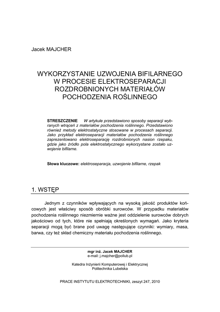 Jacek MAJCHER WYKORZYSTANIE UZWOJENIA BIFILARNEGO W PROCESIE ELEKTROSEPARACJI ROZDROBNIONYCH MATERIAŁÓW POCHODZENIA ROŚLINNEGO STRESZCZENIE W artykule przedstawiono sposoby separacji wybranych wtrąceń z materiałów pochodzenia roślinnego. Przedstawiono również metody elektrostatyczne stosowane w procesach separacji. Jako przykład elektroseparacji materiałów pochodzenia roślinnego zaprezentowano elektroseparację rozdrobnionych nasion rzepaku, gdzie jako źródło pola elektrostatycznego wykorzystane zostało uzwojenie bifilarne. Słowa kluczowe: elektroseparacja, uzwojenie bifilarne, rzepak 1. WSTĘP Jednym z czynników wpływających na wysoką jakość produktów końcowych jest właściwy sposób obróbki surowców. W przypadku materiałów pochodzenia roślinnego niezmiernie ważne jest oddzielenie surowców dobrych jakościowo od tych, które nie spełniają określonych wymagań. Jako kryteria separacji mogą być brane pod uwagę następujące czynniki: wymiary, masa, barwa, czy też skład chemiczny materiału pochodzenia roślinnego. mgr inż. Jacek MAJCHER e-mail: [email protected] Katedra Inżynierii Komputerowej i Elektrycznej Politechnika Lubelska PRACE INSTYTUTU ELEKTROTECHNIKI, zeszyt 247, 2010 118 J. Majcher Jednym ze sposobów separacji materiału roślinnego pod względem wymiarów jest zastosowanie sit. Materiał nieposiadający określonych wymiarów wpada przez oczka sit, a materiał spełniający kryteria ślizga się po sitach. Inną metodą separacji materiałów pochodzenia roślinnego jest separacja pod względem masy. Do tego celu wykorzystywane są urządzenia, w których czynnikiem separującym jest wymuszony strumień powietrza (rys. 1). Rys. 1. Schemat budowy i działania separatora pneumatycznego: 1 – wlot powietrza, 2 – wylot powietrza i drobnych zanieczyszczeń, 3 – kierunek wylotu ziarna, 4 – wylot ziaren poszeregowanych względem masy, 5 – zasuwa, 6 – podajnik Materiał trafia z podajnika na strumień powietrza, którym jest przenoszony w kierunku wylotu. Cząstki cięższe pod wpływem siły grawitacji spadają wcześniej, natomiast lżejsze później. Można tak dobrać siłę strumienia powietrza, jak również ilość podawanego materiału, aby materiał poszeregować według pożądanej masy. Najlżejsze cząstki oraz drobne zanieczyszczenia są wydmuchiwane poza separator. Kolejną cechą rozdzielczą materiałów może być kolor. Na podstawie tej cechy możemy rozróżnić materiał o jednakowych wymiarach i masie różniących się od pozostałych barwą. W tym przypadku możemy np. rozdzielić ziarna niedojrzałe od dojrzałych. Przykład separatora rozróżniającego pod względem barwy materiał przedstawiono na rysunku 2. 2 3 4 1 Rys. 2. Schemat działania pneumatycznego sortownika fotokomórkowego [1]: 1 – sprężone powietrze, 2 – kolorowe tło, 3 – fotokomórka, 4 – optyczna komora Wykorzystanie uzwojenia bifilarnego w procesie elektroseparacji rozdrobnionych… 119 Gdy materiał przemieszcza się obok fotokomórki, następuje pomiar odbitego światła od powierzchni każdej jednostki surowca. Sygnał ten jest porównywalny z nastawionym sygnałem wzorcowym i jeśli nie spełnia określonych kryteriów zostaje uruchomiony strumień powietrza, który wyrzuca cząstki wybrakowane od tych, które spełniają kryteria. Wadą tego separatora jest mała wydajność, ponieważ materiał musi przemieszczać się nad fotokomórką pojedynczo. Innym czynnikiem separacji jest wilgotność materiału. Taką separację wykorzystano w przypadku oddzielenia liści od ogonków herbaty (rys. 3). Rys. 3. Schemat budowy i działania separatora elektrostatycznego do oddzielania liści i ogonków herbaty [3]: 1 – podajnik, 2 – wysokonapięciowe elektrody, 3 – bębny, 4 – zasilacz WN, 5 – liście herbaty, 6 – ogonki herbaty W procesie separacji wykorzystuje się niewielką różnicę wilgotności liści i ogonków herbaty, a tym samym różnice w ich przewodnictwie elektrycznym i przenikalności elektrycznej. Najlepsze rezultaty osiąga się przy wilgotności mieszaniny około 7% [2]. 2. CHARAKTERYSTYKA MATERIAŁU BADANEGO Rzepak jest jedną z najważniejszych roślin oleistych w Polsce. Jak wynika z danych za 2008 r., udział rzepaku w strukturze zasiewu wynosi około 7%. Przy rocznej produkcji około 1 mln ton nasion uzyskuje się ok. 400 tys. ton oleju i 600 tys. ton śruty o wysokiej zawartości białka dobrej jakości. Skład chemiczny suchej masy nasion jest ściśle związany z ich przynależnością gatunkową, odmianową i zależy przede wszystkim od czynników genetycznych [4]. Jednym z czynników ograniczającym wykorzystanie śruty jest wysoka zawartość skład- 120 J. Majcher ników niestrawnych, tzw. włókna pokarmowego. Włókno obniża zarówno wartość energetyczną paszy, jak też wykorzystanie składników pokarmowych – – głównie białka. Głównym składnikiem włókna są ligniny, celuloza, hemiceluloza (grupa heterogennych polisacharydów zawierających cukry neutralne) oraz pektyny zawierające kwasy uronowe. Okrywa nasienna jest morfologiczną częścią nasiona zawierającą najwięcej włókna i najmniej tłuszczu oraz białek [5]. Do badań wykorzystano rozdrobnione nasiona rzepaku wczesno średniej odmiany Bazyl. Materiał rozdrobniono na kruszarce walcowej celem oddzielenia łupiny od zarodka. Rys. 4. Łupina i zarodek rzepaku odmiany Bazyl Celem badań było odseparowanie wybranych wtrąceń z nasion rzepaku. Głównym wtrąceniem, które starano się wyeliminować była łupina nasion rzepaku. W tabeli 1 przedstawiono skład chemiczny łupiny oraz zarodka dwu różnych odmian rzepaku. TABELA 1 Skład chemiczny łupiny oraz zarodka nasion rzepaku odmiany Mar i Polo [4] Odmiana Cechy Sucha masa [%] Tłuszcz [% sm.] Białko ogółem [% smb.] Mar łupina 90,2 5,9 zarodek 93,5 57,9 łupina 91 5,9 Polo zarodek 94,4 56,6 14,1 44,3 15,6 44 38,5 6,4 39,4 6,6 Glukozynolany [μM/1g smb