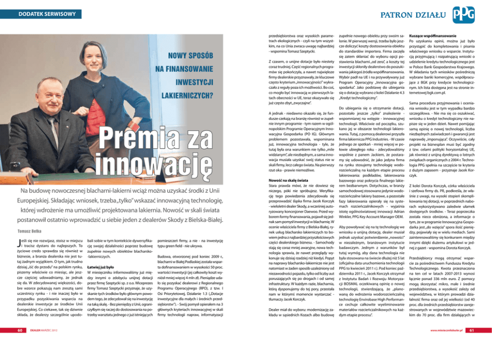 PATRON DZIAŁU DODATEK SERWISOWY NOWY SPOSÓB NA FINANSOWANIE INWESTYCJI LAKIERNICZYCH? Premia za innowację Na budowę nowoczesnej blacharni-lakierni wciąż można uzyskać środki z Unii Europejskiej. Składając wniosek, trzeba „tylko” wskazać innowacyjną technologię, której wdrożenie ma umożliwić projektowana lakiernia. Nowość w skali świata postanowił ostatnio wprowadzić u siebie jeden z dealerów Skody z Bielska-Białej. Tomasz Betka J eśli się nie rozwijasz, stoisz w miejscu i tracisz dystans do najlepszych. To życiowe credo sprawdza się również w biznesie, a branża dealerska nie jest tutaj żadnym wyjątkiem. O tym, jak trudno dzisiaj „iść do przodu” na polskim rynku, piszemy właściwie co miesiąc, ale jeszcze częściej udowadniamy, że jednak się da. W zdecydowanej większości, dobre wzorce pokazują nam zresztą sami uczestnicy rynku - i nie inaczej było w przypadku pozyskiwania wsparcia na dealerskie inwestycje ze środków Unii Europejskiej. Co ciekawe, tak się dziwnie składa, że dealerzy szczególnie upodo- 60 DEALER MARZEC 2012 bali sobie w tym kontekście dywersyfikację swojej działalności poprzez budowę zupełnie nowych obiektów blacharsko-lakierniczych. Łatwiej już było W miesięczniku informowaliśmy już między innymi o zdobyciu unijnej dotacji przez firmę Szeptycki sp. z o.o. Wiceprezes firmy Tomasz Szeptycki przyznaje, że uzyskanie tych środków było głównym powodem tego, że zdecydował się na inwestycję na taką skalę. - Bez pieniędzy z Unii, ograniczyłbym się raczej do dostosowania na potrzeby warsztatu jednego z już istniejących pomieszczeń firmy, a nie - na inwestycję typu green field - nie ukrywa. Budowa, otworzonej pod koniec 2009 r., blacharni w Białej Podlaskiej została wsparta dofinansowaniem w wysokości 50 proc. wartości inwestycji (jej całkowity koszt wyniósł mniej więcej 4 mln zł). Pieniądze udało się pozyskać dealerowi z Regionalnego Programu Operacyjnego (RPO), z tzw. I Osi Priorytetowej, Działanie 1.3 („Dotacje inwestycyjne dla małych i średnich przedsiębiorstw”). - Swój pomysł opierałem na 3 głównych kryteriach: innowacyjnej w skali firmy technologii napraw, informatyzacji przedsiębiorstwa oraz wysokich parametrach ekologicznych - czyli na tym wszystkim, na co Unia zwraca uwagę najbardziej - wspomina Tomasz Szeptycki. Z czasem, o unijne dotacje było niestety coraz trudniej. Część regionalnych programów się pokończyła, a nawet największe firmy dealerskie przyznawały, że kluczowe często kryterium „innowacyjności” wykraczało z reguły poza ich możliwości. Bo coś, co mogło być innowacją w pierwszych latach obecności w UE, teraz okazywało się już często zbyt „zwyczajne”. A jednak - niedawno okazało się, że fundusze czekają na branżę również w zupełnie innym programie - tym razem w ogólnopolskim Programie Operacyjnym Innowacyjna Gospodarka (PO IG). Głównym problemem pozostawała, wspominana już, innowacyjna technologia - tyle, że tutaj była ona warunkiem nie tylko „mile widzianym”, ale niezbędnym, a sama innowacja musiała uzyskać swój status nie w skali firmy, lecz całego świata. Na pierwszy rzut oka - prawie niemożliwe. Nowość na skalę świata Stara prawda mówi, że nie dowiesz się niczego, póki nie spróbujesz. Weryfikację tego powiedzenia zdecydowała się przeprowadzić śląska firma Jacek Korczyk - wieloletni dealer Skody, a wcześniej autoryzowany koncesjoner Daewoo. Przed wyborem formy finansowania, pojawił się jednak sam pomysł inwestycji w blacharnię. W ocenie właściciela firmy z Bielska-Białej, rynek usług blacharsko lakierniczych to bowiem jedna z najbardziej przyszłościowych części dealerskiego biznesu. - Samochody stają się coraz mniej awaryjne, nowa technologia sprawia, że nawet przeglądy wykonuje się dzisiaj rzadziej niż kiedyś. Popyt na naprawy blacharsko-lakiernicze nie jest natomiast w żaden sposób uzależniony od niezawodności pojazdu, tylko od liczby aut poruszających się po drogach i od samej infrastruktury. W każdym razie, blacharnia, którą dysponujemy do tej pory, przestała nam w którymś momencie wystarczać tłumaczy Jacek Korczyk. Dealer miał do wyboru: modernizację zakładu w sąsiednich Kozach albo budowę zupełnie nowego obiektu przy swoim salonie. W pierwszej wersji, trzeba było jeszcze doliczyć koszty dostosowania obiektu do standardów importera. Firma zaczęła się zatem skłaniać do wyboru opcji postawienia blacharni „od zera”, a koszty tej inwestycji skłoniły dealerstwo do poszukiwania jakiegoś źródła współfinansowania. Wybór padł na UE i na przywoływany już Program Operacyjny „Innowacyjna gospodarka”. Jako podstawę do ubiegania się o dotację wybrano z kolei Działanie 4.3 „Kredyt technologiczny”. Do ubiegania się o otrzymanie dotacji, pozostało jeszcze „tylko” znalezienie wspomnianej na wstępie - innowacyjnej technologii. Właściwie od początku, szukano jej w obszarze technologii lakierowania. Tutaj, z pomocą dealerowi przyszła firma lakiernicza PPG Industries. - W czasie jednego ze spotkań - mniej więcej w połowie ubiegłego roku - zdecydowaliśmy wspólnie z panem Jackiem, że postaramy się udowodnić, że jako jedyna firma na rynku stosujemy technologię wodorozcieńczalną na każdym etapie procesu lakierowania: podkładów, lakierowania bazowego oraz pokrycia finalnego lakierem bezbarwnym. Dotychczas, w branży samochodowej stosowano jedynie wodorozcieńczalne lakiery bazowe, a pozostałe fazy lakierowania opierały się na systemach rozcieńczalnikowych - wyjaśnia istotę ogólnoświatowej innowacji Adrian Winkler, PPG Key Account Manager OEM. Aby powoływać się na tę technologię we wniosku o unijną dotację, dealer musiał jednak uzyskać potwierdzenie „nowości” w niezależnym, branżowym instytucie badawczym. Jednym z warunków był tutaj wymóg, aby dana technologia ni
