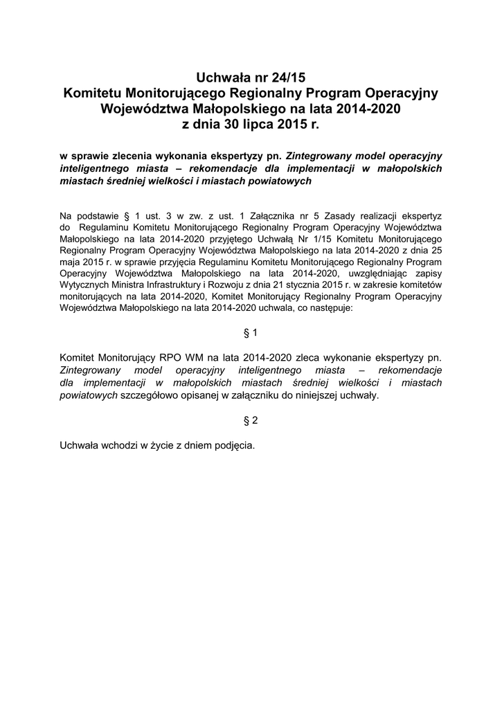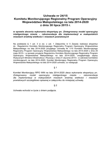Uchwała nr 24/15 Komitetu Monitorującego Regionalny Program Operacyjny Województwa Małopolskiego na lata 2014-2020 z dnia 30 lipca 2015 r. w sprawie zlecenia wykonania ekspertyzy pn. Zintegrowany model operacyjny inteligentnego miasta – rekomendacje dla implementacji w małopolskich miastach średniej wielkości i miastach powiatowych Na podstawie § 1 ust. 3 w zw. z ust. 1 Załącznika nr 5 Zasady realizacji ekspertyz do Regulaminu Komitetu Monitorującego Regionalny Program Operacyjny Województwa Małopolskiego na lata 2014-2020 przyjętego Uchwałą Nr 1/15 Komitetu Monitorującego Regionalny Program Operacyjny Województwa Małopolskiego na lata 2014-2020 z dnia 25 maja 2015 r. w sprawie przyjęcia Regulaminu Komitetu Monitorującego Regionalny Program Operacyjny Województwa Małopolskiego na lata 2014-2020, uwzględniając zapisy Wytycznych Ministra Infrastruktury i Rozwoju z dnia 21 stycznia 2015 r. w zakresie komitetów monitorujących na lata 2014-2020, Komitet Monitorujący Regionalny Program Operacyjny Województwa Małopolskiego na lata 2014-2020 uchwala, co następuje: §1 Komitet Monitorujący RPO WM na lata 2014-2020 zleca wykonanie ekspertyzy pn. Zintegrowany model operacyjny inteligentnego miasta – rekomendacje dla implementacji w małopolskich miastach średniej wielkości i miastach powiatowych szczegółowo opisanej w załączniku do niniejszej uchwały. §2 Uchwała wchodzi w życie z dniem podjęcia. Uzasadnienie Zasady realizacji ekspertyz określone są w Załączniku nr 5 do Regulaminu Komitetu Monitorującego Regionalny Program Operacyjny Województwa Małopolskiego z dnia 25 maja 2015 r. Zgodnie z § 9 ust. 3 lit. e) Regulaminu, członek/zastępca lub obserwator może wystąpić do Przewodniczącego z wnioskiem o zalecenie za pośrednictwem Sekretariatu (na podstawie uchwały Komitetu lub stanowiska grupy roboczej) wykonania ekspertyzy na potrzeby prac Komitetu/ lub grupy roboczej. Podstawa wnioskowania o zlecenie wykonania ekspertyzy jest uchwała Komitetu, podejmowana zgodnie z § 5 Regulaminu lub stanowisko grupy roboczej wyrażane zgodnie z § 7 Regulaminu, które wymaga akceptacji Przewodniczącego. Uchwała Komitetu lub stanowisko grupy roboczej musi zawierać minimum następujące informacje: a) nazwa ekspertyzy b) określenie obszaru badawczego c) cel główny ekspertyzy d) zakres czasowy wykonania ekspertyzy Na podstawie uchwały Komitetu lub stanowiska grupy roboczej, Sekretariat koordynuje wykonanie danej ekspertyzy. Członkowie/zastępcy i obserwatorzy są włączani w prace związane z wykonaniem ekspertyzy. Sekretariat w celu wykonania ekspertyzy przygotowuje dokumentację, przeprowadza procedurę wyboru wykonawcy, dokonuje jego wyboru i koordynuje zawarcie umowy pomiędzy IZ RPO WM a wykonawcą. Sekretariat może w umowie zawieranej pomiędzy IZ RPO WM a wykonawca ekspertyzy wskazać członka, zastępcę lub obserwatora właściwego dla obszaru realizowanej ekspertyzy, jaka osobę upoważnioną do kontaktów z wykonawcą w uzgodnionym zakresie. Po otrzymaniu ekspertyzy jest ona przedstawiana na najbliższym posiedzeniu Komitetu. Z wnioskiem o wykonanie ekspertyzy zwrócił się Członek Komitetu Pan Roman Ciepiela – Prezydent Miasta Tarnowa reprezentujący w Komitecie Gminę Miejską Tarnów. Celem ekspertyzy jest opracowanie zbioru rekomendacji dla wdrażania w małopolskich miastach średniej wielkości i miastach powiatowych zintegrowanego modelu operacyjnego, umożliwiającego, dzięki użyciu technologii ICT integrację systemów fizycznych, cyfrowych i ludzkich, inteligentny i zrównoważony rozwój miasta oraz wzrost jakości życia obywateli. Przewodniczący Komitetu wydał zgodę na wykonanie przedstawionej ekspertyzy Zintegrowany model operacyjny inteligentnego miasta – rekomendacje dla implementacji w małopolskich miastach średniej wielkości i miastach powiatowych, a Komitet Monitorujący RPO WM zlecił jej wykonanie. Załącznik do Uchwały Nr 24/15 Komitetu Monitorującego RPO WM na lata 2014-2020 z dnia 30 lipca 2015 r. Nazwa ekspertyzy Zintegrowany model operacyjny inteligentnego miasta – rekomendacje dla implementacji w małopolskich miastach średniej wielkości i miastach powiatowych Cel główny ekspertyzy Opracowanie zbioru rekomendacji dla wdrażania w małopolskich miastach średniej wielkości i miastach powiatowych zintegrowanego modelu operacyjnego, umożliwiającego, dzięki użyciu technologii ICT integrację systemów fizycznych, cyfrowych i ludzkich, inteligentny i zrównoważony rozwój miasta oraz wzrost jakości życia obywateli. Proponowany zakres badawczy Zakres badania: 1. Analiza strategii rozwoju małopolskich miast średniej wielkości i miast powiatowych pod kątem możliwości stosowania rozwiązań inteligentnego miasta 2. Identyfikacja narzędzi umożliwiających badanie społeczno- gospodarczych potrzeb mieszkańców i przedsiębiorców oraz ich włączanie w zarządzanie procesami w miastach 3. Analiza możliwości organizacji zarządzania danymi miejskimi i zapewnienia do nich otwartego dostępu, by wspierały procesy decyzyjne i stymulowały rozwój przedsiębiorczości 4. Ocena potencjału wykorzystania infrastruktury i systemów miejskich w celu efektywnego wspomagania usług publicznych 5. Analiza możliwości wypracowania zestawu wskaźników dla monitorowania inteligentnego rozwoju miasta i wspierania strategicznego zarządzania miastem 6. Zbadanie możliwości wprowadzenia dodatkowych funkcjonalności i integracji kart miejskich Zakres terytorialny: Małopolskie miasta średniej wielkości: Tarnów, Nowy Sącz, Oświęcim, Chrzanów, Olkusz, Nowy Targ Miasta powiatowe województwa małopolskiego Zakres przedmiotowy: 1. Możliwości stosowania rozwiązań inteligentnego miasta przy wdrażaniu strategii rozwoju małopolskich miast średniej wielkości – rekomendacje 2. Diagnoza punktu wyjścia – metodyka: a. inwentaryzacji istniejących i projektowanych (będących w trakcie 