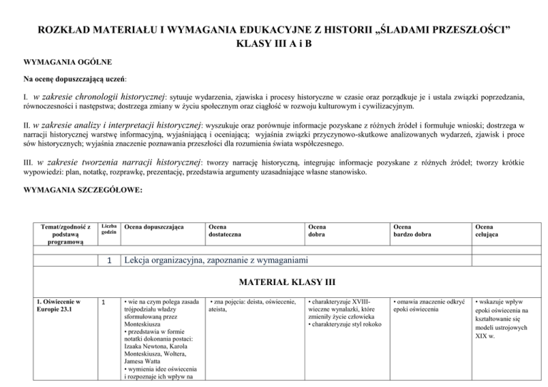 ROZKŁAD MATERIAŁU I WYMAGANIA EDUKACYJNE Z HISTORII „ŚLADAMI PRZESZŁOŚCI” KLASY III A i B WYMAGANIA OGÓLNE Na ocenę dopuszczającą uczeń: I. w zakresie chronologii historycznej: sytuuje wydarzenia, zjawiska i procesy historyczne w czasie oraz porządkuje je i ustala związki poprzedzania, równoczesności i następstwa; dostrzega zmiany w życiu społecznym oraz ciągłość w rozwoju kulturowym i cywilizacyjnym. II. w zakresie analizy i interpretacji historycznej: wyszukuje oraz porównuje informacje pozyskane z różnych źródeł i formułuje wnioski; dostrzega w narracji historycznej warstwę informacyjną, wyjaśniającą i oceniającą; wyjaśnia związki przyczynowo-skutkowe analizowanych wydarzeń, zjawisk i proce sów historycznych; wyjaśnia znaczenie poznawania przeszłości dla rozumienia świata współczesnego. III. w zakresie tworzenia narracji historycznej : tworzy narrację historyczną, integrując informacje pozyskane z różnych źródeł; tworzy krótkie wypowiedzi: plan, notatkę, rozprawkę, prezentację, przedstawia argumenty uzasadniające własne stanowisko. WYMAGANIA SZCZEGÓŁOWE: Temat/zgodność z podstawą programową Liczba godzin 1 Ocena dopuszczająca Ocena dostateczna Ocena dobra Ocena bardzo dobra Ocena celująca • omawia znaczenie odkryć epoki oświecenia • wskazuje wpływ epoki oświecenia na kształtowanie się modeli ustrojowych XIX w. Lekcja organizacyjna, zapoznanie z wymaganiami MATERIAŁ KLASY III 1. Oświecenie w Europie 23.1 1 • wie na czym polega zasada trójpodziału władzy sformułowaną przez Monteskiusza • przedstawia w formie notatki dokonania postaci: Izaaka Newtona, Karola Monteskiusza, Woltera, Jamesa Watta • wymienia idee oświecenia i rozpoznaje ich wpływ na • zna pojęcia: deista, oświecenie, ateista, • charakteryzuje XVIIIwieczne wynalazki, które zmieniły życie człowieka • charakteryzuje styl rokoko naukę, literaturę, filozofię, architekturę i sztukę 2. Nowe potęgi europejskie 23.2 1 wyszukuje w tekście informacje na temat reform oświeceniowych w Rosji, Austrii i Prusach, zapisuje je formie tabeli • zna postacie: Piotra I, Marii Teresy, Józefa II Fryderyka Wilhelma I, Fryderyka II • wskazuje na mapie Rosję, Prusy i monarchię austriacką • omawia przyczyny i skutki reform przeprowadzonych w Rosji, Prusach i Austrii 3. Rzeczpospolita za panowania Wettinów 24.1 24.2 1 poprawnie posługuje się terminami: wojna północna, Sejm Niemy • przedstawia dokonania postaci: Augusta II Mocnego, Augusta III Sasa, Stanisława Leszczyńskiego wskazuje na mapie zasięg terytorialny Rzeczypospolitej za panowania Sasów • na podstawie tekstu opisuje politykę wewnętrzną i zewnętrzną Wettinów wymienia przejawy ożywienia gospodarczego pod rządami Augusta III • wyjaśnia zmiany położenia międzynarodowego Rzeczypospolitej w XVIII w. 4. Ostatni król elekcyjny 27.1 5.Tajemnice sprzed wieków – Co przedstawia „Kołacz królewski”? 1 podaje lata wydarzeń: 1772 r. – pierwszy rozbiór Polski wskazuje na mapie zmiany terytorialne po I rozbiorze • poprawnie posługuje się terminami: Familia, konfederacja barska, sejm rozbiorowy, Rada Nieustająca , omawia okoliczności elekcji Stanisława Augusta Poniatowskiego • omawia reformy sejmu konwokacyjnego, kartkówka 6. Oświecenie w Rzeczypospolitej 24.3 26.1 26.4 7. Sejm Wielki 26.2 26.3 27.1 • przedstawia rolę: Tadeusza Rejtana, • wymienia przyczyny i skutki pierwszego rozbioru • ocenia znaczenie przeprowadzonych reform dla układu sił w Europie XVIII w. porównuje zmiany w Prusach, Rosji I Austrii z sytuacją w Polsce dokonuje oceny panowania Wettinów w Polsce analizuje wpływ ideologii oświecenia na powstanie państw absolutyzmu oświeconego • wyjaśnia, czy konfederacja barska była aktem buntu, czy też przejawem patriotyzmu jej uczestników • wyjaśnia, dlaczego I rozbiór Polski naruszył równowagę sił w Europie • samodzielnie ocenia działalność króla w latach 1764–1772 • wyjaśnia propagandową rolę rycin oraz działania państw zaborczych, • przedstawia dokonania postaci: Antoniego Tyzenhausa, Andrzeja Zamoyskiego, Adama Naruszewicza, Wojciecha Bogusławskiego, Franciszka Zabłockiego, Juliana Ursyna Niemcewicza, Marcella Bacciarellego • ocenia wkład Stanisława Augusta • wymienia przykłady sztuki klasycyzmu z uwzględnieniem własnego regionu • przedstawia dokonania postaci: Jana Dekerta, księcia • ocenia znaczenie reform Sejmu Czteroletniego • wskazuje elementy ideologii oświecenia, • podaje rok zawiązania konfederacji barskiej – 1768 r • dokonuje samodzielnej oceny znaczenia i następstw rządów Wettinów charakteryzuje stanowisko państw europejskich wobec pierwszego rozbioru Polski 1 wymienia okoliczności powstania, główne zadania i osiągnięcia Komisji Edukacji Narodowej • przedstawia dokonania postaci: Stanisława Konarskiego, Stanisława Leszczyńskiego, 1 • podaje lata wydarzeń: 1788–1792 – obrady Sejmu • opisuje projekty reform ustrojowych Stanisława Konarskiego i Stanisława Leszczyńskiego • dostrzega przejawy ożywienia w gospodarce i kulturze czasów saskich poprawnie posługuje się terminami: Collegium Nobilium, Szkoła Rycerska, Towarzystwo do Ksiąg Elementarnych, oświecenie stanisławowskie • poprawnie posługuje się terminami: Sejm Wielki, ustawa o 8. Upadek Rzeczypospolitej 27.1 27.2 27.3 Wielkiego, 1791 r. – uchwalenie Konstytucji 3 maja, 1793 r. – drugi rozbiór Polski • wymienia reformy Sejmu Wielkiego • omawia postanowienia Konstytucji 3 maja • wyjaśnia okoliczności zawiązania konfederacji targowickiej i ocenia jej następstwa • wskazuje na mapie zmiany terytorialne po drugim rozbiorze Rzeczypospolitej • podaje daty wydarzeń: 24 marca 1794 r. – wybuch powstania kościuszkowskiego, 1795 r. – trzeci rozbiór Rzeczypospolitej • wymienia cele i następstwa powstania kościuszkowskiego • wskazuje na mapi
