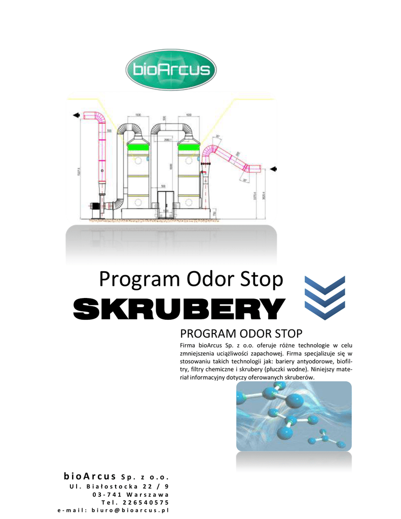 Program Odor Stop SKRUBERY PROGRAM ODOR STOP Firma bioArcus Sp. z o.o. oferuje różne technologie w celu zmniejszenia uciążliwości zapachowej. Firma specjalizuje się w stosowaniu takich technologii jak: bariery antyodorowe, biofiltry, filtry chemiczne i skrubery (płuczki wodne). Niniejszy materiał informacyjny dotyczy oferowanych skruberów. bioArcus Sp. z o.o. Ul. Białostocka 22 / 9 03-741 Warszawa Tel. 226540575 e-mail: [email protected] bioArcus® NAJLEPSZY i NAJPEWNIEJSZY PARTNER w skutecznym usuwaniu zapachów Nieustannie podwyższane są kwalifikacje pracowników. Nasi specjaliści są przygotowani do udzielenia wszelkich informacji w zakresie likwidacji uciążliwości zapachowej zarówno w sektorze komunalnym i przemysłowym. bioArcus® proponuje specjalistyczne urządzenia i produkty mające zastosowanie wszędzie tam gdzie istnieją problemy zapachowe. Swoją ofertę kierujemy także do organów administracji paostwowej, samorządów i organizacji społecznych zabiegających o szeroko pojętą poprawę jakości życia mieszkaoców w zakresie jakości powietrza. bioArcus® oferuje i realizuje projekty dotyczące emisji pochodzących z: przemysłowych procesów produkcyjnych, oczyszczalni ścieków, przepompowni ścieków, składowisk odpadów, zakładów utylizacyjnych, rolnictwa i hodowli zwierząt, restauracji i hoteli, oraz wszędzie tam gdzie występują źródła odorów. Nasze technologie są skuteczne, bezpieczne dla środowiska i uzasadnione ekonomicznie. W celu zmniejszenia uciążliwości zapachowej można wykorzystad różne technologie i urządzenia do oczyszczania gazów np. bariery antyodorowe, biofiltry, filtry chemiczne DKFIL® czy wreszcie skrubery (płuczki wodne). Oferowane przez bioArcus® wodne systemy oczyszczania gazów - skrubery, zaprojektowane jako wielostopniowe urządzenia z indywidualnie dobranymi parametrami oczyszczania są najprostszą i najbardziej niezawodną metodą oczyszczania gazów. Nasze skrubery gwarantują bardzo wysoką efektywnośd oczyszczania. Zakres ich działania obejmuje wszystkie związki chemiczne odpowiedzialne za powstawanie odczucia nieprzyjemnego zapachu oraz zanieczyszczenia pyłowe. Rozmiary urządzenia są dobierane zgodnie z wymaganiami, na podstawie szczegółowych informacji dot. przepływu i charakterystyki oczyszczanych gazów. W wielu przypadkach jest to najtaosze i najbardziej efektywne rozwiązanie problemu oczyszczania gazów powodujących uciążliwośd zapachową. Nasze skrubery działają efektywnie bez konieczności znacznych nakładów na drogie środki eksploatacyjne, nie wymagają częstego serwisowania, co ogranicza koszty utrzymania i konserwacji. Dysponujemy urządzeniami od 500 m3/h do 60.000 m3/h. ZASTOSOWANIE OCZYSZCZALNIE ŚCIEKÓW KOMUNALNYCH i PRZEMYSŁOWYCH, GOSPODARKA ODPADAMI i RECYKLING PRZEMYSŁ SPOŻYWCZY i RZETWÓRSTWO ŻYWNOŚCI, PRZEMYSŁ PASZOWY i HODOWLA ZWIERZĄT, PRZEMYSŁ CHEMICZNY. bioArcus Sp. z o.o. 2 bioArcus® przeznacza znaczne środki na badania i rozwój. Opracował swój własny Program ODOR STOP®. STOSOWANE TECHNOLOGIE Strona bioArcus® działa od 1992 roku, specjalizuje się w usuwaniu nieprzyjemnych zapachów. SKRUBER WODNY Opis urządzenia możliwe jest uzyskanie odpowiednich prędkości przepływu gazów (zgodnych z zakładanymi parametrami technologicznymi). Proces obniżania uciążliwości zapachowej składa się z dwóch etapów. Proces odmywania w przeciwprądzie jest prowadzony poprzez system dysz zapewniający maksymalną penetrację cieczy w przepływającym strumieniu gazów. Odpowiednio dobierane roztwory chemiczne (kwasów, zasad i utleniaczy) są w stanie oddziaływad na zjonizowane molekuły zanieczyszczeo znajdujące się w strumieniu gazów (solwatacja) i transferowad je do fazy wodnej. Wychwytywane zanieczyszczenia stają się integralną częścią roztworu odmywającego, podlegają przemianom chemicznym (neutralizacja i utlenianie). 2. W trakcie drugiego etapu w wyniku stosowania odpowiednich roztworów odmywająco /płuczących (np. wodorotlenek sodowy, podchloryn sodu/nadtlenek wodoru), następuje neutralizacja i chemiczne utlenianie komponentów złowonnych. Roztwory są aplikowane do komory skrubera w przeciwprądzie, poprzez system dysz. Zachodzą tu procesy solwatacji i neutralizacji komponentów zasadowych. Ich efektywnośd zwiększa się w wyniku zastosowania pierścieni Palla. W celu zwiększenia powierzchni czynnej i czasu kontaktu nasze urządzenia wypełnione są specjalnymi kształtkami z tworzywa odpornego na zgniatanie i korozję chemiczną. W celu poprawnego doboru urządzenia, konieczne jest określenie następujących parametrów oczyszczanych gazów: - przepływ, - analiza chemiczna, - wilgotnośd, - temperatura, - wymagana efektywnośd oczyszczania. Nasze skrubery projektujemy jako instalacje pionowe z odpowiednią dla danego zadania ilością sekcji różniących się szybkością przepływu gazów i fazą odmywającą. Na każdym poziomie skrubera bioArcus Sp. z o.o. 3 1. Pierwszy etap polega na odmywaniu wodą lub specjalnie dobranymi roztworami związków chemicznych przepływającego strumienia gazów/powietrza wewnątrz sekcji Venturi w celu pozbycia się pyłów. Strona Płuczki lub skrubery to najstarsze, najprostsze i wysoko efektywne systemy stosowane w celu oczyszczania powietrza/gazów w celu redukcji zanieczyszczeo wyrażonych zarówno jako stężenia lub jednostki zapachowe. Urządzenie działa w przepływie zanieczyszczonego powietrza/gazów poprocesowych niosących uciążliwośd zapachową. Zasada działania polega na przepuszczaniu zanieczyszczonej strugi powietrza/gazów przez jedną lub więcej kolumn, w środku których oczyszczane gazy przechodzą przez odpowiednio dobrane fazy wodne. W wyniku zachodzących reakcji fizykochemicznych zanieczyszczenia są przenoszone pomiędzy fazami co pozwala na odprowadzenie bezpośrednio do atmosfery oczyszczonych gazów w stężeniach dopuszczalnych normami. Strona 