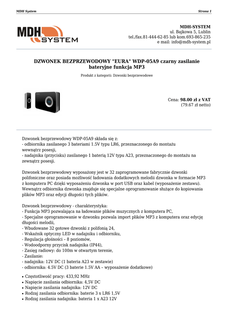 MDH System Strona 1 MDH-SYSTEM ul. Bajkowa 5, Lublin tel./fax.81-444-62-85 lub kom.693-865-235 e mail: [email protected] DZWONEK BEZPRZEWODOWY "EURA" WDP-05A9 czarny zasilanie bateryjne funkcja MP3 Produkt z kategorii: Dzwonki bezprzewodowe Cena: 98.00 zł z VAT (79.67 zł netto) Dzwonek bezprzewodowy WDP-05A9 składa się z: - odbiornika zasilanego 3 bateriami 1.5V typu LR6, przeznaczonego do montażu wewnątrz posesji, - nadajnika (przycisku) zasilanego 1 baterią 12V typu A23, przeznaczonego do montażu na zewnątrz posesji. Dzwonek bezprzewodowy wyposażony jest w 32 zaprogramowane fabrycznie dzwonki polifoniczne oraz posiada możliwość ładowania dodatkowych melodii dzwonka w formacie MP3 z komputera PC dzięki wyposażeniu dzwonka w port USB oraz kabel (wyposażenie zestawu). Wewnątrz odbiornika dzwonka znajduje się specjalne oprogramowanie służące do kopiowania plików MP3 oraz edycji długości tych plików. Dzwonek bezprzewodowy - charakterystyka: - Funkcja MP3 pozwalająca na ładowanie plików muzycznych z komputera PC, - Specjalne oprogramowanie w dzwonku pozwala import plików MP3 z komputera oraz edycję długości melodii, - Wbudowane 32 gotowe dzwonki z polifonią 24, - Wskaźnik optyczny LED w nadajniku i odbiorniku, - Regulacja głośności – 8 poziomów, - Wodoodporny przycisk nadajnika (IP44), - Zasięg radiowy: do 100m w otwartym terenie, - Zasilanie: - nadajnika: 12V DC (1 bateria A23 w zestawie) - odbiornika: 4.5V DC (3 baterie 1.5V AA – wyposażenie dodatkowe) ● ● ● ● ● Częstotliwość pracy: 433,92 MHz Napięcie zasilania odbiornika: 4,5V DC Napięcie zasilania nadajnika: 12V DC Rodzaj zasilania odbiornika: baterie 3 x LR6 1,5V Rodzaj zasilania nadajnika: bateria 1 x A23 12V MDH System ● ● ● ● ● ● ● ● ● ● ● ● ● ● ● Strona 2 Rodzaj komunikacji: bezprzewodowa Moc sygnału nadajnika: 5 mW Zasięg radiowy: max. 75m w terenie otwartym Max. poziom głośności: 75 dB/ 1m Temperaturowy zakres pracy odbiornika: 0ºC...+35ºC Temperaturowy zakres pracy nadajnika: -18ºC...+50ºC Funkcje dodatkowe: możliwość wgrywania i odtwarzania plików MP3, 32 melodie do wyboru, regulacja głośności Współczynnik ochrony nadajnika: IP44 Współczynnik ochrony odbiornika: IP20 Masa netto: 0,21 kg Masa brutto: 0,3 kg Wymiary opakowania - wysokość: 270 mm Wymiary opakowania - szerokość: 195 mm Wymiary opakowania - głębokość: 45 mm Typ opakowania: Blister Zapraszamy do naszego sklepu internetowego www.mdh-system.pl Dokument wygenerowany 2017-03-04 o godzinie 02:28