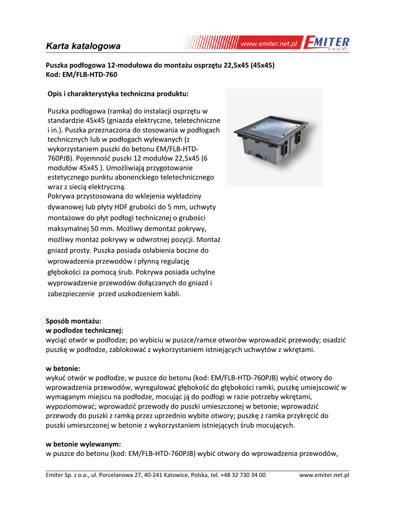 Karta katalogowa Puszka podłogowa 12-modułowa do montażu osprzętu 22,5x45 (45x45) Kod: EM/FLB-HTD-760 Opis i charakterystyka techniczna produktu: Puszka podłogowa (ramka) do instalacji osprzętu w standardzie 45x45 (gniazda elektryczne, teletechniczne i in.). Puszka przeznaczona do stosowania w podłogach technicznych lub w podłogach wylewanych (z wykorzystaniem puszki do betonu EM/FLB-HTD760PJB). Pojemność puszki 12 modułów 22,5x45 (6 modułów 45x45 ). Umożliwiają przygotowanie estetycznego punktu abonenckiego teletechnicznego wraz z siecią elektryczną. Pokrywa przystosowana do wklejenia wykładziny dywanowej lub płyty HDF grubości do 5 mm, uchwyty montażowe do płyt podłogi technicznej o grubości maksymalnej 50 mm. Możliwy demontaż pokrywy, możliwy montaż pokrywy w odwrotnej pozycji. Montaż gniazd prosty. Puszka posiada osłabienia boczne do wprowadzenia przewodów i płynną regulację głębokości za pomocą śrub. Pokrywa posiada uchylne wyprowadzenie przewodów dołączanych do gniazd i zabezpieczenie przed uszkodzeniem kabli. Sposób montażu: w podłodze technicznej: wyciąć otwór w podłodze; po wybiciu w puszce/ramce otworów wprowadzić przewody; osadzić puszkę w podłodze, zablokować z wykorzystaniem istniejących uchwytów z wkrętami. w betonie: wykuć otwór w podłodze, w puszce do betonu (kod: EM/FLB-HTD-760PJB) wybić otwory do wprowadzenia przewodów, wyregulować głębokość do głębokości ramki, puszkę umiejscowić w wymaganym miejscu na podłodze, mocując ją do podłogi w razie potrzeby wkrętami, wypoziomować; wprowadzić przewody do puszki umieszczonej w betonie; wprowadzić przewody do puszki z ramką przez uprzednio wybite otwory; puszkę z ramka przykręcić do puszki umieszczonej w betonie z wykorzystaniem istniejących śrub mocujących. w betonie wylewanym: w puszce do betonu (kod: EM/FLB-HTD-760PJB) wybić otwory do wprowadzenia przewodów, Emiter Sp. z o.o., ul. Porcelanowa 27, 40-241 Katowice, Polska, tel. +48 32 730 34 00 www.emiter.net.pl Karta katalogowa wyregulować głębokość do głębokości ramki, puszkę umiejscowić w wymaganym miejscu na podłodze (w razie potrzeby wykuć otwór pogłębiający), mocując ją do podłogi w razie potrzeby wkrętami, wypoziomować; wprowadzić przewody do puszki umieszczonej w betonie; po zalaniu betonem wprowadzić przewody do puszki z ramką przez uprzednio wybite otwory; puszkę z ramka przykręcić do puszki umieszczonej w betonie z wykorzystaniem istniejących śrub mocujących. Oznaczenia: BOX PODŁOGOWY 12M; kod: EM/FLB-HTD-760 Produkty kompatybilne z puszką: gniazda: gniazdo elektryczne pojedyncze kod: E/GN gniazdo elektryczne pojedyncze kodowane DATA kod: E/GNBZ adaptery: adapter 1-modułowy, kod: DC/FA-644-1SP adapter 2-modułowy, kod: DC/FA-644-2SP obudowa do betonu puszki EM/FLB-HTD-760, kod: EM/FLB-HTD-760PJB Uwaga: ze względu na różną głębokość gniazd oraz różne sposoby doprowadzenia i podłączenia przewodów, niektóre gniazda w adapterach mogą nie być kompatybilne. Ze względu na możliwość wystąpienia różnych kombinacji zaleca się przed instalacją sprawdzenie lub kontakt z dz.technicznym. Puszka z ramką: wykonanie: tworzywo ABS kolor - szary wymiary (szer. x wys. ): 185 x 225 mm ; gł. regulowana 90-120 mm masa 1,1 kg stopień ochrony: IP40 odpornosć udarowa: IK08 Wymiar otworu do montażu: przy montażu w podłodze technicznej (puszka z ramką) (szer. x wys.): 170x210 mm Certyfikaty: Deklaracja Zgodności 1/04/2014, 2/04/2014 Produkt przeznaczony do podłóg dla zabiegów podłogowych na sucho. Produkt przeznaczony do montażu w miejscach, w których zostanie wykorzystana jego funkcjonalność i zastosowanie. Z tego powodu nie należy projektować montażu puszki podłogowej w ciągach komunikacyjnych oraz miejscach, w których stanowić będą utrudnienie lub przeszkodę dla poruszających się osób. Emiter Sp. z o.o., ul. Porcelanowa 27, 40-241 Katowice, Polska, tel. +48 32 730 34 00 www.emiter.net.pl Karta katalogowa W zależności od typu oraz ilości kabli i przewodów przyłączeniowych wpinanych do montowanych w puszce gniazd pokrywa może, ale nie musi się domykać w pełni. Odpowiednia funkcjonalność, wynikająca z cech produktu, powinna zostać przewidziana przez projektanta na etapie projektu. Dołożyliśmy wszelkich starań, aby przedstawione informacje były rzetelne i kompletne. Jednak nie ponosimy odpowiedzialności za dokładność i kompletność danych oraz w szczególności nie możemy zagwarantować, że niniejsza specyfikacja nie zawiera błędów lub pomyłek. Informacje zawarte w niniejszej specyfikacji mogą zostać zmienione w każdej chwili bez powiadomienia. Emiter Sp. z o.o., ul. Porcelanowa 27, 40-241 Katowice, Polska, tel. +48 32 730 34 00 www.emiter.net.pl