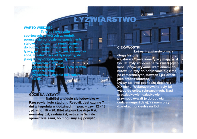 ŁYŻWIARSTWO WARTO WIEDZIEĆ To grupa dyscyplin sportowych, w których zawodnik porusza się po lodzie na specjalnych stalowych płozach, przymocowanych do butów, zwanych łyżwami. Zarówno łyżwy, jak i same buty, różnią się między sobą, w zależności od dyscypliny, do jakiej są wykorzystywane, tj.: łyżwiarstwo szybkie, łyżwiarstwo figurowe i łyżwiarstwo synchroniczne, łyżwiarstwo szybkie na krótkim torze. GDZIE NA ŁYŻWY? Najbliżej znajduje się lodowisko w Rzeszowie, koło stadionu Resovii. Jest czynne 7 dni w tygodniu w godzinach: pon. – czw. 12 - 18 , pt. – nd. 10 – 20. Bilet ulgowy kosztuje 6 zł, normalny 8zł, szatnia 2zł, ostrzenie 5zł (ale sprawdźcie sami, bo mogliśmy się pomylić). CIEKAWOSTKI Łyżwy i łyżwiarstwo mają długą historię. Najstarsze, znalezione łyżwy mają ok. 4 tys. lat, były zbudowane ze zwierzęcych kości, przywiązywane rzemieniami do butów. Służyły do poruszania się zimą po zamarzniętych stawach i jeziorach jako środek lokomocji. Łyżwy stalowe pochodzą dopiero z XIXwieku. Wykorzystywane były już wtedy do celów rekreacyjnych. Nasi pradziadkowie i dziadkowie przymocowywali je do obuwia codziennego i dalej, czasem przy dźwiękach orkiestry na lód...