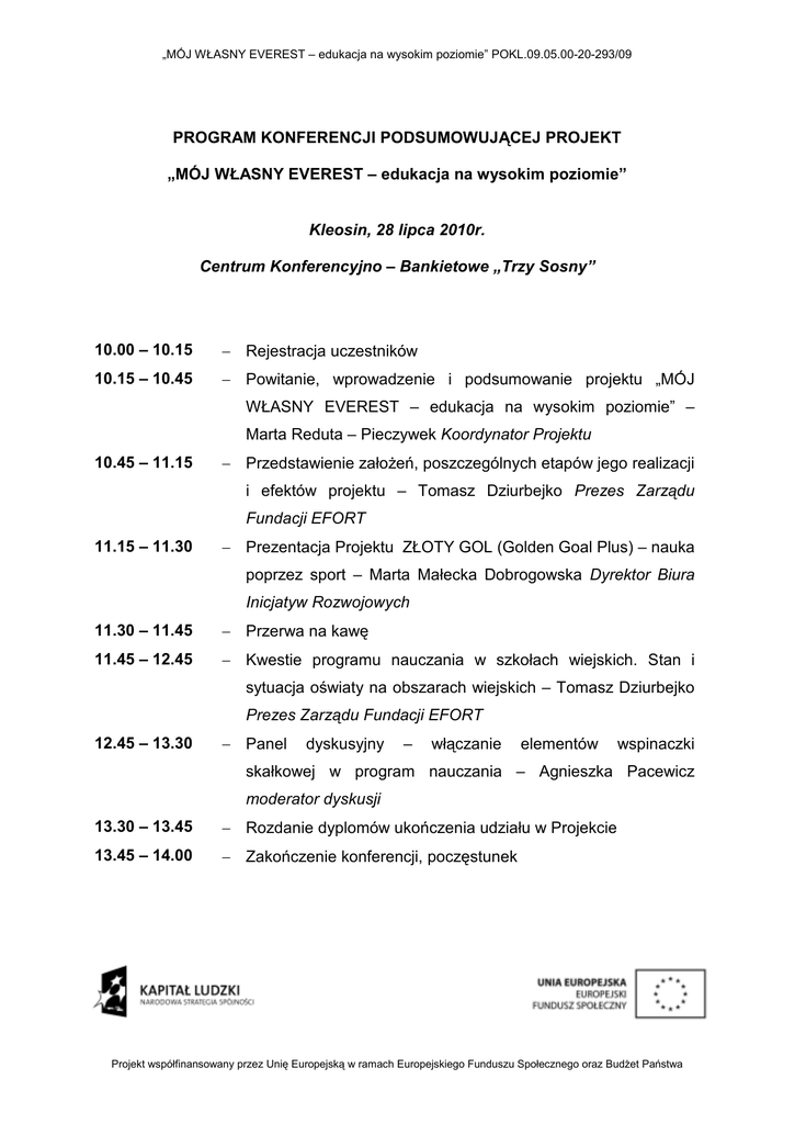 „MÓJ WŁASNY EVEREST – edukacja na wysokim poziomie” POKL.09.05.00-20-293/09 PROGRAM KONFERENCJI PODSUMOWUJĄCEJ PROJEKT „MÓJ WŁASNY EVEREST – edukacja na wysokim poziomie” Kleosin, 28 lipca 2010r. Centrum Konferencyjno – Bankietowe „Trzy Sosny” 10.00 – 10.15 − Rejestracja uczestników 10.15 – 10.45 − Powitanie, wprowadzenie i podsumowanie projektu „MÓJ WŁASNY EVEREST – edukacja na wysokim poziomie” – Marta Reduta – Pieczywek Koordynator Projektu 10.45 – 11.15 − Przedstawienie załoŜeń, poszczególnych etapów jego realizacji i efektów projektu – Tomasz Dziurbejko Prezes Zarządu Fundacji EFORT 11.15 – 11.30 − Prezentacja Projektu ZŁOTY GOL (Golden Goal Plus) – nauka poprzez sport – Marta Małecka Dobrogowska Dyrektor Biura Inicjatyw Rozwojowych 11.30 – 11.45 − Przerwa na kawę 11.45 – 12.45 − Kwestie programu nauczania w szkołach wiejskich. Stan i sytuacja oświaty na obszarach wiejskich – Tomasz Dziurbejko Prezes Zarządu Fundacji EFORT 12.45 – 13.30 − Panel dyskusyjny – włączanie elementów wspinaczki skałkowej w program nauczania – Agnieszka Pacewicz moderator dyskusji 13.30 – 13.45 − Rozdanie dyplomów ukończenia udziału w Projekcie 13.45 – 14.00 − Zakończenie konferencji, poczęstunek Projekt współfinansowany przez Unię Europejską w ramach Europejskiego Funduszu Społecznego oraz BudŜet Państwa