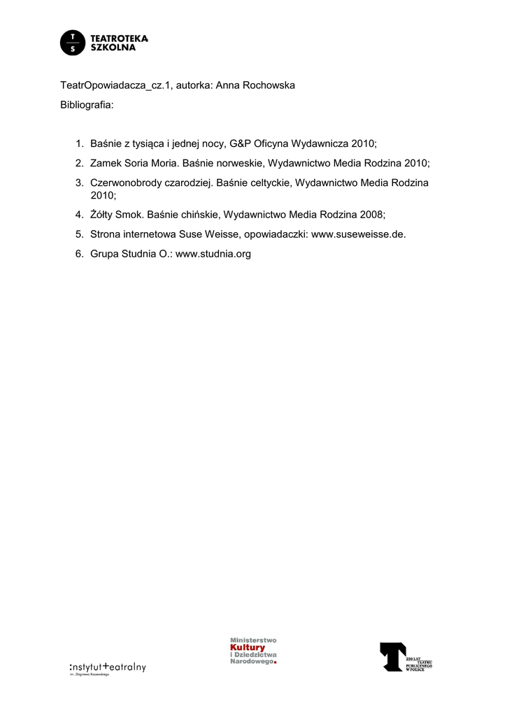 TeatrOpowiadacza_cz.1, autorka: Anna Rochowska Bibliografia: 1. Baśnie z tysiąca i jednej nocy, G&P Oficyna Wydawnicza 2010; 2. Zamek Soria Moria. Baśnie norweskie, Wydawnictwo Media Rodzina 2010; 3. Czerwonobrody czarodziej. Baśnie celtyckie, Wydawnictwo Media Rodzina 2010; 4. Żółty Smok. Baśnie chińskie, Wydawnictwo Media Rodzina 2008; 5. Strona internetowa Suse Weisse, opowiadaczki: www.suseweisse.de. 6. Grupa Studnia O.: www.studnia.org