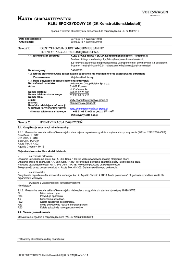 KARTA CHARAKTERYSTYKI KLEJ EPOKSYDOWY 2K (2K Konstruktionsklebstoff) zgodna z wzorem określonym w załączniku I do rozporządzenia UE nr 453/2010 Data sporządzenia: Aktualizacja: Sekcja1: 03.10.2013 r. (Wersja 1.0.0) 20.02.2015 r. (Wersja 2.0.0) IDENTYFIKACJA SUBSTANCJI/MIESZANINY I IDENTYFIKACJA PRZEDSIĘBIORSTWA 1.1. Identyfikator produktu KLEJ EPOKSYDOWY 2K (2K Konstruktionsklebstoff) - składnik A Zawiera: Alifatyczne diaminy, 2,4,6-tris(dimetyloaminometylo)fenol, 3,3'-oksybis(etylenoksy)bis(propyloamina), 2-propenenitrile, polymer with 1,3-butadiene, 1-cyano-1-methyl-4-oxo-4-[[2-(1-piperazinyl)ethyl]amino]butyl-terminated Nr katalogowy: DA001730 1.2. Istotne zidentyfikowane zastosowania substancji lub mieszaniny oraz zastosowania odradzane Zastosowanie: Klej dwuskładnikowy 1.3. Dane dotyczące dostawcy karty charakterystyki Nazwa/imię i nazwisko Volkswagen Group Polska Sp. z o.o. Adres 61-037 Poznań ul. Krańcowa 44 Numer telefonu +48 61 62 73 000 Numer telefonu alarmowego +48 61 62 73 047 Numer faksu e-mail [email protected] Internet http://www.vw-group.pl/ Komórka udzielająca informacji w sprawie karty charakterystyki [email protected] 1.4.Numer telefonu alarmowego +48 61 62 73 000 w godz.: 800 - 1600 112 (czynny całą dobę) Sekcja 2: IDENTYFIKACJA ZAGROŻEŃ 2.1. Klasyfikacja substancji lub mieszaniny 2.1.1. Mieszanina została zaklasyfikowana jako stwarzająca zagrożenia zgodnie z kryteriami rozporządzenia (WE) nr 1272/2008 (CLP). Skin Sens. 1 H317 Eye Dam. 1 H318 Skin Corr. 1A H314 Acute Tox. 4 H302 Aquatic Chronic 4 H413 Najważniejsze szkodliwe skutki działania: na zdrowie człowieka Działanie uczulające na skórę, kat. 1. Skin Sens. 1 H317: Może powodować reakcję alergiczną skóry. Działanie żrące na skórę, kat. 1A. Skin Corr. 1A H314: Powoduje poważne oparzenia skóry i uszkodzenia oczu. Poważne uszkodzenie oczu, kat 1. Eye Dam. 1 H318: Powoduje poważne uszkodzenie oczu. Toksyczność ostra, pokarmowa kat. 4. Acute Tox. 4 H302: Działa szkodliwie po połknięciu. na środowisko Długotrwałe zagrożenie dla środowiska wodnego, kat. 4. Aquatic Chronic 4 H413. Może powodować długotrwałe szkodliwe skutki dla organizmów wodnych. związane z właściwościami fizykochemicznymi Nie dotyczy. 2.1.2. Mieszanina została zaklasyfikowana jako niebezpieczna zgodnie z kryteriami dyrektywy 1999/45/WE. C Mieszanina żrąca R34 Powoduje oparzenia. Xn Mieszanina szkodliwa. R22 Działa szkodliwie po połknięciu. R43 Może powodować reakcję alergiczną skóry. R53 Działa szkodliwie na organizmy wodne. 2.2. Elementy oznakowania Oznakowanie zgodnie z rozporządzeniem (WE) nr 1272/2008 (CLP): Piktogramy określające rodzaj zagrożenia: KLEJ EPOKSYDOWY 2K (Konstruktionsklebstoff) [20.02.2015] Strona 1/11 KARTA Sekcja 2: CHARAKTERYSTYKI KLEJ EPOKSYDOWY 2K (2K Konstruktionsklebstoff) IDENTYFIKACJA ZAGROŻEŃ GHS05 GHS07 Hasło ostrzegawcze: Niebezpieczeństwo Zwroty wskazujące rodzaj zagrożenia: H317: Może powodować reakcję alergiczną skóry. H314: Powoduje poważne oparzenia skóry i uszkodzenia oczu. H302: Działa szkodliwie po połknięciu. H413. Może powodować długotrwałe szkodliwe skutki dla organizmów wodnych. Zwroty wskazujące środki ostrożności: P102: Chronić przed dziećmi. P280: Stosować rękawice ochronne/ochronę oczu- nosić okulary ochronne. P302+P352: W PRZYPADKU KONTAKTU ZE SKÓRĄ: Umyć dużą ilością wody z mydłem. P305+P351+P338: W PRZYPADKU DOSTANIA SIĘ DO OCZU: ostrożnie płukać wodą przez kilka minut. Wyjąć soczewki kontaktowe, jeżeli są i można je łatwo usunąć. Nadal płukać. P308+P313: W przypadku narażenia lub styczności: Zasięgnąć porady/zgłosić się pod opiekę lekarza. P273: Unikać uwolnienia do środowiska. P501: Zawartość/pojemnik usuwać na składowiska odpadów niebezpiecznych, zgodnie z przepisami miejscowymi/regionalnymi/narodowymi/międzynarodowymi. Informacje uzupełniające o zagrożeniach: Nie dotyczy Etykieta powinna zawierać identyfikator produktu, o którym mowa w art. 18 rozp. CLP oraz nazwę, adres i telefon dostawcy danej mieszaniny. Dane identyfikujące wszystkie substancje w mieszaninie, które decydują o jej zaklasyfikowaniu zgodnie z Art. 18 pkt. 3b. Alifatyczne diaminy, 2,4,6-tris(dimetyloaminometylo)fenol, 3,3'-oksybis(etylenoksy)bis(propyloamina), 2-propenenitrile, polymer with 1,3butadiene, 1-cyano-1-methyl-4-oxo-4-[[2-(1-piperazinyl)ethyl]amino]butyl-terminated 2.3. Inne zagrożenia 2.3.1 Ocena PBT lub vPvB zgodnie z zał. XIII REACH – substancje zawarte w mieszaninie nie zostały zakwalifikowane jako PBT lub vPvB. Kryteria PBT i vPvB zawarte są w Aneksie XIII REACH. 2.3.2. Informacje dotyczące innych zagrożeń, które nie powodują zaklasyfikowania, a które mogą przyczynić się do ogólnych zagrożeń powodowanych przez mieszaninę. Nie dotyczy. Sekcja 3. SKŁAD/INFORMACJA O SKŁADNIKACH 3.1. Substancje 3.2. Mieszaniny Opis ogólny: utwardzacz, polimer. Spis substancji w mieszaninie: a) Substancje stanowiące zagrożenie dla zdrowia lub środowiska w rozumieniu rozporządzenia (WE) nr 1272/2008 i dyrektywy 67/548/EWG: Alifatyczne diaminy: Zawartość: Nr CAS: Nr WE: Nr indeksowy: Nr rejestracji: Klasyfikacja substancji zgodnie z rozporządzeniem (WE) nr 1272/2008 Klasyfikacja substancji zgodnie z dyrektywą 67/548/EWG: KLEJ EPOKSYDOWY 2K (Konstruktionsklebstoff) [20.02.2015] Strona 2/11 > = 55 < 60% 68911-25-1 nie podano Skin Irrit. 2; H315 Eye Dam. 1; H318 Skin Sens. 1; H317 Aquatic Chronic 4; H413 Xi; R38 R43 R41 R53 KARTA Sekcja 3. CHARAKTERYSTYKI KLEJ EPOKSYDOWY 2K (2K Konstruktionsklebstoff) SKŁAD/INFORMACJA O SKŁADNIKACH 2-Propenenitrile, polymer with 1,3-butadiene, 1-cyano-1-methyl-4oxo-4-[[2-(1-piperazinyl)ethyl]amino]butyl-terminated: Zawartość: Nr CAS: Nr WE: Nr indeksowy: Nr rejestracji: Klasyfikacja substancji zgodnie z rozporządzeniem (WE) nr 1272/2008 Klasyfikacja substancji zgodnie z dyrektywą 67/548/EWG: 2,4,6-tris(Dimetyloaminomety