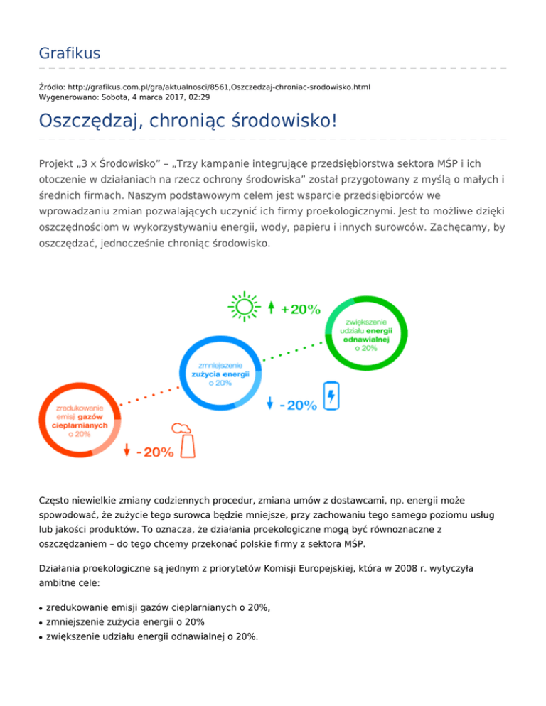 Grafikus Źródło: http://grafikus.com.pl/gra/aktualnosci/8561,Oszczedzaj-chroniac-srodowisko.html Wygenerowano: Sobota, 4 marca 2017, 02:29 Oszczędzaj, chroniąc środowisko! Projekt „3 x Środowisko” – „Trzy kampanie integrujące przedsiębiorstwa sektora MŚP i ich otoczenie w działaniach na rzecz ochrony środowiska” został przygotowany z myślą o małych i średnich firmach. Naszym podstawowym celem jest wsparcie przedsiębiorców we wprowadzaniu zmian pozwalających uczynić ich firmy proekologicznymi. Jest to możliwe dzięki oszczędnościom w wykorzystywaniu energii, wody, papieru i innych surowców. Zachęcamy, by oszczędzać, jednocześnie chroniąc środowisko. Często niewielkie zmiany codziennych procedur, zmiana umów z dostawcami, np. energii może spowodować, że zużycie tego surowca będzie mniejsze, przy zachowaniu tego samego poziomu usług lub jakości produktów. To oznacza, że działania proekologiczne mogą być równoznaczne z oszczędzaniem – do tego chcemy przekonać polskie firmy z sektora MŚP. Działania proekologiczne są jednym z priorytetów Komisji Europejskiej, która w 2008 r. wytyczyła ambitne cele: ● zredukowanie emisji gazów cieplarnianych o 20%, ● zmniejszenie zużycia energii o 20% ● zwiększenie udziału energii odnawialnej o 20%. Cele te mają być osiągnięte do roku 2020. Do ich realizacji konieczny jest aktywny udział wszystkich przedsiębiorstw, szczególnie sektora MŚP. Celem projektu jest wzrost świadomości pracowników sektora MŚP w zakresie działań proekologicznych oraz efektywnego wykorzystania zasobów. Nasze działania koncentrujemy na sektorze MŚP Sektor Małych i Średnich Przedsiębiorstw stanowi w Polsce 99% wszystkich firm i zatrudnia 9 mln osób. Ich wpływ na wykorzystanie zasobów naturalnych jest bez wątpienia ogromny. Jak będzie przebiegać realizacja projektu? Działania w projekcie skoncentrowane są wokół 3 kampanii: W trakcie projektu zostaną opracowane materiały, które będą merytorycznym wsparciem dla przedsiębiorców zainteresowanych wprowadzaniem zmian w swoich organizacjach. Naszym głównym produktem będzie Pakiet ekologiczny. Projekt realizowany jest przez Stowarzyszenie REFA Wielkopolska – koordynatora projektu, w partnerstwie ze Stowarzyszeniem Rozwoju Edukacji Ustawicznej „Transfer” i Związkiem Rzemiosła Polskiego, w okresie od 1.10.2013 r. do 30.04.2016 r więcej na stronie:http://www.3xsrodowisko.pl Załączniki do strony 3xśrodowisko 739.42 KB Formularz zgłoszeniowy 67.43 KB Regulamin konkursu 25.01 KB