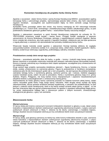 Komentarz heraldyczny do projektu herbu Gminy Kolno Zgodnie z życzeniem władz Gminy Kolno i opinią Komisji Heraldycznej MSWiA pozostawiłem ogólną koncepcję herbu z pierwotnego projektu, wprowadzając jedynie takie zmiany, aby herb odpowiadał regułom heraldyki, szczególnie zaś wyeliminowałem błędy na które zwróciła uwagę Komisja Heraldyczna. Symbolika herbu pozostaje zatem bez zmian, trzy korony nawiązują do XIV wiecznego kościoła parafialnego p.w. Trzech Króli, centralnego i charakterystycznego obiektu zabytkowego gminy, co jest podkreślone dodatkowo głównym godłem herbu – wizerunkiem fasady rzeczonej świątyni. Zgodnie z zaleceniami zawartymi w opinii Komisji Heraldycznej (załącznik do uchwały Nr 701057/O/2006) zmieniony został kształt i barwa koron. Przyjęty kształt nawiązuje w pewnym uproszczeniu do Korony Bolesława Chrobrego, jednego z najważniejszych polskich regaliów. Barwa koron została tak zmieniona, aby była zgodna z regułami heraldyki, zwłaszcza zaś nie była sprzeczna z regułą alternacji, a zarazem nie wprowadzała bez potrzeby dodatkowej barwy herbu. Wizerunek fasady kościoła został zgodnie z zaleceniem Komisji bardziej zbliżony do wyglądu rzeczywistej budowli, zmienione zostały m.in. proporcje wieży, układ okien, kształt sygnaturki i dachu. Dodany został krzyż wieńczący sygnaturkę, podkreślający sakralny charakter budynku. Przedstawione zostały dwie wersje tego projektu: Pierwsza – pozostawia jednolite złote tło herbu, a godła – korony i kościół mają barwę czerwoną.. Barwa czerwona w przypadku wizerunku kościoła jest zarazem naturalną barwą rzeczywistej budowli. Korony w barwie czerwonej są w heraldyce dość często spotykane, szczególnie przy umieszczeniu ich na metalicznym tle. Drugi wariant tego projektu wprowadza dodatkowy element – figurę heraldyczną. Korony, w barwie złotej, zostały umieszczone na czerwonej głowicy. Figura ta powszechna w heraldyce europejskiej, zwłaszcza jako tło dla drobniejszych godeł, jak w tym przypadku, nie jest typowa dla polskiej heraldyki. Jednakże istnieją herby z wyróżnioną głowicą, zarówno gminne, jak i rodowe, niektóre sięgające czasów heraldyki żywej, zatem nie jest to precedens. Herby z wyróżnioną głowicą mają m.in. gminy Sulików, Wapno, Potęgowo, nie liczą bardzo liczny niepoprawnych i zapewne niezatwierdzonych oficjalnie herbów z pseudogłowicami z umieszczoną nazwą gminy. Wprowadzenie do herbu głowicy barwy czerwonej pozwala na nadanie koronom złotej barwy, dzięki czemu wszystkie godła herbu mają swoje barwy naturalne. Herb drugiej wersji wydaje się lepiej zakomponowały, tarcza sprawia wrażenie bardziej wypełnionej, a zarazem nie przeładowanej, co jest jednym z zaleceń sztuki heraldycznej. Herb w tej wersji znalazł uznanie władz gminy, a także, co nie jest bez znaczenia daje się wprost przetransponować na zgodna z zasadami weksylologii flagę gminy, np. przez zastosowanie żółtego lata z czerwonym pasem z żółtymi koronami, umieszczonego analogicznie jak głowica, u góry, lub centralnie. . Blazonowanie herbu Wariant pierwszy W tarczy złotej pod trzema czerwonymi koronami królewskimi otwartymi w głowicy w pas, takaż wieża kościelna z trapezoidalnym dachem zwieńczonym sygnaturką zakończoną krzyżem, o pięciu czarnych podłużnych oknach ułożonych w literę T, złożona na tle dachu czerwonego, o kształcie trapezu, którego obydwie boczne krawędzie wieńczą po trzy schodkowe blanki ścian szczytowych kościoła. Wariant drugi W tarczy złotej, pod głowicą czerwoną na której trzy złote korony królewskie otwarte w pas, czerwona wieża kościelna z trapezoidalnym dachem zwieńczonym sygnaturką zakończoną krzyżem, o pięciu czarnych podłużnych oknach ułożonych w literę T, złożona na tle dachu czerwonego, o kształcie trapezu, którego obydwie boczne krawędzie wieńczą po trzy schodkowe blanki ścian szczytowych kościoła. Oba warianty zostały w projekcie umieszczone na tarczy późnogotyckiej, zwanej niekiedy „hiszpańską”, co oczywiście, zgodnie z regułami heraldyki, nie wyklucza stosowania w razie potrzeby innych stylizacji tarczy lub kartusza. Barwy herbu W przedstawianym projekcie barwa tła herbu i koron w wariancie drugim, zostały przedstawione w barwie żółtej, co w heraldyce symbolizuje metaliczne złoto. Jest zatem dopuszczalne, aby w szczególnie uroczystych przedstawieniach herbu stosować płatkowe złoto lub metaliczną złotą farbę. Symbolizująca złoto tynktura żółta w zależności od stosowanych technik plastycznych lub poligraficznych, rodzaju farb lub szkła w przypadku witraży, może ulegać pewnym wahaniom tonalnym, pozostając wszakże w gamie jasnych, nasyconych żółcieni. W projekcie została zastosowana barwa odpowiadająca w skali Panteon barwie Panteon Hexachrome Yellow C Barwa czerwona, o ile nie jest specyficznie zdefiniowana w opisie (blazonowaniu) herbu w heraldyce jest tradycyjnie oddawana nasyconymi, jaskrawymi czerwieniami – ciemnym cynobrem, szkarłatem, czerwienią kadmową. Rzadko, raczej dla podkreślenia trójwymiarowości tarczy lub godła stosowane były ciemne czerwienie alizarynowe, karmin lub czerwienie żelazowe. W tym projekcie zastosona została czerwień odpowiadająca w skali Panteon barwie Panteon 1797C Barwa czarna w projekcie odpowiada barwie Panteon BlackC ale może być oddana każdą głęboką czernią. Oryginalność herbu Analiza polskich herbów terytorialnych, gminnych i samorządowych wskazuje na brak istniejącego już herbu identycznego lub nadmiernie (myląco) podobnego do projektu herbu gminy Kolno. Na istnienie nadmiernie podobnego herbu w innych krajach europejskich również nie wskazuje przegląd dostępnych, jednak niepełnych, źródeł. Niektóre herby np. francuskich miast Querqueville i St-Pierrele-Moutier są analogicznie zakomponowanie, jednak inny dobór tynktur, inne god