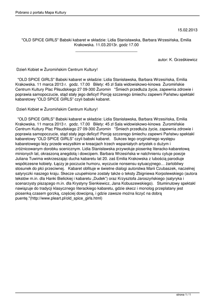 Pobrano z portalu Mapa Kultury 15.02.2013 "OLD SPICE GIRLS" Babski kabaret w składzie: Lidia Stanisławska, Barbara Wrzesińska, Emilia Krakowska. 11.03.2013r. godz 17.00 ____________________________ autor: K. Grześkiewicz Dzień Kobiet w Żuromińskim Centrum Kultury! "OLD SPICE GIRLS" Babski kabaret w składzie: Lidia Stanisławska, Barbara Wrzesińska, Emilia Krakowska. 11 marca 2013 r. godz. 17.00 Bilety: 45 zł Sala widowiskowo-kinowa Żuromińskie Centrum Kultury Plac Piłsudskiego 27 09-300 Żuromin "Śmiech przedłuża życie, zapewnia zdrowie i poprawia samopoczucie, stąd stały jego deficyt! Porcję szczerego śmiechu zapewni Państwu spektakl kabaretowy ”OLD SPICE GIRLS” czyli babski kabaret. Dzień Kobiet w Żuromińskim Centrum Kultury! "OLD SPICE GIRLS" Babski kabaret w składzie: Lidia Stanisławska, Barbara Wrzesińska, Emilia Krakowska. 11 marca 2013 r. godz. 17.00 Bilety: 45 zł Sala widowiskowo-kinowa Żuromińskie Centrum Kultury Plac Piłsudskiego 27 09-300 Żuromin "Śmiech przedłuża życie, zapewnia zdrowie i poprawia samopoczucie, stąd stały jego deficyt! Porcję szczerego śmiechu zapewni Państwu spektakl kabaretowy ”OLD SPICE GIRLS” czyli babski kabaret. Sukces tego oryginalnego występu kabaretowego leży przede wszystkim w kreacjach trzech wspaniałych artystek o dużym i zróżnicowanym dorobku scenicznym. Lidia Stanisławska przywołuje piosenkę literacko-kabaretową minionych lat, okraszoną anegdotą i dowcipem. Barbara Wrzesińska w natchnieniu cytuje poezje Juliana Tuwima wskrzeszając ducha kabaretu lat 20. zaś Emilia Krakowska z lubością parodiuje współczesne kobiety. Łączy je poczucie humoru, wyczucie nonsensu sytuacyjnego… żartobliwy stosunek do płci przeciwnej. Kabaret obfituje w świetne dialogi autorstwa Marii Czubaszek, naczelnej satyryczki naszego kraju. Skecze uzupełnione zostały także o teksty Zbigniewa Korpolewskiego (autora tekstów m.in. dla Hanki Bielickiej i kabaretu „Dudek”) oraz Krzysztofa Jaroszyńskiego (satyryka i scenarzysty piszącego m.in. dla Krystyny Sienkiewicz, Jana Kobuszewskiego). Stuminutowy spektakl nawiązuje do tradycji klasycznego literackiego kabaretu, gdzie skecz i monolog przeplatany jest piosenką czasem gorzką, częściej dowcipną, i gdzie zawsze można liczyć na dobrą puentę."(http://www.pleart.pl/old_spice_girls.html) strona 1 / 1