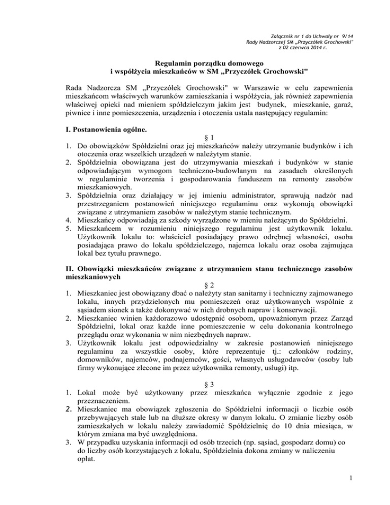 Załącznik nr 1 do Uchwały nr 9/14 Rady Nadzorczej SM „Przyczółek Grochowski" z 02 czerwca 2014 r. Regulamin porządku domowego i współżycia mieszkańców w SM „Przyczółek Grochowski" Rada Nadzorcza SM „Przyczółek Grochowski" w Warszawie w celu zapewnienia mieszkańcom właściwych warunków zamieszkania i współżycia, jak również zapewnienia właściwej opieki nad mieniem spółdzielczym jakim jest budynek, mieszkanie, garaż, piwnice i inne pomieszczenia, urządzenia i otoczenia ustala następujący regulamin: I. Postanowienia ogólne. §1 1. Do obowiązków Spółdzielni oraz jej mieszkańców należy utrzymanie budynków i ich otoczenia oraz wszelkich urządzeń w należytym stanie. 2. Spółdzielnia obowiązana jest do utrzymywania mieszkań i budynków w stanie odpowiadającym wymogom techniczno-budowlanym na zasadach określonych w regulaminie tworzenia i gospodarowania funduszem na remonty zasobów mieszkaniowych. 3. Spółdzielnia oraz działający w jej imieniu administrator, sprawują nadzór nad przestrzeganiem postanowień niniejszego regulaminu oraz wykonują obowiązki związane z utrzymaniem zasobów w należytym stanie technicznym. 4. Mieszkańcy odpowiadają za szkody wyrządzone w mieniu należącym do Spółdzielni. 5. Mieszkańcem w rozumieniu niniejszego regulaminu jest użytkownik lokalu. Użytkownik lokalu to: właściciel posiadający prawo odrębnej własności, osoba posiadająca prawo do lokalu spółdzielczego, najemca lokalu oraz osoba zajmująca lokal bez tytułu prawnego. II. Obowiązki mieszkańców związane z utrzymaniem stanu technicznego zasobów mieszkaniowych §2 1. Mieszkaniec jest obowiązany dbać o należyty stan sanitarny i techniczny zajmowanego lokalu, innych przydzielonych mu pomieszczeń oraz użytkowanych wspólnie z sąsiadem sionek a także dokonywać w nich drobnych napraw i konserwacji. 2. Mieszkaniec winien każdorazowo udostępnić osobom, upoważnionym przez Zarząd Spółdzielni, lokal oraz każde inne pomieszczenie w celu dokonania kontrolnego przeglądu oraz wykonania w nim niezbędnych napraw. 3. Użytkownik lokalu jest odpowiedzialny w zakresie postanowień niniejszego regulaminu za wszystkie osoby, które reprezentuje tj.: członków rodziny, domowników, najemców, podnajemców, gości, własnych usługodawców (osoby lub firmy wykonujące zlecone im przez użytkownika remonty, usługi) itp. §3 1. Lokal może być użytkowany przez mieszkańca wyłącznie zgodnie z jego przeznaczeniem. 2. Mieszkaniec ma obowiązek zgłoszenia do Spółdzielni informacji o liczbie osób przebywających stale lub na dłuższe okresy w danym lokalu. O zmianie liczby osób zamieszkałych w lokalu należy zawiadomić Spółdzielnię do 10 dnia miesiąca, w którym zmiana ma być uwzględniona. 3. W przypadku uzyskania informacji od osób trzecich (np. sąsiad, gospodarz domu) co do liczby osób korzystających z lokalu, Spółdzielnia dokona zmiany w naliczeniu opłat. 1 §4 Wszelkie przeróbki w lokalu, a zwłaszcza instalacji gazowych, centralnego ogrzewania, ciepłej i zimnej wody, stawianie lub rozbieranie ścianek działowych, przebudowa balkonów, zakładanie krat, montowanie daszków itp. mogą być dokonywane po uprzednim uzyskaniu pisemnej zgody Zarządu Spółdzielni, przy zachowaniu przepisów prawa budowlanego, pod rygorem obciążenia kosztami związanymi z usunięciem dokonanych przeróbek. §5 1. Naprawianie we własnym zakresie bezpieczników instalacji elektrycznych poza obrębem lokalu (w piwnicach itp.) ze względu na grożące niebezpieczeństwo oraz możliwość uszkodzenia instalacji i spowodowania pożaru jest zabronione. W przypadku stwierdzenia tego rodzaju uszkodzeń należy niezwłocznie zawiadomić Spółdzielnię lub gospodarza domu. 2. Zabrania się używania urządzeń powodujących zakłócenia w odbiorze programu radiowego i telewizyjnego. 3. Zabrania się instalowania dodatkowego oświetlenia w pomieszczeniach piwnicznych bez zgody Spółdzielni. §6 1. Wchodzenie na dachy budynków jest zabronione. 2. Zabrania się zakładania anten radiowych i telewizyjnych na dachach i elewacjach budynków W przypadku naruszenia tego postanowienia po uprzednim wezwaniu Spółdzielnia ma prawo usunąć ww. urządzenia na koszt mieszkańca. §7 1. Z uwagi na możliwość wystąpienia awarii w lokalach w czasie nieobecności mieszkańców i konieczności ich usunięcia, są oni zobowiązani podać Spółdzielni aktualne numery telefonów, a w przypadku dłuższej nieobecności adres kontaktowy. 2. W przypadku awarii, o której mowa w ust. 1, gdy otwarcie lokalu nastąpiło pod nieobecność pełnoletniej osoby z niego korzystającej, Spółdzielnia jest obowiązana zabezpieczyć lokal i znajdujące się w nim rzeczy, do czasu przybycia tej osoby. Z czynności tych sporządza się protokół. 3. Przedstawicielom Spółdzielni przysługuje prawo kontrolowania: urządzeń technicznych znajdujących się w mieszkaniach (jak np. instalacja gazowa, centralnego ogrzewania, ciepłej i zimnej wody), komórkach lokatorskich i piwnicach oraz balkonów. 4. W razie stwierdzenia, że stan techniczny, sanitarny lokalu i piwnicy jest nieodpowiedni, Spółdzielnia ma obowiązek wezwać mieszkańca do doprowadzenia lokalu do należytego stanu, wyznaczając na to stosowny termin. W przypadku nie uprzątnięcia piwnicy prace porządkowe będą wykonane na koszt mieszkańca. 5. Koszty usuwania szkód powstałych z winy mieszkańca lub innych osób zajmujących lokal za jego zgodą obciążają mieszkańca. III. Obowiązki gospodarza domu §8 1. Prace związane z utrzymaniem ładu, czystości i porządku w pomieszczeniach ogólnych budynków oraz w ich otoczeniu wykonują zatrudnieni przez Spółdzielnię gospodarze domów. 2. Do obowiązków gospodarza domu należy w szczególności: 2 a) obsługa posesji polegająca na: sprzątaniu oraz myciu klatek schodowych, podestów i schodów klatek (stopnie w rozwinięciu) z balustradami 