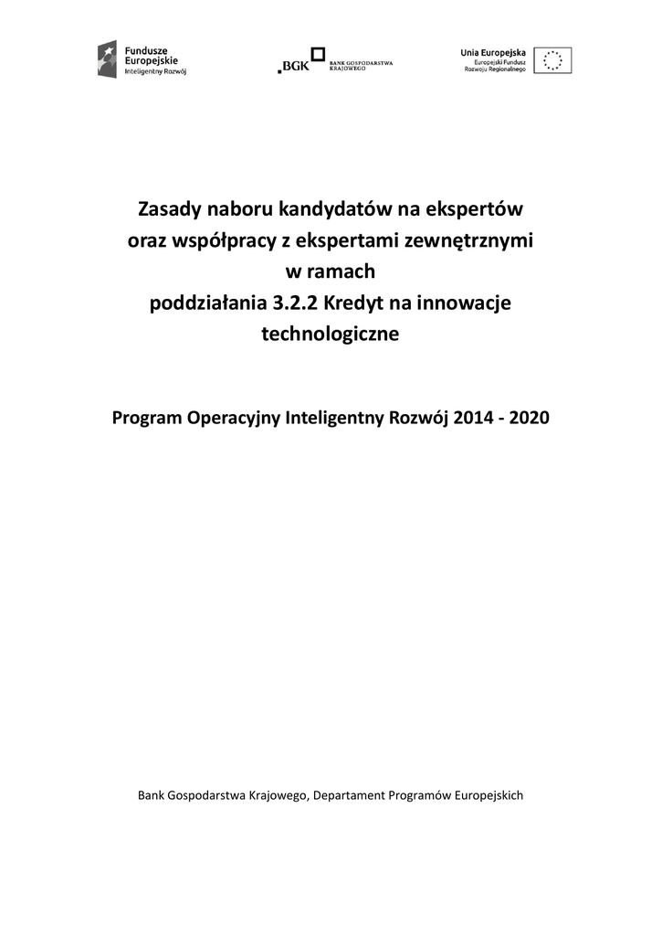 Zasady naboru kandydatów na ekspertów oraz współpracy z ekspertami zewnętrznymi w ramach poddziałania 3.2.2 Kredyt na innowacje technologiczne Program Operacyjny Inteligentny Rozwój 2014 - 2020 Bank Gospodarstwa Krajowego, Departament Programów Europejskich I. Podstawa prawna 1. Na podstawie Ustawy z dnia 11 lipca 2014 r. o zasadach realizacji programów w zakresie polityki spójności finansowanych w perspektywie finansowej 2014-2020 (Dz. U. z 2016 r., poz. 217 t.j.) – (dalej: Ustawy wdrożeniowej), Wytycznych w zakresie trybów wyboru projektów na lata 2014 - 2020 z dnia 31 marca 2015 r. oraz Ustawy z dnia 29 sierpnia 1997 r. o ochronie danych osobowych (Dz. U. z 1997 r. Nr 133, poz. 883, z późn. zm.) – (dalej: Wytycznych) Instytucja Pośrednicząca (dalej: IP) ogłasza nabór kandydatów na ekspertów, prowadzi wykaz kandydatów na ekspertów oraz tworzy niniejszy dokument. II. Postanowienia ogólne: 1. Niniejszy dokument dotyczy systemu naboru kandydatów na ekspertów w poddziałaniu 3.2.2 „Kredyt na innowacje technologiczne” PO IR realizowanego w ramach 3. osi priorytetowej „Wsparcie innowacji w przedsiębiorstwach Programu Operacyjnego Inteligentny Rozwój 2014-2020” 2. Departament Programów Europejskich w Banku Gospodarstwa Krajowego pełniący funkcję IP odpowiada za przeprowadzenie naboru kandydatów na ekspertów. Informacja o naborze kandydatów na ekspertów publikowana jest: a. na stronie internetowej IP pod adresem: www.bgk.pl. 3. Ogłoszenie o naborze kandydatów na ekspertów zawiera: a. zaproszenie do złożenia wniosku o wpis do Wykazu kandydatów na ekspertów uczestniczących w procesie oceny projektów do dofinansowania, b. wymagania dla kandydatów na ekspertów, c. informację o dziedzinach/branżach/specjalizacjach, w ramach których prowadzony będzie nabór, d. termin, sposób i miejsce złożenia wniosku o wpis do Wykazu kandydatów na ekspertów. 4. Nabór kandydatów na ekspertów prowadzony jest w trybie ciągłym, od momentu opublikowania ogłoszenia o naborze kandydatów na ekspertów do czasu publikacji jego zamknięcia. 5. Konkurs ma za zadanie wyłonienie kandydatów na ekspertów z zakresu „Branży” oraz „Innowacyjności” do świadczenia wybranych usług w zakresie: a. oceny merytorycznej wniosków o dofinansowanie, b. rozpatrzenia protestów od wyników oceny wniosków o dofinansowanie oraz przygotowania odpowiedzi na skargi sądowe na negatywne rozpatrzenie c. zaopiniowania wniosków o zmianę umowy o dofinansowanie realizacji projektu, d. doradztwa w zakresie projektu, w szczególności w zakresie weryfikacji kosztów wykazywanych we wnioskach o płatność, czy weryfikacji dokumentacji środowiskowej. 6. W ramach prowadzonego naboru IP tworzy Wykaz kandydatów na ekspertów do świadczenia usług wymienionych w pkt 5. Wykaz stanowi listę kandydatów na ekspertów ocenionych pozytywnie przez IP. 7. Wpis do Wykazu kandydatów na ekspertów nie oznacza obowiązku zlecenia kandydatowi na eksperta świadczenia usług wymienionych w pkt 5 i nie może stanowić dla kandydata na eksperta podstawy do zgłaszania jakichkolwiek roszczeń z tytułu wpisu, w tym roszczeń finansowych za okres oczekiwania. 8. Po umieszczeniu kandydata na eksperta w Wykazie kandydatów na ekspertów IP zawiera umowę z Ekspertem zlecenia świadczenia usług eksperckich. Zawarcie umowy nie oznacza obowiązku zlecenia Ekspertowi świadczenia usług wymienionych w pkt 5 i nie może stanowić dla Eksperta podstawy do zgłaszania jakichkolwiek roszczeń z tego tytułu, w tym roszczeń finansowych za okres oczekiwania. 9. Wystawienie zamówienia na świadczenie usług wszczyna wykonanie świadczenia na zasadach określonych w umowie. 10. Ekspert powołany do świadczenia usług, o których mowa w pkt 5 zobowiązany jest do podpisania Oświadczenia o bezstronności i poufności, którego wzór stanowi załącznik do odpowiednich regulaminów za każdym razem gdy świadczy usługi wymienione w pkt 5. Oświadczenie dotyczy relacji eksperta z wszystkimi wnioskodawcami biorącymi udział w konkursie. Oświadczenie składane jest pod rygorem odpowiedzialności karnej za składanie fałszywych zeznań. Spełnienie wymagań określonych w powyższych oświadczeniach jest warunkiem niezbędnym do dopuszczenia eksperta do świadczenia usług wymienionych w pkt 5. 11. Rola eksperta może mieć charakter opiniodawczo-doradczy albo rozstrzygający. Charakter opiniodawczo-doradczy oznacza, że ekspert przedstawia swoją opinię na temat danego projektu lub jego wybranych elementów pracownikom IP lub innym ekspertom oceniającym projekt wraz ze stosownym uzasadnieniem lub przekazuje rekomendacje w odniesieniu do sposobu oceny danego projektu lub wybranych jego aspektów pracownikom IP lub innym ekspertom oceniającym projekt. Opinia lub rekomendacja nie ma charakteru wiążącego. Charakter rozstrzygający oznacza związanie IOK lub członków Komisji Oceny Projektów (KOP) uzasadnieniem sporządzonym przez Eksperta. 12. W przypadku usług wymienionych w pkt 5 lit. d rola eksperta ma charakter opiniodawczo-doradczy, natomiast w przypadku usług wymienionych w pkt 5 lit. a, b oraz c charakter rozstrzygający. 13. Szczegółowe warunki związane z wykonaniem przez eksperta prac o charakterze eksperckim, w tym wynagrodzenie, będą określone w umowie zlecenia świadczenia usług eksperckich oraz w odpowiednich regulaminach konkursów. III. Wymagania dla kandydatów na ekspertów: Kandydatem na eksperta może zostać osoba, która spełnia obowiązkowe wymagania formalne, o których mowa poniżej, kryteria szczegółowe oraz niektóre kryteria pożądane. Wymagania formalne obowiązkowe (dla wszystkich grup ekspertów) Kryteria formalne - obligatoryjne 1. korzystanie z pełni praw publicznych 2. posiadanie pełnej zdolności do czynności prawnych 3. niekaralność prawomocnym wyrokiem za przestępstwo umyślne lub za umyślne przestępstwo skarbowe 4. niepozostawanie