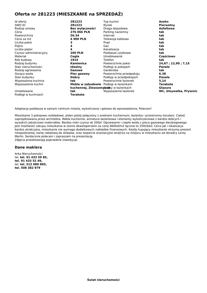Oferta nr 281223 (MIESZKANIE na SPRZEDAŻ)