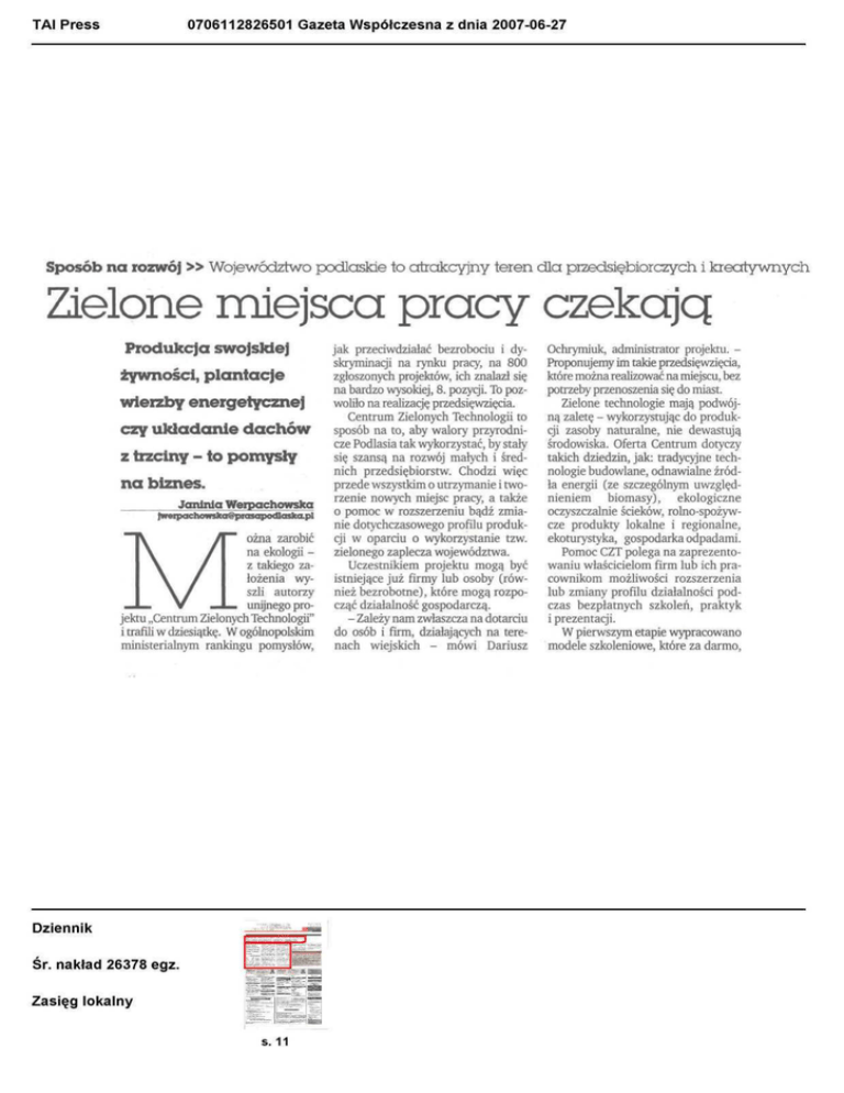 TAI Press 0706112826501 Gazeta Współczesna z dnia 2007-06-27 Sposób na rozwój » Województwo podlaskie to atrakcyjny teren dla przedsiębiorczych i kreatywnych Zielone miejsca pracy czekają Produkcja swojskie) żywności, plantacje wierzby energetycznej czy układanie dachów z trzciny - to pomysły na biznes. Janlnla Werpachowska ([email protected] ożna zarobić na ekologii z takiego założenia wyszli autorzy unijnego projektu „Centrum Zielonych Technologii" i trafili w dziesiątkę. W ogólnopolskim ministerialnym rankingu pomysłów, Dziennik Śr. nakład 26378 egz. Zasięg lokalny s. 11 jak przeciwdziałać bezrobociu i dyskryminacji na rynku pracy, na 800 zgłoszonych projektów, ich znalazł się na bardzo wysokiej, 8. pozycji. To pozwoliło na realizację przedsięwzięcia. Centrum Zielonych Technologii to sposób na to, aby walory przyrodnicze Podlasia tak wykorzystać, by stały się szansą na rozwój małych i średnich przedsiębiorstw. Chodzi więc przede wszystkim o utrzymanie i tworzenie nowych miejsc pracy, a także o pomoc w rozszerzeniu bądź zmianie dotychczasowego profilu produkcji w oparciu o wykorzystanie tzw. zielonego zaplecza województwa. Uczestnikiem projektu mogą być istniejące już firmy lub osoby (również bezrobotne), które mogą rozpocząć działalność gospodarczą. - Zależy nam zwłaszcza na dotarciu do osób i firm, działających na terenach wiejskich - mówi Dariusz Ochrymiuk, administrator projektu. Proponujemy im takie przedsięwzięcia, które można realizować na miejscu, bez potrzeby przenoszenia się do miast. Zielone technologie mają podwójną zaletę - wykorzystując do produkcji zasoby naturalne, nie dewastują środowiska. Oferta Centrum dotyczy takich dziedzin, jak: tradycyjne technologie budowlane, odnawialne źródła energii (ze szczególnym uwzględnieniem biomasy), ekologiczne oczyszczalnie ścieków, rolno-spożywcze produkty lokalne i regionalne, ekoturystyka, gospodarka odpadami. Pomoc CZT polega na zaprezentowaniu właścicielom firm lub ich pracownikom możliwości rozszerzenia lub zmiany profilu działalności podczas bezpłatnych szkoleń, praktyk i prezentacji. W pierwszym etapie wypracowano modele szkoleniowe, które za darmo, 0706112826502 Gazeta Współczesna z dnia 2007-06-27 TAI Press na specjalnej platformie internetowej, udostępniane są wszystkim zainteresowanym. - Chodzi o to, aby człowiek zainteresowany na przykład zakładaniem przydomowych oczyszczalni ścieków dowiedział się z takiej platformy, ilu ludzi oczekuje na taki produkt i usługę. Aby wiedział także, w jaki sposób i gdzie może przeszkolić pracowników, kto mu udzieli pomocy, ile to wszystko będzie kosztowało - tłumaczy Ochrymiuk. A , rojekt Centrum Zielonych Technologii realizowany jest w ramach • •pejskiego programu EQUAL. 5 Wspólnotowa EQUAL, ; to realizowany w krajach UE program, którego jednym z celów jest przeciwdziałanie bezrobociu. Finansowany jest z funduszy unijnych (75 proc.) oraz - w przypadku PołsM - z funduszy Ministerstwa Gospodarki (25 proc.). Jego wartość to 6 milionów zł Projekt realizowany jest przez Podlaską Stację Przyrodniczą Narew przy współpracy z partnerami: Wojewódzkim Urzędem Pracy w Białymstoku, spółką Instytut Zrównoważonego Rozwoju, Wyższą Szkołą Agrobiznesu w Łomży, spółkami Ekoton i Biawat, Wszyscy zainteresowani mogą zgłaszać się do biura projektu Centrum Zielonych Technologa, ul, Legionowa 28 tok. 607, Białystok, tel./fax 085 7499960, e-mafl: [email protected]. Dziennik - Śr. nakład 26378 egz. \ Zasięg lokalny S. 11 «B