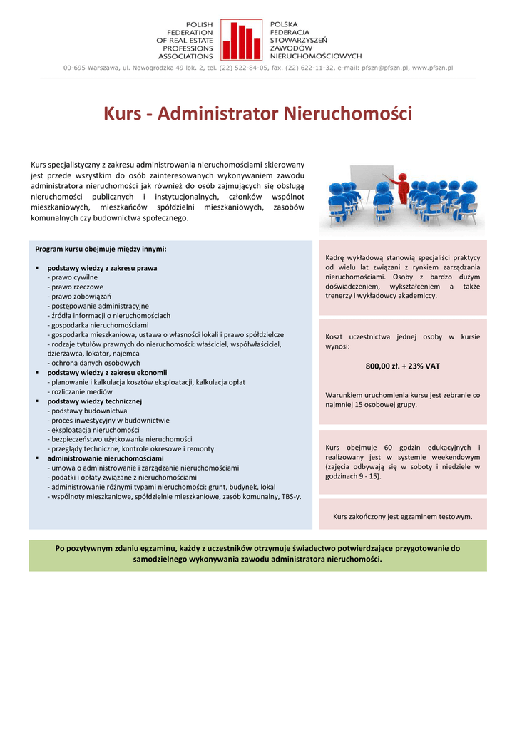 00-695 Warszawa, ul. Nowogrodzka 49 lok. 2, tel. (22) 522-84-05, fax. (22) 622-11-32, e-mail: [email protected], www.pfszn.pl _________________________________________________________________________________________________________________ Kurs - Administrator Nieruchomości Kurs specjalistyczny z zakresu administrowania nieruchomościami skierowany jest przede wszystkim do osób zainteresowanych wykonywaniem zawodu administratora nieruchomości jak również do osób zajmujących się obsługą nieruchomości publicznych i instytucjonalnych, członków wspólnot mieszkaniowych, mieszkańców spółdzielni mieszkaniowych, zasobów komunalnych czy budownictwa społecznego. Program kursu obejmuje między innymi:     podstawy wiedzy z zakresu prawa - prawo cywilne - prawo rzeczowe - prawo zobowiązań - postępowanie administracyjne - źródła informacji o nieruchomościach - gospodarka nieruchomościami - gospodarka mieszkaniowa, ustawa o własności lokali i prawo spółdzielcze - rodzaje tytułów prawnych do nieruchomości: właściciel, współwłaściciel, dzierżawca, lokator, najemca - ochrona danych osobowych podstawy wiedzy z zakresu ekonomii - planowanie i kalkulacja kosztów eksploatacji, kalkulacja opłat - rozliczanie mediów podstawy wiedzy technicznej - podstawy budownictwa - proces inwestycyjny w budownictwie - eksploatacja nieruchomości - bezpieczeństwo użytkowania nieruchomości - przeglądy techniczne, kontrole okresowe i remonty administrowanie nieruchomościami - umowa o administrowanie i zarządzanie nieruchomościami - podatki i opłaty związane z nieruchomościami - administrowanie różnymi typami nieruchomości: grunt, budynek, lokal - wspólnoty mieszkaniowe, spółdzielnie mieszkaniowe, zasób komunalny, TBS-y. Kadrę wykładową stanowią specjaliści praktycy od wielu lat związani z rynkiem zarządzania nieruchomościami. Osoby z bardzo dużym doświadczeniem, wykształceniem a także trenerzy i wykładowcy akademiccy. Koszt uczestnictwa jednej osoby w kursie wynosi: 800,00 zł. + 23% VAT Warunkiem uruchomienia kursu jest zebranie co najmniej 15 osobowej grupy. Kurs obejmuje 60 godzin edukacyjnych i realizowany jest w systemie weekendowym (zajęcia odbywają się w soboty i niedziele w godzinach 9 - 15). Kurs zakończony jest egzaminem testowym. Po pozytywnym zdaniu egzaminu, każdy z uczestników otrzymuje świadectwo potwierdzające przygotowanie do samodzielnego wykonywania zawodu administratora nieruchomości.