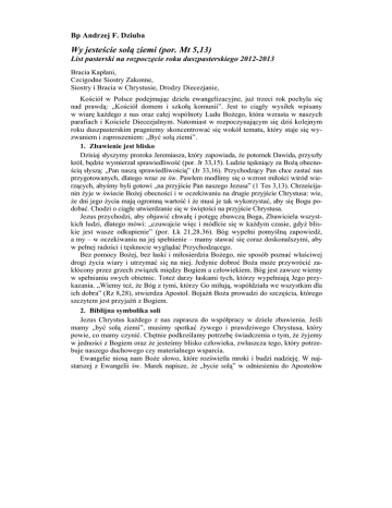 Bp Andrzej F. Dziuba Wy jesteście solą ziemi (por. Mt 5,13) List pasterski na rozpoczęcie roku duszpasterskiego 2012-2013 Bracia Kapłani, Czcigodne Siostry Zakonne, Siostry i Bracia w Chrystusie, Drodzy Diecezjanie, Kościół w Polsce podejmując dzieła ewangelizacyjne, już trzeci rok pochyla się nad prawdą: „Kościół domem i szkołą komunii”. Jest to ciągły wysiłek wpisany w wiarę każdego z nas oraz całej wspólnoty Ludu Bożego, która wzrasta w naszych parafiach i Kościele Diecezjalnym. Natomiast w rozpoczynającym się dziś kolejnym roku duszpasterskim pragniemy skoncentrować się wokół tematu, który staje się wyzwaniem i zaproszeniem: „Być solą ziemi”. 1. Zbawienie jest blisko Dzisiaj słyszymy proroka Jeremiasza, który zapowiada, że potomek Dawida, przyszły król, będzie wymierzał sprawiedliwość (por. Jr 33,15). Ludzie tęskniący za Bożą obecnością słyszą: „Pan naszą sprawiedliwością” (Jr 33,16). Przychodzący Pan chce zastać nas przygotowanych, dlatego wraz ze św. Pawłem modlimy się o wzrost miłości wśród wierzących, abyśmy byli gotowi „na przyjście Pan naszego Jezusa” (1 Tes 3,13). Chrześcijanin żyje w świecie Bożej obecności i w oczekiwaniu na drugie przyjście Chrystusa: wie, że dni jego życia mają ogromną wartość i że musi je tak wykorzystać, aby się Bogu podobać. Chodzi o ciągłe utwierdzanie się w świętości na przyjście Chrystusa. Jezus przychodzi, aby objawić chwałę i potęgę zbawczą Boga, Zbawiciela wszystkich ludzi, dlatego mówi: „czuwajcie więc i módlcie się w każdym czasie, gdyż bliskie jest wasze odkupienie” (por. Łk 21,28.36). Bóg wypełni pomyślną zapowiedź, a my – w oczekiwaniu na jej spełnienie – mamy stawać się coraz doskonalszymi, aby w pełnej radości i tęsknocie wyglądać Przychodzącego. Bez pomocy Bożej, bez łaski i miłosierdzia Bożego, nie sposób poznać właściwej drogi życia wiary i utrzymać się na niej. Jedynie dobroć Boża może przywrócić zakłócony przez grzech związek między Bogiem a człowiekiem. Bóg jest zawsze wierny w spełnianiu swych obietnic. Toteż darzy łaskami tych, którzy wypełniają Jego przykazania. „Wiemy też, że Bóg z tymi, którzy Go miłują, współdziała we wszystkim dla ich dobra” (Rz 8,28), stwierdza Apostoł. Bojaźń Boża prowadzi do szczęścia, którego szczytem jest przyjaźń z Bogiem. 2. Biblijna symbolika soli Jezus Chrystus każdego z nas zaprasza do współpracy w dziele zbawienia. Jeśli mamy „być solą ziemi”, musimy spotkać żywego i prawdziwego Chrystusa, który powie, co mamy czynić. Chętnie podkreślamy potrzebę świadczenia o tym, że żyjemy w jedności z Bogiem oraz że jesteśmy blisko człowieka, zwłaszcza tego, który potrzebuje naszego duchowego czy materialnego wsparcia. Ewangelie niosą nam Boże słowo, które rozświetla mroki i budzi nadzieję. W najstarszej z Ewangelii św. Marek napisze, że „bycie solą” w odniesieniu do Apostołów 38 Bp Andrzej F. Dziuba oznacza ducha ustawicznego zapału i szczerego oraz silnego przywiązania do Ewangelii Chrystusa. Podobnie i współcześni apostołowie pozbawieni przymiotów prawdziwych ewangelizatorów nie będą mogli odnaleźć tych właściwości w świecie i sami przestaną być dla świata tym, czym być powinni. Uczniowie Pana mają budować prawdziwy pokój między sobą i nieść prawdę, pomimo przeciwności. Oni nie lękają się zepsucia świata, ale przemieniają go w duchu miłości i szacunku dla najsłabszych (por. Mk 9,49-50). W Ewangelii św. Łukasza Apostołowie przez swoją naukę i przykład osobistego życia, mają być solą, zapewniającą zdrowie moralne całej ludzkości. Otóż jeśli sól straci swoje właściwości, jakże będzie spełniać funkcję wyznaczoną jej przez samego Stwórcę? Posłany przez Chrystusa autentycznie żyje słowem Bożym i z prawdziwą radością dzieli się nim z innymi. Tylko ci, którzy „mają uszy do słuchania” (por. Łk 14,35), czyli łaskę zrozumienia sensu wymagań Jezusa, będą w stanie pojąć Jego słowa. Odpowiedzią na dar życia i wiary powinna być postawa stałej i konsekwentnej miłości do Chrystusa (por. Łk 14,34-35). Ewangelia Mateuszowa pokazuje, że sól jest tym, co zabezpiecza potrawy od zepsucia i nadaje im smak. Otóż taką rolę w stosunku do całego świata spełniają ludzie słuchający nakazów Chrystusa: oni decydują o określonej, wysokiej wartości świata i chronią świat przed zagładą. Jeśli przestaną zachowywać pouczenia Chrystusa, staną się jak sól zwietrzała, a więc nie nadająca się już do przyprawiania i konserwowania potraw. Sól taką, pozbawioną swoich właściwości, wyrzuca się jako bezużyteczną; nikt już na nią nie zważa, zostaje zdeptana przez ludzi. Podobny los czeka też tych, którzy sprzeniewierzą się posłannictwu, jakie Bóg im przekazał. Przywoływanie tutaj słowa Jezusa o byciu solą ziemi wskazują, że uczeń Chrystusa gotów jest przyjąć ducha ofiary, oczyszczenia i żyć w wolności od skażenia wpływem świata (por. Mt 5,13). Możemy zmieniać świat i przekonywać niezdecydowanych i błądzących. Bóg obdarzył nas swoim słowem, które umiejętnie przekazywane budzi wiarę i umacnia nadzieję. Ma ono mieć wydźwięk płynący z miłości bliźniego (por. Ef 4,29) i przynosić pożytek (por. Mt 5,13; Mk 9,50), tzn. pociągać, zyskiwać zwolenników, zwłaszcza gdy poganie pytają o zasady nowej wiary (por. 1 P 3,15). Wzorem w przekonywaniu jest dla nas św. Paweł, który – jak widać z opisów w Dziejach Apostolskich – trafiał słowem do umysłów rozmówców przez to, że stawał się „wszystkim we wszystkich” (1 Kor 9,22). Apostoł narodów pozyskiwał świat dla Chrystusa poprzez wytrwałe i skuteczne oddziaływanie na innych, poprzez mowę przenikniętą prawdą i sensem (por. Kol 4,2-6). 3. Zobowiązania chrześcijanina Mateuszowe 