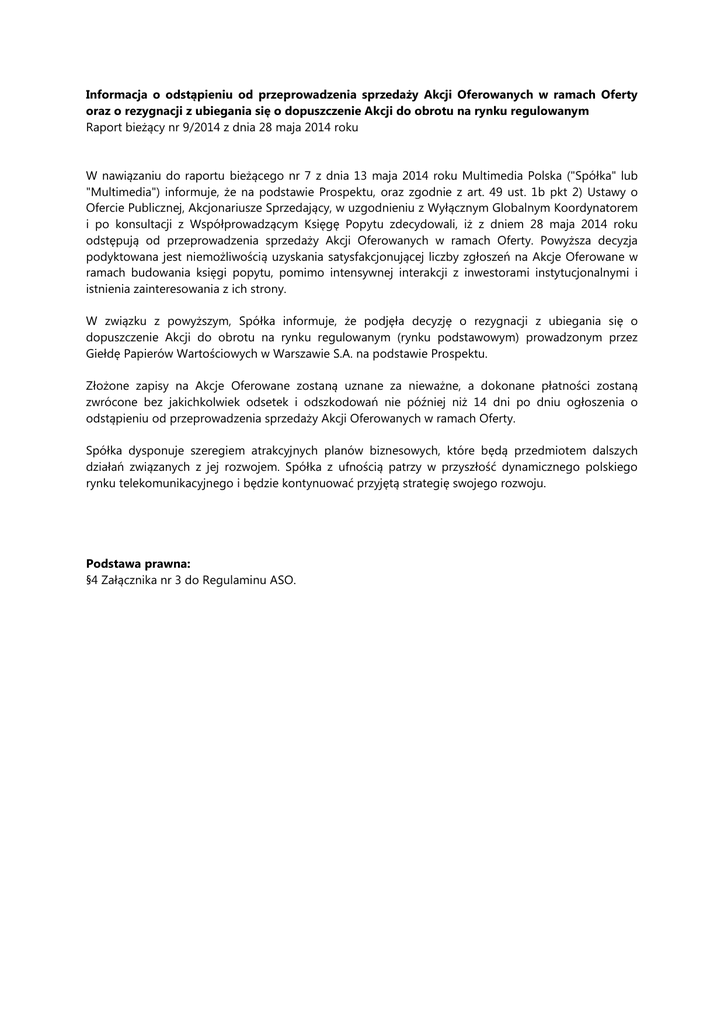 W nawiązaniu do raportu bieżącego nr 7 z dnia 13 maja 2014 roku Multimedia Polska ("Spółka" lub