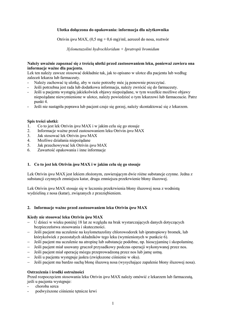 Ulotka dołączona do opakowania: informacja dla użytkownika Otrivin ipra MAX, (0,5 mg + 0,6 mg)/ml, aerozol do nosa, roztwór Xylometazolini hydrochloridum + Ipratropii bromidum Należy uważnie zapoznać się z treścią ulotki przed zastosowaniem leku, ponieważ zawiera ona informacje ważne dla pacjenta. Lek ten należy zawsze stosować dokładnie tak, jak to opisano w ulotce dla pacjenta lub według zaleceń lekarza lub farmaceuty. - Należy zachować tę ulotkę, aby w razie potrzeby móc ją ponownie przeczytać. - Jeśli potrzebna jest rada lub dodatkowa informacja, należy zwrócić się do farmaceuty. - Jeśli u pacjenta wystąpią jakiekolwiek objawy niepożądane, w tym wszelkie możliwe objawy niepożądane niewymienione w ulotce, należy powiedzieć o tym lekarzowi lub farmaceucie. Patrz punkt 4. - Jeśli nie nastąpiła poprawa lub pacjent czuje się gorzej, należy skontaktować się z lekarzem. Spis treści ulotki: 1. Co to jest lek Otrivin ipra MAX i w jakim celu się go stosuje 2. Informacje ważne przed zastosowaniem leku Otrivin ipra MAX 3. Jak stosować lek Otrivin ipra MAX 4. Możliwe działania niepożądane 5. Jak przechowywać lek Otrivin ipra MAX 6. Zawartość opakowania i inne informacje 1. Co to jest lek Otrivin ipra MAX i w jakim celu się go stosuje Lek Otrivin ipra MAX jest lekiem złożonym, zawierającym dwie różne substancje czynne. Jedna z substancji czynnych zmniejsza katar, druga zmniejsza przekrwienie błony śluzowej. Lek Otrivin ipra MAX stosuje się w leczeniu przekrwienia błony śluzowej nosa z wodnistą wydzieliną z nosa (katar), związanych z przeziębieniem. 2. Informacje ważne przed zastosowaniem leku Otrivin ipra MAX Kiedy nie stosować leku Otrivin ipra MAX U dzieci w wieku poniżej 18 lat ze względu na brak wystarczających danych dotyczących bezpieczeństwa stosowania i skuteczności. Jeśli pacjent ma uczulenie na ksylometazoliny chlorowodorek lub ipratropiowy bromek, lub którykolwiek z pozostałych składników tego leku (wymienionych w punkcie 6). Jeśli pacjent ma uczulenie na atropinę lub substancje podobne, np. hioscyjaminę i skopolaminę. Jeśli pacjent miał usuwany gruczoł przysadkowy podczas operacji wykonywanej przez nos. Jeśli pacjent miał operację mózgu przeprowadzoną przez nos lub jamę ustną. Jeśli u pacjenta występuje jaskra (zwiększone ciśnienie w oku). Jeśli pacjent ma bardzo suchą błonę śluzową nosa (wysychające zapalenie błony śluzowej nosa). Ostrzeżenia i środki ostrożności Przed rozpoczęciem stosowania leku Otrivin ipra MAX należy omówić z lekarzem lub farmaceutą, jeśli u pacjenta występuje: choroba serca podwyższone ciśnienie tętnicze krwi 1 - cukrzyca nadczynność tarczycy trudność w oddawaniu moczu i (lub) rozrost gruczołu krokowego jaskra z wąskim kątem przesączania tendencja do krwawień z nosa niedrożność jelita (jelita cienkiego) mukowiscydoza łagodny guz nadnerczy wytwarzający duże ilości adrenaliny i noradrenaliny (guz chromochłonny) lub szczególna wrażliwość na adrenalinę lub noradrenalinę, ponieważ u pacjenta mogą wówczas wystąpić zawroty głowy, drżenie, przyspieszona czynność serca, zwiększone ciśnienie tętnicze krwi i bezsenność. Mogą wystąpić reakcje nadwrażliwości typu natychmiastowego (reakcje alergiczne). Objawami mogą być: swędząca, czerwona wysypka ze stanem zapalnym skóry (pokrzywka), trudności w oddychaniu lub mówieniu, trudności w przełykaniu spowodowane obrzękiem warg, twarzy lub gardła. Objawy te mogą występować pojedynczo lub wszystkie razem jako ciężka reakcja alergiczna. Jeśli to nastąpi, należy natychmiast PRZERWAĆ stosowanie leku Otrivin ipra MAX (patrz punkt 4). Leku Otrivin ipra MAX nie należy stosować dłużej niż przez 7 kolejnych dni. Jeśli objawy utrzymują się, należy skonsultować się z lekarzem. Przedłużone lub nadmierne stosowanie leku może spowodować nawrót lub nasilenie objawów zatkania nosa oraz obrzęk błony śluzowej nosa. Należy unikać rozpylania leku Otrivin ipra MAX w pobliżu oczu. Jeśli lek dostanie się do oczu, należy dokładnie przemyć je zimną wodą. Może wystąpić przemijające niewyraźne widzenie i podrażnienie, ból i zaczerwienienie oczu. W takiej sytuacji należy poradzić się lekarza. Może również wystąpić zaostrzenie jaskry z wąskim kątem przesączania. Dzieci i młodzież Nie zaleca się stosowania leku Otrivin ipraMAX u dzieci i młodzieży w wieku poniżej 18 lat ze względu na brak odpowiednich danych dotyczących bezpieczeństwa stosowania i skuteczności. Otrivin ipra MAX a inne leki Należy powiedzieć lekarzowi lub farmaceucie o wszystkich lekach przyjmowanych przez pacjenta obecnie lub ostatnio, a także o lekach, które pacjent planuje stosować. Szczególnie ważne jest, aby zwrócić uwagę na: - - inhibitory mono aminooksydazy (stosowane w leczeniu depresji). Jeśli pacjent przyjmuje obecnie takie leki lub przyjmował je w ciągu ostatnich dwóch tygodni, może wystąpić znaczne podwyższenie ciśnienia tętniczego krwi, trój- i czteropierścieniowe leki przeciwdepresyjne (jeśli pacjent przyjmuje obecnie takie leki lub przyjmował je w ciągu ostatnich dwóch tygodni), leki stosowane w chorobie lokomocyjnej (leki zawierające substancje o działaniu cholinolitycznym), leki stosowane w zaburzeniach jelitowych (szczególnie leki zmniejszające perystaltykę jelit), (leki zawierajace substancje o działaniu cholinolitycznym). Jeśli pacjent stosuje którykolwiek z wyżej wymienionych leków, powinien skonsultować się z lekarzem przed zastosowaniem leku Otrivin ipra MAX. Ciąża i karmienie piersią Bez zalecenia lekarza leku Otrivin ipra MAX nie należy stosować w okresie ciąży. W okresie karmienia piersią nie należy stosować leku Otrivin ipra MAX, chyba że lekarz zdecyduje, że korzyści ze stosowania leku przewyższają potencjalne ryzyko dla dziecka. Jeśli pacjentka jest w ciąży lub karmi piers