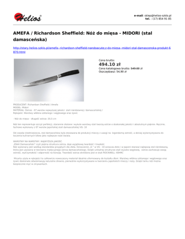 e-mail: [email protected] tel. : (17) 854 91 85 AMEFA / Richardson Sheffield: Nóż do mięsa - MIDORI (stal damasceńska) http://stary.helios-szklo.pl/amefa--richardson-sheffield-nandoacute;z-do-miesa--midori-stal-damascenska-produkt-6 870.html Cena brutto: 494.10 zł Cena katalogowa brutto: 549.00 zł Oszczędzasz: 54,90 zł PRODUCENT: Richardson Sheffield / Amefa MODEL: Midori MATERIAŁ: Ostrze - 67 warstw najwyższej jakości stali nierdzewnej / damasceńskiej / Rękojeść: Warstwy włókna szklanego i węglowego oraz żywic - Nóż do mięsa – długość ostrza: 20,5 cm Nóż ten reprezentuje szczyt perfekcji, starannie złożone i wykute warstwy stali tworzą ostrze o doskonałej jakości i absolutnym pięknie. Ręcznie, fachowo wykonany z 67 warstw japońskiej stali damasceńskiej VG- 10 Od czasów średniowiecza, stal damasceńska była stosowana do produkcji mieczy z uwagi na legendarną ostrość, a dzisiaj wykorzystywana do toczenia kulinarnych bitew jako najlepsze noże świata. WARSTWY NA WARSTWY. NAJWYŻSZA JAKOŚĆ. „Efekt Damasceński” czyli piękna struktura ostrza, daje wyjątkową twardość i trwałość. Nóż wykonany jest według standardów przyjętych dla złota. Oznaczenie „G " w VG - 10 oznacza złoto i w Japonii stanowi najlepszą stal nierdzewną, która jest używana w tworzeniu tradycyjnego ostrza damasceńskiego. Dzięki unikalnej strukturze stali wysoko węglowej, ostrze zachowuje swoją ostrość, wytrzymałość i odporność na korozję. Twardość ostrza określana jest w skali ROCKWELL: 60HRC Micarta użyta w rękojeści to całkowicie nowoczesny materiał idealnie uformowany do kształtu dłoni. Warstwy włókna szklanego i węglowego oraz żywic doskonale odwzorowują naturalne drewno, pierwotnie wykorzystywane w tworzeniu japońskich mieczy i noży. Dzięki temu nóż można bezpiecznie myć w zmywarkach.