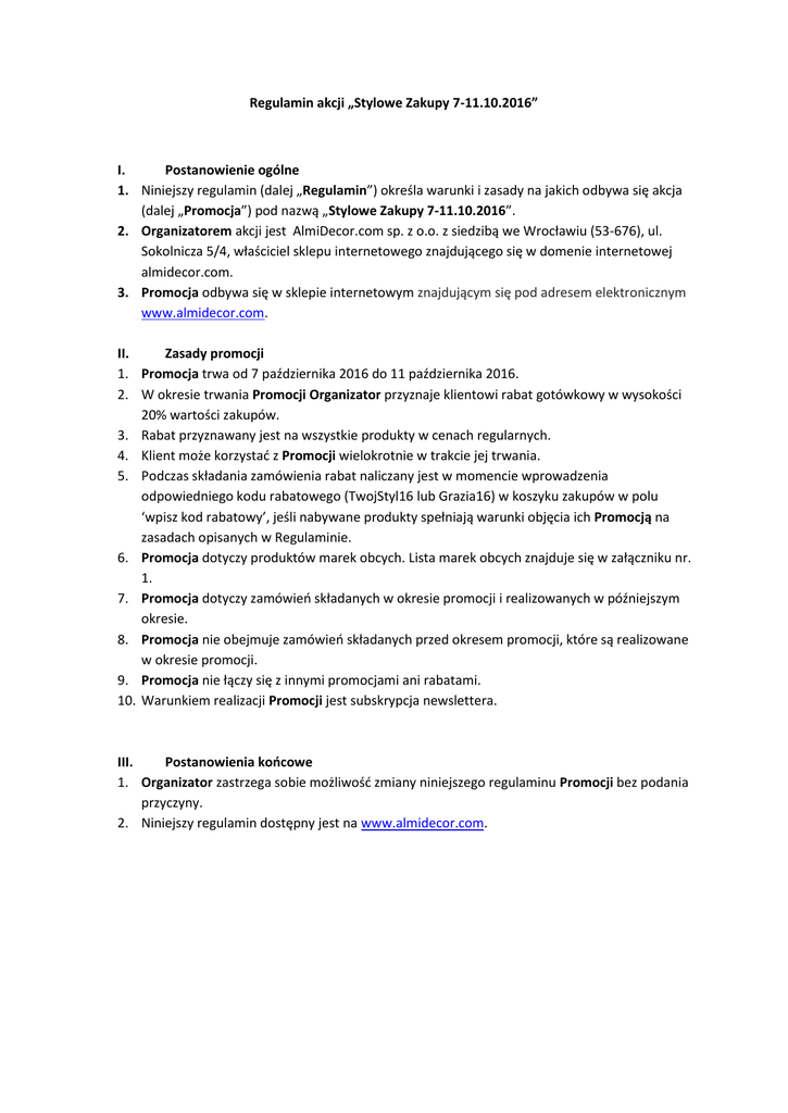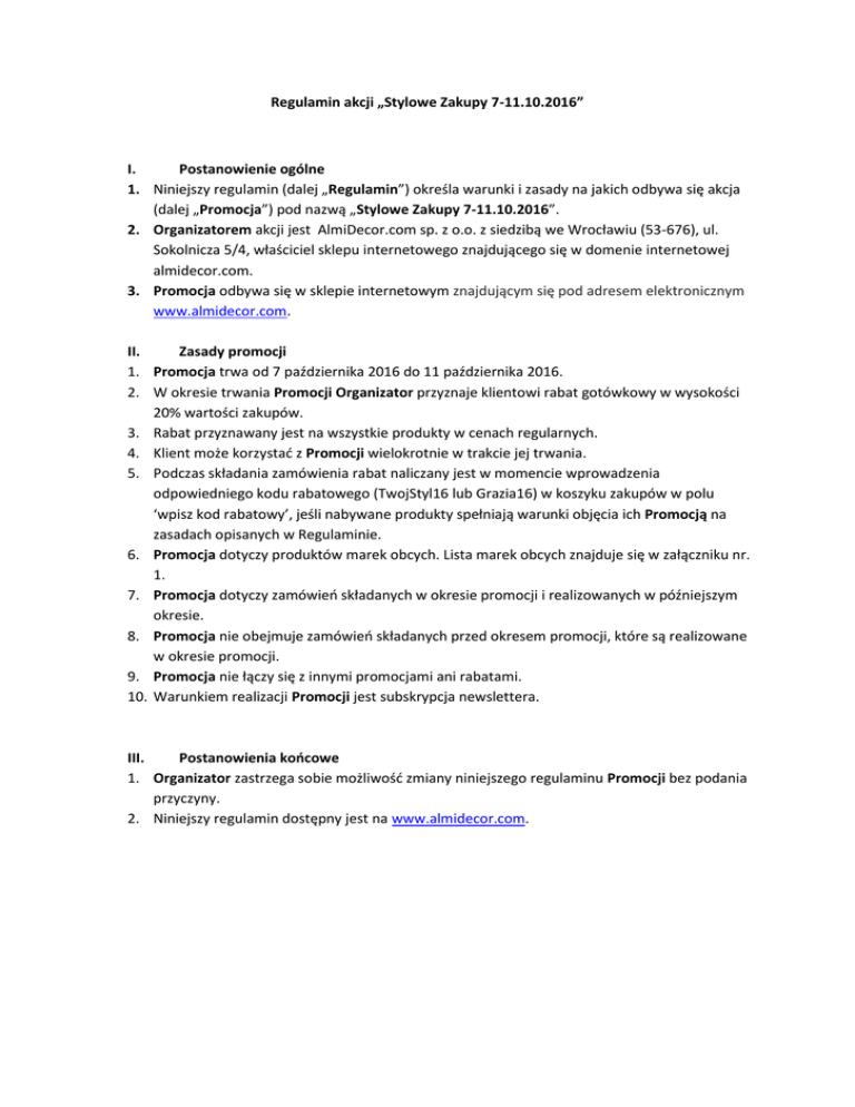 Regulamin akcji „Stylowe Zakupy 7-11.10.2016” I. Postanowienie ogólne 1. Niniejszy regulamin (dalej „Regulamin”) określa warunki i zasady na jakich odbywa się akcja (dalej „Promocja”) pod nazwą „Stylowe Zakupy 7-11.10.2016”. 2. Organizatorem akcji jest AlmiDecor.com sp. z o.o. z siedzibą we Wrocławiu (53-676), ul. Sokolnicza 5/4, właściciel sklepu internetowego znajdującego się w domenie internetowej almidecor.com. 3. Promocja odbywa się w sklepie internetowym znajdującym się pod adresem elektronicznym www.almidecor.com. II. Zasady promocji 1. Promocja trwa od 7 października 2016 do 11 października 2016. 2. W okresie trwania Promocji Organizator przyznaje klientowi rabat gotówkowy w wysokości 20% wartości zakupów. 3. Rabat przyznawany jest na wszystkie produkty w cenach regularnych. 4. Klient może korzystad z Promocji wielokrotnie w trakcie jej trwania. 5. Podczas składania zamówienia rabat naliczany jest w momencie wprowadzenia odpowiedniego kodu rabatowego (TwojStyl16 lub Grazia16) w koszyku zakupów w polu ‘wpisz kod rabatowy’, jeśli nabywane produkty spełniają warunki objęcia ich Promocją na zasadach opisanych w Regulaminie. 6. Promocja dotyczy produktów marek obcych. Lista marek obcych znajduje się w załączniku nr. 1. 7. Promocja dotyczy zamówieo składanych w okresie promocji i realizowanych w późniejszym okresie. 8. Promocja nie obejmuje zamówieo składanych przed okresem promocji, które są realizowane w okresie promocji. 9. Promocja nie łączy się z innymi promocjami ani rabatami. 10. Warunkiem realizacji Promocji jest subskrypcja newslettera. III. Postanowienia koocowe 1. Organizator zastrzega sobie możliwośd zmiany niniejszego regulaminu Promocji bez podania przyczyny. 2. Niniejszy regulamin dostępny jest na www.almidecor.com. Załącznik nr 1 Lista marek obcych objętych Promocją 1. A’MIOU HOME 2. APELT 3. ARTWOOD 4. BIEDERLACK 5. BLOMUS 6. BRAHMAN’S HOME 7. CANE-LINE 8. CHRISTIAN LACROIX 9. DESIGNERS GUILD 10. HOTDOOR 11. IKER 12. JOOP! 13. LA ROCHERE 14. MY ALPACA 15. NINA RICCI 16. NOTRE MONDE 17. OFYR 18. PHILIPIAK 19. PHILIPPI 20. POLSKI STÓŁ 21. RALPH LAUREN 22. RONDO 23. ROMO 24. TAR DESIGN 25. VILLA NOVA 26. ZOFFANY