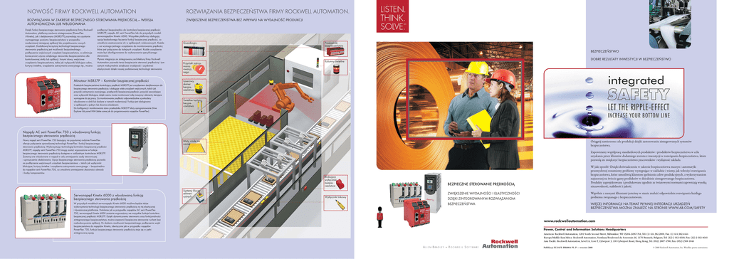 NOWOŚĆ FIRMY ROCKWELL AUTOMATION ROZWIĄZANIA BEZPIECZEŃSTWA FIRMY ROCKWELL AUTOMATION. ROZWIĄZANIA W ZAKRESIE BEZPIECZNEGO STEROWANIA PRĘDKOŚCIĄ — WERSJA AUTONOMICZNA LUB WBUDOWANA ZWIĘKSZENIE BEZPIECZEŃSTWA BEZ WPŁYWU NA WYDAJNOŚĆ PRODUKCJI Dzięki funkcji bezpiecznego sterowania prędkością firmy Rockwell Automation, platformy zarówno zintegrowane (PowerFlex i Kinetix), jak i dedykowana (MSR57P) pozwalają na uzyskanie wymaganego poziomu bezpieczeństwa w przypadku modernizacji istniejącej aplikacji lub projektowaniu nowych urządzeń. Dodatkową korzyścią technologii bezpiecznego sterowania prędkością jest możliwość bezpośredniego podłączenia wejściowych urządzeń bezpieczeństwa, co eliminuje konieczność użycia odrębnego sterownika bezpieczeństwa dla kontrolowanej strefy lub aplikacji. Innymi słowy, wejściowe urządzenia bezpieczeństwa, takie jak wyłączniki blokujące osłon, kurtyny świetlne, urządzenia zatrzymania awaryjnego itp., można podłączyć bezpośrednio do kontrolera bezpiecznej prędkości MSR57P, napędu AC serii PowerFlex lub do przyszłych modeli serwonapędów Kinetix 6000. Wszystkie platformy obsługują opcję kaskadowego łączenia funkcji bezpiecznej prędkości, co umożliwia zastosowanie ich w aplikacjach wieloosiowych. Każda z osi wymaga jednego urządzenia do monitorowania prędkości, które jest połączone do kolejnych urządzeń. Każde urządzenie może być skonfigurowane do wykonywania specyficznego sterowania. Płynna integracja ze zintegrowaną architekturą firmy Rockwell Automation pozwala teraz bezpiecznie sterować prędkością i tym samym maksymalnie zwiększać wydajność i uzyskiwać elastyczność dzięki naszej podstawowej technologii sterowania. Minotaur MSR57P – Kontroler bezpiecznej prędkości Przekaźnik bezpieczeństwa kontrolujący prędkość MSR57P jest urządzeniem dedykowanym do bezpiecznego sterowania prędkością i obsługuje wiele urządzeń wejściowych, takich jak przyciski zatrzymania awaryjnego, przełączniki bezpiecznej prędkości, przyciski zezwalające oraz wyłączniki blokujące, dzięki czemu może monitorować całą maszynę i elementy sterujące wymagane do jej pracy. Za monitorowanie prędkości odpowiedzialne są enkodery wbudowane w silnik lub dodane w ramach modernizacji. Funkcja jest obsługiwana w aplikacjach z jednym lub dwoma enkoderami. Do konfiguracji i monitorowania stanu przekaźnika MSR57P służy oprogramowanie Drive Explorer lub panel HIM (takie same jak do programowania napędów PowerFlex). GuardLogix Przekaźniki bezpieczeństwa BEZPIECZEŃSTWO Przyciski zatrzymania awaryjnego DOBRE REZULTATY INWESTYCJI W BEZPIECZEŃSTWO Kolumny świetlne integrated Laserowy skaner bezpieczeństwa SAFETY Świetlne kurtyny bezpieczeństwa LET THE RIPPLE-EFFECT INCREASE YOUR BOTTOM LINE Napędy AC serii PowerFlex 750 z wbudowaną funkcją bezpiecznego sterowania prędkością Nowy napęd serii PowerFlex 750 bazujący na popularnej rodzinie PowerFlex oferuje połączenie sprawdzonej technologii PowerFlex i funkcji bezpiecznego sterowania prędkością. Wykorzystując technologię kontrolera bezpiecznej prędkości MSR57P, napędy serii PowerFlex 750 mogą zostać wyposażone w funkcje bezpiecznego sterowania prędkością dostępne w oddzielnym kontrolerze MSR57P. Zostaną one wbudowane w napęd w celu zmniejszenia szafy sterowniczej i uproszczenia okablowania. Opcja bezpiecznego sterowania prędkością pozwala na podłączenie wejściowych urządzeń bezpieczeństwa – takich jak wyłączniki blokujące, kurtyny świetlne i urządzenia zatrzymania awaryjnego – bezpośrednio do napędów serii PowerFlex 750, co umożliwia zmniejszenie złożoności obwodu i liczby komponentów. Maty czułe na nacisk Osiągnij zamierzone cele produkcji dzięki zastosowaniu zintegrowanych systemów bezpieczeństwa. Zapewniamy współpracę standardowych produktów i produktów bezpieczeństwa w celu uzyskania przez klientów dodatniego zwrotu z inwestycji w rozwiązania bezpieczeństwa, które pozwolą im zwiększyć bezpieczeństwo pracowników i wydajność zakładu. Blokujące wyłączniki bezpieczeństwa Serwonapęd Kinetix 6000 z wbudowaną funkcją bezpiecznego sterowania prędkością W przyszłych modelach serwonapędu Kinetix 6000 możliwe będzie także wykorzystanie technologii bezpiecznego sterowania prędkością na tej elastycznej i dynamicznej platformie. Podobnie jak w przypadku napędów AC serii PowerFlex 750, serwonapęd Kinetix 6000 zostanie wyposażony we wszystkie funkcje kontrolera bezpiecznej prędkości MSR57P. Dzięki dynamicznemu sterowaniu oraz funkcjonalności zintegrowanego bezpieczeństwa, można zapewnić bezpieczne sterowanie ruchem bez rozbudowywania aplikacji. Po dodaniu możliwości bezpośredniego podłączenia wejść bezpieczeństwa do napędów Kinetix, identycznie jak w przypadku napędów PowerFlex 750, funkcja bezpiecznego sterowania prędkością staje się w pełni zintegrowaną opcją. Systemy kluczy sekwencyjnych Wyłącznik linkowy BEZPIECZNE STEROWANIE PRĘDKOŚCIĄ ZWIĘKSZENIE WYDAJNOŚCI I ELASTYCZNOŚCI DZIĘKI ZINTEGROWANYM ROZWIĄZANIOM BEZPIECZEŃSTWA W jaki sposób? Dzięki doświadczeniu w zakresie bezpieczeństwa maszyn i automatyki przemysłowej rozumiemy problemy występujące w zakładzie i wiemy, jak wdrożyć rozwiązania bezpieczeństwa, które umożliwią klientom spełnienie celów produkcyjnych, z wykorzystaniem najszerszej na świecie gamy produktów w dziedzinie zintegrowanego bezpieczeństwa. Produkty zaprojektowane i produkowane zgodnie ze światowymi normami zapewniają wysoką niezawodność, stabilność i jakość. Wspólnie z naszymi klientami jesteśmy w stanie znaleźć odpowiednie rozwiązania każdego problemu związanego z bezpieczeństwem. WIĘCEJ INFORMACJI NA TEMAT PŁYNNEJ INTEGRACJI URZĄDZEŃ BEZPIECZEŃSTWA MOŻNA ZNALEŹĆ NA STRONIE WWW.AB.COM/SAFETY Publikacja EUSAFE-BR008A-PL-P — wrzesi