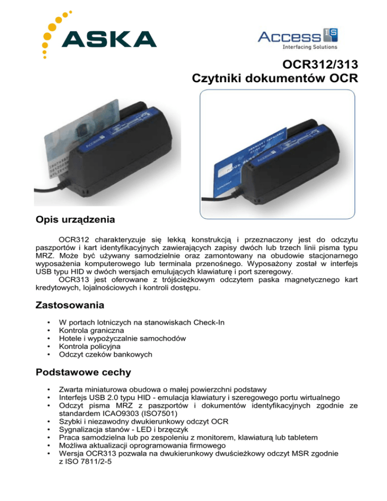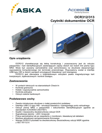 OCR312/313 Czytniki dokumentów OCR Opis urządzenia OCR312 charakteryzuje się lekką konstrukcją i przeznaczony jest do odczytu paszportów i kart identyfikacyjnych zawierających zapisy dwóch lub trzech linii pisma typu MRZ. Może być używany samodzielnie oraz zamontowany na obudowie stacjonarnego wyposażenia komputerowego lub terminala przenośnego. Wyposażony został w interfejs USB typu HID w dwóch wersjach emulujących klawiaturę i port szeregowy. OCR313 jest oferowane z trójścieżkowym odczytem paska magnetycznego kart kredytowych, lojalnościowych i kontroli dostępu. Zastosowania • • • • • W portach lotniczych na stanowiskach Check-In Kontrola graniczna Hotele i wypożyczalnie samochodów Kontrola policyjna Odczyt czeków bankowych Podstawowe cechy • • • • • • • • Zwarta miniaturowa obudowa o małej powierzchni podstawy Interfejs USB 2.0 typu HID - emulacja klawiatury i szeregowego portu wirtualnego Odczyt pisma MRZ z paszportów i dokumentów identyfikacyjnych zgodnie ze standardem ICAO9303 (ISO7501) Szybki i niezawodny dwukierunkowy odczyt OCR Sygnalizacja stanów - LED i brzęczyk Praca samodzielna lub po zespoleniu z monitorem, klawiaturą lub tabletem Możliwa aktualizacji oprogramowania firmowego Wersja OCR313 pozwala na dwukierunkowy dwuścieżkowy odczyt MSR zgodnie z ISO 7811/2-5 Dane techniczne OCR32x Otwory na śruby M3 x 5 mm Możliwości odczytu Standardowe czcionki OCR OCR-B oraz E13B Paszporty (MRP) 2 linie po 44 znaki Wizy (MRV) 2 linie po 44 znaki, 2 linie po 36 znaków Dokumenty podróżne 2 linie po 36 znaków, 3 linie po 30 znaków Dane z biletów Dane nadrukowane zgodnie z zaleceniami IATA 1720a, włączając ATB-1 typ 407-E, 1403M, OCRB, OCRA oraz kody IATA 2z5 Ogólne cechy Kolor Ciemnoszary Wymiary 110 x 46 x 52 mm Waga 100 g Interfejs komunikacyjny USB 2.0 HID (emulacja klawiatury i szeregowego portu wirtualnego) Zasilanie 5V DC, <250mA (przez port USB) Temperatura pracy 0 do 50°C Temperatura przechowywania -20 do 60°C Certyfikaty bezpieczeństwa UL 1950 / IEC950, CE EN55022 Class B, FCC Part15, Subpart B, Class A, BSMI EMC Class B, CE ASKA ul. Wędkarska 2A/B1, 04-869 Warszawa tel. 22 4985908/9, fax 22 6177020 e-mail: [email protected] www.kodykreskowe.com