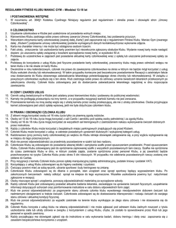 REGULAMIN FITNESS KLUBU MANIAC GYM – Młodzież 13-18 lat I POSTANOWIENIA WSTĘPNE 1. W rozumieniu art. 384§1 Kodeksu Cywilnego Niniejszy regulamin jest regulaminem i określa prawa i obowiązki stron „Umowy Członkowskiej” . 2. 3. 4. 5. 6. 7. 8. 9. II CZŁONKOSTWO Uzyskanie członkostwa w Klubie jest uzależnione od posiadania wolnych miejsc. Kierownictwo Klubu zastrzega sobie prawo odmowy zawarcia Umowy Członkowskiej, bez podawania przyczyn. Warunkiem otrzymania karty członkowskiej (zwanej dalej „Kartą”) jest zapoznanie się z regulaminem Fitness Klubu Maniac Gym (zwanego dalej „Klubem”) podpisanie umowy członkowskiej (podanie wymaganych danych kontaktowych)oraz wykonanie zdjęcia. Karta ma charakter imienny i nie może być odstąpiona osobom trzecim. Fakt utraty, zniszczenia lub uszkodzenia karty powinien być niezwłocznie zgłoszony obsłudze Klubu. Wydanie nowej karty może nastąpić dopiero po uiszczeniu opłaty związanej z kosztami sporządzenia nowej karty, w wysokości 50 zł. Podstawą do uczestnictwa w zajęciach jest posiadanie aktualnej karty członkowskiej wraz z opłatą lub uiszczenie jednorazowej opłaty za zajęcia. Podstawą do korzystania z usług Klubu jest fizyczne posiadanie karty członkowskiej, pracownicy klubu mają prawo odmówić wstępu na teren klubu o ile nie okaże on karty Klubu. Dwukrotnie w roku kalendarzowym, członek ma prawo do zawieszenia członkowstwa na okres w którym nie będzie mógł korzystać z usług Klubu wskutek choroby lub rekonwalescencji. W takim przypadku konieczne jest bezzwłoczne powiadomienie Recepcji o zaistniałym fakcie oraz dostarczenie do Klubu stosownego zaświadczenia lekarskiego potwierdzającego okres choroby lub rekonwalescencji. W związku z powyższym członkostwo wydłuża się o ten okres. Klub zastrzega sobie prawo do odmowy uznania świadczeń lekarskich przekazanych po zakończeniu choroby. Członek klubu zobowiązany jest do dostarczenia zaświadczenia lekarskiego najpóźniej w dniu rozpoczęcia zawieszenia. III CENY I ZAKRES USŁUG 10. Cennik usług świadczonych w Klubie jest ustalany przez kierownictwo klubu i podawany do publicznej wiadomości. 11. Karnety nie podlegają przesunięciu na inny termin, a w przypadku rezygnacji wartość karnetu nie jest zwracana. 12. Przeniesienie karnetu na inną osobę wiąże się z utratą karnetu przez osobę przekazującą, ale nie z utratą członkostwa. Osoba przyjmująca karnet zobowiązana jest uiścić opłatę wpisową, jeśli nie była dotychczas członkiem klubu. IV PRAWA I OBOWIĄZKI CZŁONKA KLUBU 13. Z siłowni mogą korzystać osoby od 16 roku życia tylko za pisemną zgodą rodziców. 14. Osoby od 13 do 16 roku życia mogą korzystać z sali Cardio i aerobiku pod opieką osoby pełnoletniej i za zgodą Klubu. 15. Osoby od 16 do 18 roku życia mogą korzystać ze wszystkich sal treningowych z zastrzeżeniem nakazu wykonywania ćwiczeń dobranych przez instruktora. 16. Każdy z członków Klubu może korzystać z bezpłatnych miejsc parkingowych znajdujących się przed Klubem. 17. Członek Klubu może korzystać z usług w zakresie posiadanych uprawnień klubowych i wykupionej kategorii usług. 18. Każdorazowo (przy pomocy karty członkowskiej) po wejściu do Klubu istnieje obowiązek zalogowania się, a przy wyjściu wylogowania się w miejscu do tego przeznaczonym. 19. Klub nie ponosi odpowiedzialności za przedmioty pozostawione w szatni lub bez nadzoru. 20. Członkowie Klubu są zobowiązani do posiadania własnej kłódki i zamykania szafki przed opuszczeniem przebieralni. Przed opuszczeniem Klubu, Członek Klubu zobowiązany jest do opróżnienia zajmowanej szafki z wszystkich pozostawionych tam rzeczy. Szafka nie opróżniona do czasu zamknięcia Klubu w dniu, w którym została zajęta, zostanie opróżniona przez personel Klubu, a jej zawartość będzie przechowywana na ryzyko Członka Klubu przez okres 5 dni roboczych. W przypadku nie odebrania pozostawionych rzeczy zostaną one oddane do Caritas. 21. Przy rezygnacji z karnetu Członek klubu ponosi opłatę manipulacyjną (opłatę administracyjną, podatek liniowy i podatek VAT). 22. Korzystający z usług Klubu zobowiązani są do higieny osobistej i czystości. 23. Ćwiczący powinni mieć ze sobą ręcznik, ubranie sportowe i buty treningowe na zmianę. 24. Członkowie Klubu zobowiązani są do dbania o porządek, stan urządzeń oraz sprzęt sportowy będący wyposażeniem klubu. Po zakończonych ćwiczeniach należy odłożyć sprzęt na miejsce do tego wyznaczone. Wszelkie uszkodzenia powinny być natychmiast zgłoszone w recepcji. 25. Osoby niszczące sprzęt i urządzenia, ponoszą odpowiedzialność materialną za wyrządzone szkody. 26. Każdy członek Klubu jest zobowiązany posiadać aktualne badania lekarskie, zezwalające na uprawianie ćwiczeń fizycznych, uzupełnienie informacji dotyczących schorzeń oraz poinformowanie instruktora w celu doboru odpowiednich form zajęć. 27. Klub nie ponosi odpowiedzialności za pogorszenie stanu zdrowia członka klubu wywołanego nieodpowiednim doborem ćwiczeń lub nadmiernymi obciążeniami w trakcie ćwiczeń. Członkowie zobowiązani są do dostosowania intensywności i rodzaju ćwiczeń do swojego stanu zdrowia i aktualnej kondycji fizycznej. 28. Klub nie ponosi odpowiedzialności za wypadki zaistniałe na terenie klubu wynikające ze złego stanu zdrowia i nie stosowania się do regulaminu. 29. Członek Klubu korzysta z usług klubu na własną odpowiedzialność i nie może zgłaszać pod adresem klubu żadnych roszczeń z tytułu uszkodzenia ciała lub utraty zdrowia w związku z korzystaniem z usług Klubu, chyba, że zostało to spowodowane przez Klub lub jego personel w sposób zawiniony. 30. Każdy początkujący ma obowiązek zgłosić się do instruktora w celu wykonania badań, doboru treningu i diety oraz zapoznania się z zasadami bezpieczeństwa korzystania z urządzeń. 31. W razie niejasności co do w
