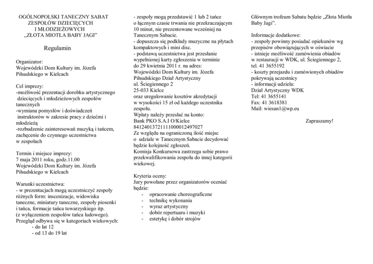 OGÓLNOPOLSKI TANECZNY SABAT ZESPOŁÓW DZIECIĘCYCH I MŁODZIEŻOWYCH ,,ZŁOTA MIOTŁA BABY JAGI” Regulamin Organizator: Wojewódzki Dom Kultury im. Józefa Piłsudskiego w Kielcach Cel imprezy: -możliwość prezentacji dorobku artystycznego dziecięcych i młodzieżowych zespołów tanecznych -wymiana pomysłów i doświadczeń instruktorów w zakresie pracy z dziećmi i młodzieżą -rozbudzenie zainteresowań muzyką i tańcem, zachęcenie do czynnego uczestnictwa w zespołach Termin i miejsce imprezy: 7 maja 2011 roku, godz.11.00 Wojewódzki Dom Kultury im. Józefa Piłsudskiego w Kielcach Warunki uczestnictwa: - w prezentacjach mogą uczestniczyć zespoły różnych form: inscenizacje, widowiska taneczne, miniatury taneczne, zespoły piosenki i tańca, formacje tańca towarzyskiego itp. (z wyłączeniem zespołów tańca ludowego). Przegląd odbywa się w kategoriach wiekowych: - do lat 12 - od 13 do 19 lat - zespoły mogą przedstawić 1 lub 2 tańce o łącznym czasie trwania nie przekraczającym 10 minut, nie prezentowane wcześniej na Tanecznym Sabacie. - dopuszcza się podkłady muzyczne na płytach kompaktowych i mini disc. - podstawą uczestnictwa jest przesłanie wypełnionej karty zgłoszenia w terminie do 29 kwietnia 2011 r. na adres: Wojewódzki Dom Kultury im. Józefa Piłsudskiego Dział Artystyczny ul. Ściegiennego 2 25-033 Kielce oraz uregulowanie kosztów akredytacji w wysokości 15 zł od każdego uczestnika zespołu. Wpłaty należy przesłać na konto: Bank PKO S.A.I O/Kielce 84124013721111000012497027 Ze względu na ograniczoną ilość miejsc o udziale w Tanecznym Sabacie decydować będzie kolejność zgłoszeń. Komisja Konkursowa zastrzega sobie prawo przekwalifikowania zespołu do innej kategorii wiekowej. Kryteria oceny: Jury powołane przez organizatorów oceniać będzie: - opracowanie choreograficzne - technikę wykonania - wyraz artystyczny - dobór repertuaru i muzyki - estetykę i dobór strojów Głównym trofeum Sabatu będzie „Złota Miotła Baby Jagi”. Informacje dodatkowe: - zespoły powinny posiadać opiekunów wg przepisów obowiązujących w oświacie - istnieje możliwość zamówienia obiadów w restauracji w WDK, ul. Ściegiennego 2, tel. 41 3655192 - koszty przejazdu i zamówionych obiadów pokrywają uczestnicy - informacji udziela: Dział Artystyczny WDK Tel: 41 3655141 Fax: 41 3618381 Mail: [email protected] Zapraszamy!