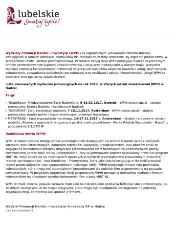 Wydziały Promocji Handlu i Inwestycji (WPHI) są zagranicznymi placówkami Ministra Rozwoju działającymi w ramach Ambasad i Konsulatów RP. Placówki te zostały utworzone, by wspierać polskie firmy, w szczególności małe i średnie przedsiębiorstwa. W ramach swojej misji WPHI pomagają również zagranicznym firmom zainteresowanym kupnem polskich towarów i usług oraz inwestycjami w naszym kraju. Wszystkie wydziały udzielają kompleksowych informacji dotyczących warunków eksportu towarów i usług, taryf celnych, podatkowych, prowadzenia działalności gospodarczej oraz możliwości zakupu nieruchomości. Usługi WPHI są bezpłatne oraz oparte na zasadach etyki. Lista planowanych wydarzeń promocyjnych na rok 2017, w których udział zadeklarował WPHI w Hadze: Targi: ● ● ● "BouwBeurs" Międzynarodowe Targi Budowlane, 6-10.02.2017, Utrecht – WPHI bierze udział – stoisko promocyjne, branża Budowa i wykańczanie budowli "EUROPORT" Targi technologii morskiej, 7-10.11.2017, Rotterdam - WPHI bierze udział – stoisko promocyjne, branża Jachty i łodzie rekreacyjne; przemysł stoczniowy METSTRADE – targi wyposażenia morskiego, 14-17.11.2017 r. Amsterdam – stoisko narodowe w ramach projektu „Promocja gospodarki w oparciu o polskie marki produktowe – Marka Polskiej Gospodarki – Brand” z poddziałania 3.3.2 PO IR Dodatkowa oferta WPHI: WPHI w Hadze posiada dostęp do baz przedsiębiorców działających na terenie Holandii (wraz z adresami, adresami stron internetowych, numerami telefonów, wielkością przedsiębiorstwa, bez adresów email ze względu na holenderskie przepisy dotyczące przedstawiania ofert handlowych za pośrednictwem poczty elektronicznej adresy takie nie są udostępniane). Listy są generowane poprzez użytkowany przez nas program MINT NL, który opiera się na informacjach zawartych w rejestrze przedsiębiorstw prowadzonym przez KvK (Kamer van Koophandel – Izba Handlowo – Przemysłowa, która jako jedyna instytucja w Holandii prowadzi rejestr przedsiębiorców i jest odpowiednikiem polskiego KRS). WPHI przekazuje firmom listę podmiotów holenderskich, które mogą być potencjalnymi kontrahentami dla polskich firm wygenerowaną na postawie powyższej bazy. W przypadku organizacji misji gospodarczej WPHI pomaga w umówieniu spotkań z firmami holenderskimi na podstawie wyselekcjonowanych firm z bazy MINT NL. WPHI w chwili obecnej posiada zarówno małe sale na indywidualne spotkania B2B oraz salę konferencyjną (ok. 50 miejsc siedzących lub 80 miejsc stojących), które mogą być nieodpłatnie udostępnione na potrzeby organizacji misji, konferencji lub spotkań z firmami. Wydział Promocji Handlu i Inwestycji Ambasady RP w Hadze Van Lennepweg 51 2597 LG DEN HAAG, Netherlands tel.: +31 (0)70 306 99 44 Lage: Typ: WPHI Webseite: http://www.haga.trade.gov.pl [1] Drucken [2] PDF herunterladen [3] Download DOC [4] Source URL: http://invest.lubelskie.pl/de/wydzial-promocji-handlu-i-inwestycji-ambasady-rp-w-hadze Links [1] http://www.haga.trade.gov.pl [2] http://invest.lubelskie.pl/de/print/921 [3] http://invest.lubelskie.pl/de/printpdf/921 [4] http://invest.lubelskie.pl/de/print/921?type=doc