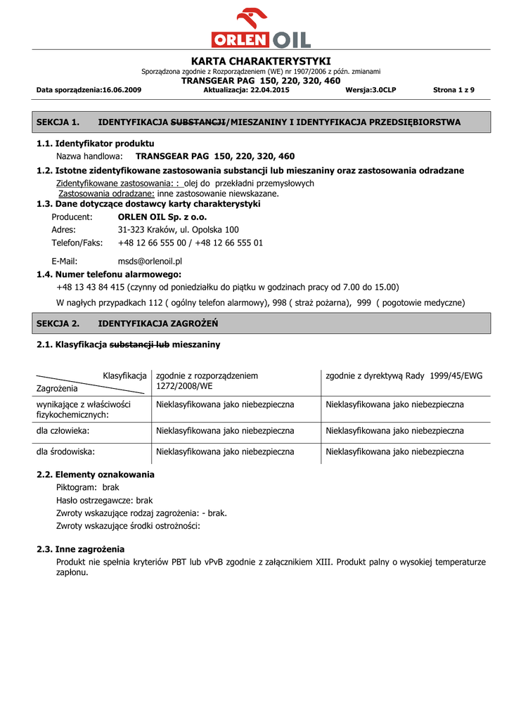 KARTA CHARAKTERYSTYKI Sporządzona zgodnie z Rozporządzeniem (WE) nr 1907/2006 z późn. zmianami TRANSGEAR PAG 150, 220, 320, 460 Data sporządzenia:16.06.2009 SEKCJA 1. Aktualizacja: 22.04.2015 Wersja:3.0CLP Strona 1 z 9 IDENTYFIKACJA SUBSTANCJI/MIESZANINY I IDENTYFIKACJA PRZEDSIĘBIORSTWA 1.1. Identyfikator produktu Nazwa handlowa: TRANSGEAR PAG 150, 220, 320, 460 1.2. Istotne zidentyfikowane zastosowania substancji lub mieszaniny oraz zastosowania odradzane Zidentyfikowane zastosowania: : olej do przekładni przemysłowych Zastosowania odradzane: inne zastosowanie niewskazane. 1.3. Dane dotyczące dostawcy karty charakterystyki Producent: ORLEN OIL Sp. z o.o. Adres: 31-323 Kraków, ul. Opolska 100 Telefon/Faks: +48 12 66 555 00 / +48 12 66 555 01 E-Mail: [email protected] 1.4. Numer telefonu alarmowego: +48 13 43 84 415 (czynny od poniedziałku do piątku w godzinach pracy od 7.00 do 15.00) W nagłych przypadkach 112 ( ogólny telefon alarmowy), 998 ( straż pożarna), 999 ( pogotowie medyczne) SEKCJA 2. IDENTYFIKACJA ZAGROŻEŃ 2.1. Klasyfikacja substancji lub mieszaniny Klasyfikacja zgodnie z rozporządzeniem 1272/2008/WE zgodnie z dyrektywą Rady 1999/45/EWG wynikające z właściwości fizykochemicznych: Nieklasyfikowana jako niebezpieczna Nieklasyfikowana jako niebezpieczna dla człowieka: Nieklasyfikowana jako niebezpieczna Nieklasyfikowana jako niebezpieczna dla środowiska: Nieklasyfikowana jako niebezpieczna Nieklasyfikowana jako niebezpieczna Zagrożenia 2.2. Elementy oznakowania Piktogram: brak Hasło ostrzegawcze: brak Zwroty wskazujące rodzaj zagrożenia: - brak. Zwroty wskazujące środki ostrożności: 2.3. Inne zagrożenia Produkt nie spełnia kryteriów PBT lub vPvB zgodnie z załącznikiem XIII. Produkt palny o wysokiej temperaturze zapłonu. KARTA CHARAKTERYSTYKI Sporządzona zgodnie z Rozporządzeniem (WE) nr 1907/2006 z późn. zmianami TRANSGEAR PAG 150, 220, 320, 460 Data sporządzenia:16.06.2009 SEKCJA 3. Aktualizacja: 22.04.2015 Wersja:3.0CLP Strona 2 z 9 SKŁAD/INFORMACJA O SKŁADNIKACH 3.1. Substancje : nie dotyczy 3.2. Mieszaniny: Niebezpieczne składniki, zakresy ich stężeń w mieszaninie: Nazwa substancji Nr rejestracji REACH Nr CAS / Nr WE % wag. Klasyfikacja wg 67/548/EWG Klasyfikacja wg 1272/2008 (CLP) produkty reakcji Nfenylobenzenoaminy z 2,4,4-trimetylopentenem niedostępne 68411-46-1/ 1<C<-5 R52/53 Aquatic Chronic 3; H412 fosforany monoheksylowe i diheksylowe C11-14rozgałęzionych alkiloamin niedostępne 0,1<c<1 Xi, N (Z)-N-metylo-N-(1-okso-9oktadecenylo)glicyna niedostępne Skin Irrit. 2; H315 Eye Irrit 2: H319 Aquatic Chronic 2; H411 Skin Irrit. 2; H315 Eye Dam 1;H 318 Equatic Acute 1; H400 Faktor M - ostry: 1 270-128-1 80939-62-4 279-632-6 110-25-8/ 203-749-3 36/38, 51/53 0,1<c<1 Xi,N R38, R41,R 50 Opis zwrotów R i H podano w Sekcji 16 SEKCJA 4. ŚRODKI PIERWSZEJ POMOCY 4.1. Opis środków pierwszej pomocy Wdychanie: Poszkodowanego usunąć (wyprowadzić/wynieść) z miejsca narażenia na świeże powietrze; zapewnić spokój i ciepło. Nieprzytomnego ułożyć w pozycji bocznej ustalonej, rozluźnić uciskające części ubrania; kontrolować i utrzymywać drożność dróg oddechowych. W przypadku zaburzeń w oddychaniu podawać tlen, w przypadku braku oddechu stosować sztuczne oddychanie. W przypadku utraty przytomności, zaburzeń oddychania lub utrzymującego się złego samopoczucia natychmiast zapewnić pomoc lekarską.. Kontakt ze skórą: Natychmiast zdjąć zanieczyszczoną/nasiąkniętą odzież i buty. Zanieczyszczoną skórę umyć dokładnie wodą z mydłem lub łagodnym detergentem, a następnie spłukać wodą. W przypadku wystąpienia i utrzymywania się objawów podrażnienia skonsultować się z lekarzem. UWAGA: Zanieczyszczoną odzież usunąć w bezpieczne miejsce z dala od źródeł ciepła i źródeł zapłonu. Kontakt z oczami: Zanieczyszczone oczy natychmiast płukać ciągłym strumieniem wody, usunąć szkła kontaktowe (jeśli są) i kontynuować płukanie przez ok. 15 minut. Podczas płukania trzymać powieki szeroko rozwarte. W przypadku wystąpienia i utrzymywania się dolegliwości skonsultować się z lekarzem. Połknięcie: Nie prowokować wymiotów. W przypadku wystąpienia samoistnych wymiotów trzymać poszkodowanego w pozycji nachylonej do przodu z twarzą skierowaną do ziemi. Zapewnić pomoc medyczną. 4.2. Najważniejsze ostre i opóźnione objawy oraz skutki narażenia Nie określono. 4.3. Wskazania dotyczące wszelkiej natychmiastowej pomocy lekarskiej i szczególnego postępowania z poszkodowanym Nie prowokować wymiotów i nie podawać niczego doustnie osobie nieprzytomnej. Pokazać kartę charakterystyki lub etykietę/opakowanie personelowi medycznemu udzielającemu pomocy. Osoby udzielające pomocy w obszarze KARTA CHARAKTERYSTYKI Sporządzona zgodnie z Rozporządzeniem (WE) nr 1907/2006 z późn. zmianami TRANSGEAR PAG 150, 220, 320, 460 Data sporządzenia:16.06.2009 Aktualizacja: 22.04.2015 Wersja:3.0CLP Strona 3 z 9 o nieznanym stężeniu par/mgły powinny być wyposażone w odpowiednie ochrony dróg oddechowych. Wskazówki dla lekarza: leczenie objawowe. SEKCJA 5. POSTĘPOWANIE W PRZYPADKU POŻARU 5.1. Środki gaśnicze Odpowiednie środki gaśnicze: dwutlenek węgla, proszek gaśniczy, piana, rozpylona woda Niewłaściwe środki gaśnicze: zwarty strumień wody. 5.2. Szczególne zagrożenia związane z substancją lub mieszaniną Produkt palny o wysokiej temperaturze zapłonu. W środowisku pożaru powstają niebezpieczne gazy zawierające tlenki węgla, tlenki azotu, tlenki siarki i inne niezidentyfikowane produkty termicznego rozkładu wyższych węglowodorów. Unikać wdychania produktów uwalniających się w środowisku pożaru. 5.3. Informacje dla straży pożarnej Postępować zgodnie z procedurami obowiązującymi przy gaszeniu pożarów chemikaliów. W przypadku pożaru obejmującego duże ilości produktu, usunąć/ewakuować z obszaru zagrożenia wszystkie osoby postronne; we