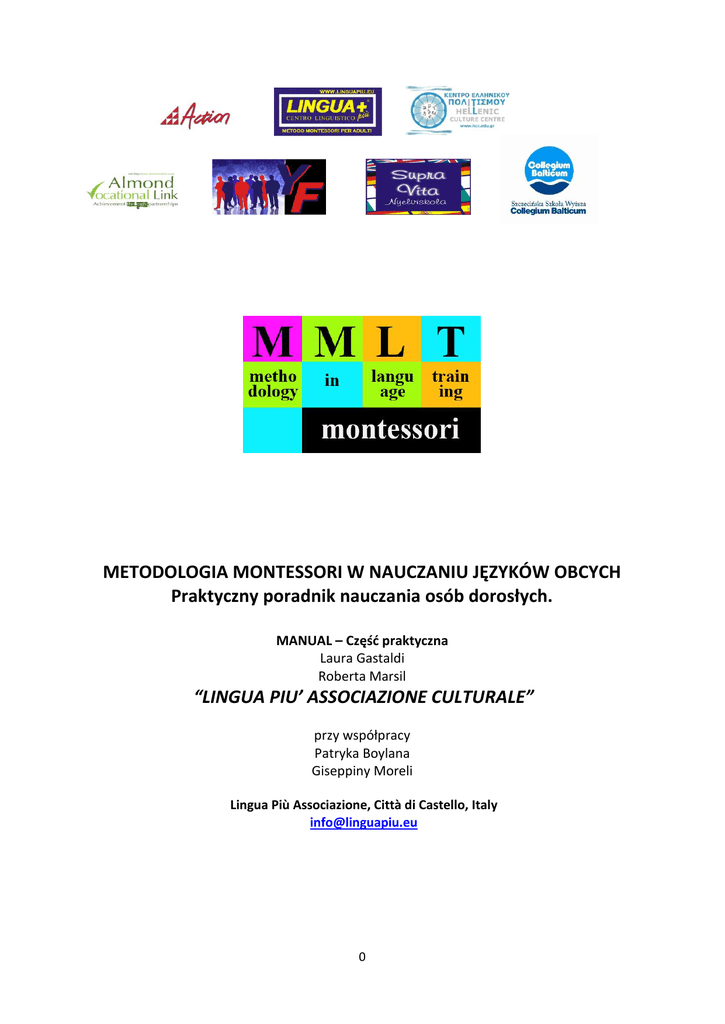 METODOLOGIA MONTESSORI W NAUCZANIU JĘZYKÓW OBCYCH Praktyczny poradnik nauczania osób dorosłych. MANUAL – Część praktyczna Laura Gastaldi Roberta Marsil “LINGUA PIU’ ASSOCIAZIONE CULTURALE” przy współpracy Patryka Boylana Giseppiny Moreli Lingua Più Associazione, Città di Castello, Italy [email protected] 0 TREŚĆ Wstęp ...................................................................................................................................... 3 Prawa Własności Intelektualnej .............................................................................................. 3 Rozdział 1 Krótki wstęp do zasad kształcenia Montessori......................................................................... 5 1.1 Video przedstawiające przykładowy kurs języka obcego dla osób dorosłych z wykorzystaniem nauczania Montessori. ……………………………………………………………………………… 5 1.2 12 zasad Montessori. ………………………………………………………………………………………………….… 5 1.3 Szczególny charakter metodologii Montessori. …………………………………………………………….. 6 Rozdział 2 W jaki sposób metodologia Montessori może zaradzić powracającym problemom w klasie. 2.1 Wprowadzenie …………………………………………………………………………………………………………… 8 2.2 Lista 10 przyczyn stresu ………………………………………………………………………………………………. 8 2.3 Tabele przedstawiające przyczyny stresu wraz z proponowanymi ćwiczeniami ………. 9 2.4 Zarządzanie stresem na kursie języka obcego dla osób dorosłych w oparciu o zasady Montessori ……………………………………………………………………………………………………………………… 10 2.5 Wnioski…………. ……………………………………………………………………………………………………….… 26 Rozdział 3 Jak przygotować lekcję języka obcego dla dorosłych kursantów w oparciu o Metodologię Montessori …………………………………………………………………………………………………………………….… 27 3.1 Wprowadzenie do metodologii Montessori w pełni zaadaptowanej do kursu języka obcego dla osób dorosłych …………………………………………………………………………………………….… 27 3.2 Cztery przykłady wykorzystania metody Montessori w nauczaniu języka obcego osób dorosłych - przykłady lekcji …………………………………………………………………………………………….. 28 3.3 Końcowy komentarz do Lekcji 1, 2, 3, i X ………………………………………………………………….. 47 3.4 Sugestie do przygotowania własnego kursu językowego z wykorzystaniem metodologii Montessori ……………………………………………………………………………………………………………………… 48 Rozdział 4 Rozważania teoretyczne ..……………………………………………………………………………………………….. 52 4.1 Wprowadzenie ……………………………………………………………………………………………………….… 52 4.2 Czym jest język? …………………………………………………………………………………………………….…. 53 4.3 Istota nauczania języków obcych w obecnych czasach?………………………………………….…. 56 4.4 Co sprawia, że metodologia Montessori jest skuteczna?…...………………………………….….. 58 4.5 Metodologia Montessori w nauczaniu języków obcych – projekt MMLT ………………….. 60 4.6 Podstawa Podręcznika: na czym bazujemy i co chcielibyśmy osiągnąć ……………………… 61 4.7 12 zasad Montessori …………………………………………………………………………………………………. 63 1 Rozdział 5 Przemyślenia i komentarz po pilotażu ............................................................................... 66 Aneks Biografia Marii Montessori ……………………………………………………………………………………………… 71 Bibliografia ………………………………………………………………………………………………………….………… 74 Aneksy …………………………………………………………………………………………………………………….…….. 76 Tabela 1 – Jak przygotować Analizę Potrzeb Studenta ………………………………………..….……… 76 Tabela 2 – Lista Kontrolna Studenta ……………………………………………………………..…………..…. 78 Tabela 3 – Mapy myśli w nauczaniu języków obcych ……………………………………..………….…. 80 Plan lekcji 1 ......................................................................................................................... 81 Plan lekcji 2 ......................................................................................................................... 83 Plan lekcji 3 ......................................................................................................................... 87 2 Wstęp Niniejszy Podręcznik jest ukoronowaniem projektu Metodologia Montessori w Nauczaniu Języków Obcych, sfinansowanego przez Komisję Europejską w ramach programu Uczenie się przez całe życie (Lifelong Learning), 530963-LLP-1-2012-1-GR-KA2-KA2MP - KA2 Projekty Wielostronne. Celem niniejszego Podręcznika jest zapewnienie nauczycielom przydatnego, praktycznego i łatwego w obsłudze narzędzia w nauczaniu języków obcych w jak najbardziej ef