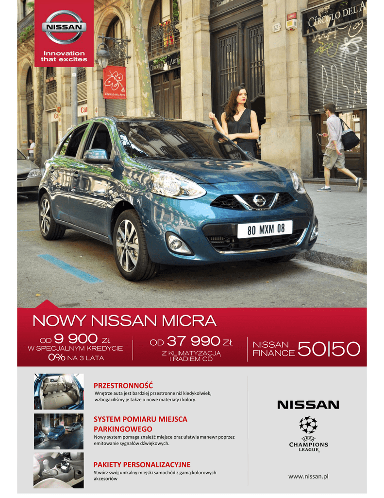 NOWY NISSAN MICRA OD 9 900 ZŁ W SPECJALNYM KREDYCIE OD 0% NA 3 LATA 37 990 ZŁ Z KLIMATYZACJĄ I RADIEM CD NISSAN FINANCE 50 50 PRZESTRONNOŚĆ Wnętrze auta jest bardziej przestronne niż kiedykolwiek, wzbogaciliśmy je także o nowe materiały i kolory. SYSTEM POMIARU MIEJSCA PARKINGOWEGO Nowy system pomaga znaleźć miejsce oraz ułatwia manewr poprzez emitowanie sygnałów dźwiękowych. PAKIETY PERSONALIZACYJNE Stwórz swój unikalny miejski samochód z gamą kolorowych akcesoriów www.nissan.pl OD 9 990 ZŁ W SPECJALNYM KREDYCIE 0% NA 3 LATA OD 37 990 ZŁ Z KLIMATYZACJĄ I RADIEM CD NISSAN FINANCE 50 50 CENNIK PROMOCYJNY 2015 1Silnik benzynowy VISIA ACENTA TEKNA 40 390 45 980 1.2 l 59 kW (80 KM) - MT 5.0 l/100 km 33 490 1.2 l 59kW (80 KM) - CVT 5.4 l/100 km 42 790 2 45 190 - 1.2 l DIG-S 72kW (98 KM) - MT 4.1 l/100 km 45 140 3 48 890 54 480 1.2 l DIG-S 72kW (98 KM) - CVT 5.0 l/100 km - 53 690 59 280 VISIA ACENTA TEKNA 4 500 S - WYPOSAŻENIE OPCJONALNE Pakiet Comfort Klimatyzacja manualna Radio CD + System bluetooth + Gniazdo USB Pakiet Auto Automatyczna klimatyzacja Konsola centralna w kolorze czarnym Czujniki deszczu i zmierzchu - 1 500 S Nissan Connect 2.0 Nowy NissanConnect 2.0 z 5.8" kolorowym wyświetlaczem dotykowym Gniazdo USB i MP3, iPod + 6 głośników - 2 300 S - - 2 000 - 1 200 S 2 000 2 000 2 000 780 780 780 1 960 1 960 1 960 Szklany dach System pomiaru wielkości miejsca parkingowego Tylne czujniki parkowania Pakiet Parkingowy Lakier metalizowany Nissan 5★ Rozszerzona Gwarancja 4 lata lub 100 000 km 4 5 lat lub 150 000 km S - Standard 1 - Przy wyborze oferty finansowej rabat wynosi 8 000 zł | Dotyczy samochodów wyprodukowanych w 2015 roku 2 - Nowy Nissan Micra – Wersja Visia ze skrzynią biegów CVT posiada klimatyzację manualną, radio CD, system Bluetooth i gniazdo USB w standardzie 3 - Wersja VISIA DIG-S zawiera manualną klimatyzację w standardzie 4 - Nissan 5★ Rozszerzona Gwarancja Umowa Ubezpieczenia Grupowego jest produktem ubezpieczeniowym; w celu uzyskania bliższych informacji prosimy zapoznać się z broszurą informacyjną oraz Ogólnymi Warunkami Ubezpieczenia dostępnymi u Autoryzowanych Dealerów CENNIK 2015 Silnik benzynowy VISIA ACENTA TEKNA 48 390 53 980 1.2 l 59 kW (80 KM) - MT 5.0 l/100 km 41 490 1.2 l 59kW (80 KM) - CVT 5.4 l/100 km 50 790 1 53 190 - 1.2 l DIG-S 72kW (98 KM) - MT 4.1 l/100 km 53 140 2 56 890 62 480 1.2 l DIG-S 72kW (98 KM) - CVT 5.0 l/100 km - 61 690 67 280 VISIA ACENTA TEKNA 4 500 S - WYPOSAŻENIE OPCJONALNE Pakiet Comfort Klimatyzacja manualna Radio CD + System bluetooth + Gniazdo USB Pakiet Auto Automatyczna klimatyzacja Konsola centralna w kolorze czarnym Czujniki deszczu i zmierzchu - 1 500 S Nissan Connect 2.0 Nowy NissanConnect 2.0 z 5.8" kolorowym wyświetlaczem dotykowym Gniazdo USB i MP3, iPod + 6 głośników - 2 300 S - - 2 000 - 1 200 S 2 000 2 000 2 000 780 780 780 1 960 1 960 1 960 Szklany dach System pomiaru wielkości miejsca parkingowego Tylne czujniki parkowania Pakiet Parkingowy Lakier metalizowany Nissan 5★ Rozszerzona Gwarancja 4 lata lub 100 000 km 3 5 lat lub 150 000 km S - Standard 1 - Nowy Nissan Micra – Wersja Visia ze skrzynią biegów CVT posiada klimatyzację manualną, radio CD, system Bluetooth i gniazdo USB w standardzie 2 - Wersja VISIA DIG-S zawiera manualną klimatyzację w standardzie 3 - Nissan 5★ Rozszerzona Gwarancja Umowa Ubezpieczenia Grupowego jest produktem ubezpieczeniowym; w celu uzyskania bliższych informacji prosimy zapoznać się z broszurą informacyjną oraz Ogólnymi Warunkami Ubezpieczenia dostępnymi u Autoryzowanych Dealerów MICRA | WYPOSAŻENIE BEZPIECZEŃSTWO VISIA ACENTA TEKNA Przednie, czołowe poduszki powietrzne (kierowcy i pasażera) Przednie, boczne poduszki powietrzne Kurtynowe poduszki powietrzne Trzypunktowe pasy bezpieczeństwa dla wszystkich miejsc Sygnalizator braku zapięcia pasów bezpieczeństwa kierowcy Punkty zaczepu fotelika dla dziecka ISOFIX przy tylnych zewnętrznych fotelach Zabezpieczenie drzwi tylnych przed otwarciem przez dzieci Regulacja położenia kolumny kierownicy ESP + ABS + BA Tempomat z funkcją ograniczenia prędkości - Opony o niskich oporach toczenia Dojazdowe koło zapasowe - WYGLĄD ZEWNĘTRZNY 14" stalowe felgi z kołpakami - 15" stalowe felgi z kołpakami - - 15" felgi ze stopów metali lekkich - - Zderzaki w kolorze nadwozia Lusterka i klamki zewnętrzne w kolorze nadwozia - Tylne lampy STOP w technologii LED - Automatyczne halogenowe przednie lampy - P Czujnik deszczu - P Przednie reflektory przeciwmgłowe - - Spojler dachowy - Lusterka zewnętrzne regulowane elektrycznie - Lusterka zewnętrzne regulowane i składane elektrycznie - - Klimatyzacja manualna z filtrem przeciwpyłkowym P - Automatyczna klimatyzacja - P Elektrycznie regulowane szyby boczne z przodu Komputer pokładowy (wskaźnik temperatury zewnętrznej dostępny w wersji ACENTA+CVT oraz TEKNA) - Konsola centralna w kolorze czarnym - P Regulacja wysokości fotela kierowcy - Podłokietnik kierowcy - Tylne zagłówki 2 3 3 Siedzenie obszyte zamszową tkaniną - - Kierownica i dźwignia zmiany biegów pokryte skórą - Gniazdo 12V Szklany dach - - Dzielone, składane oparcie kanapy tylnej (w stosunku 60/40) - Wspomaganie układu kierowniczego Centralny zamek sterowany pilotem System inteligentnego kluczyka I-Key z przyciskiem Start/Stop - - System pomiaru wielkości miejsca parkingowego + Tylne czujniki parkowania - P Radio CD + System bluetooth + Gniazdo USB P - Sterowanie systemem audio przyciskami na kierownicy P NissanConnect 2.0 z 5.8" kolorowym wyświetlaczem dotykowym + Gniazdo USB i MP3, iPod + 6 głośników - Pakiet Comfort: Klimatyzacja manualna + Radio CD + System bluetooth + Gniazdo USB - Pakiet Comfort Plus: Podgrzewane przednie fotele + Elektrycznie regulowane, skaładane, podgrzewane lusterka + Regulacja wysokości fotela kierowcy + Podłokietnik kierowcy - - Pakiet Auto: Automatyczna klimatyzacja + Konsola centralna w kolorze czarnym + Czu