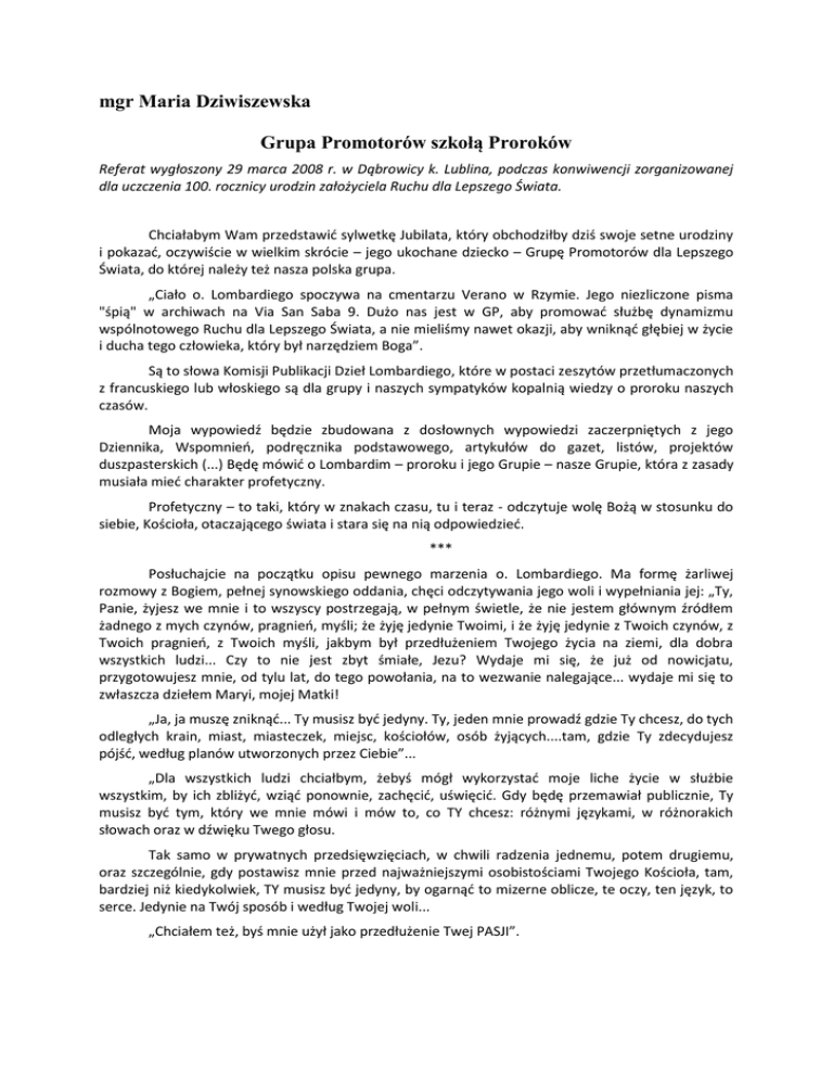 mgr Maria Dziwiszewska Grupa Promotorów szkołą Proroków Referat wygłoszony 29 marca 2008 r. w Dąbrowicy k. Lublina, podczas konwiwencji zorganizowanej dla uczczenia 100. rocznicy urodzin założyciela Ruchu dla Lepszego Świata. Chciałabym Wam przedstawić sylwetkę Jubilata, który obchodziłby dziś swoje setne urodziny i pokazać, oczywiście w wielkim skrócie – jego ukochane dziecko – Grupę Promotorów dla Lepszego Świata, do której należy też nasza polska grupa. „Ciało o. Lombardiego spoczywa na cmentarzu Verano w Rzymie. Jego niezliczone pisma "śpią" w archiwach na Via San Saba 9. Dużo nas jest w GP, aby promować służbę dynamizmu wspólnotowego Ruchu dla Lepszego Świata, a nie mieliśmy nawet okazji, aby wniknąć głębiej w życie i ducha tego człowieka, który był narzędziem Boga”. Są to słowa Komisji Publikacji Dzieł Lombardiego, które w postaci zeszytów przetłumaczonych z francuskiego lub włoskiego są dla grupy i naszych sympatyków kopalnią wiedzy o proroku naszych czasów. Moja wypowiedź będzie zbudowana z dosłownych wypowiedzi zaczerpniętych z jego Dziennika, Wspomnień, podręcznika podstawowego, artykułów do gazet, listów, projektów duszpasterskich (...) Będę mówić o Lombardim – proroku i jego Grupie – nasze Grupie, która z zasady musiała mieć charakter profetyczny. Profetyczny – to taki, który w znakach czasu, tu i teraz - odczytuje wolę Bożą w stosunku do siebie, Kościoła, otaczającego świata i stara się na nią odpowiedzieć. *** Posłuchajcie na początku opisu pewnego marzenia o. Lombardiego. Ma formę żarliwej rozmowy z Bogiem, pełnej synowskiego oddania, chęci odczytywania jego woli i wypełniania jej: „Ty, Panie, żyjesz we mnie i to wszyscy postrzegają, w pełnym świetle, że nie jestem głównym źródłem żadnego z mych czynów, pragnień, myśli; że żyję jedynie Twoimi, i że żyję jedynie z Twoich czynów, z Twoich pragnień, z Twoich myśli, jakbym był przedłużeniem Twojego życia na ziemi, dla dobra wszystkich ludzi... Czy to nie jest zbyt śmiałe, Jezu? Wydaje mi się, że już od nowicjatu, przygotowujesz mnie, od tylu lat, do tego powołania, na to wezwanie nalegające... wydaje mi się to zwłaszcza dziełem Maryi, mojej Matki! „Ja, ja muszę zniknąć... Ty musisz być jedyny. Ty, jeden mnie prowadź gdzie Ty chcesz, do tych odległych krain, miast, miasteczek, miejsc, kościołów, osób żyjących....tam, gdzie Ty zdecydujesz pójść, według planów utworzonych przez Ciebie”... „Dla wszystkich ludzi chciałbym, żebyś mógł wykorzystać moje liche życie w służbie wszystkim, by ich zbliżyć, wziąć ponownie, zachęcić, uświęcić. Gdy będę przemawiał publicznie, Ty musisz być tym, który we mnie mówi i mów to, co TY chcesz: różnymi językami, w różnorakich słowach oraz w dźwięku Twego głosu. Tak samo w prywatnych przedsięwzięciach, w chwili radzenia jednemu, potem drugiemu, oraz szczególnie, gdy postawisz mnie przed najważniejszymi osobistościami Twojego Kościoła, tam, bardziej niż kiedykolwiek, TY musisz być jedyny, by ogarnąć to mizerne oblicze, te oczy, ten język, to serce. Jedynie na Twój sposób i według Twojej woli... „Chciałem też, byś mnie użył jako przedłużenie Twej PASJI”. „Jezu! Chcę całkowicie umrzeć dla Ciebie po to, by mój byt był przezroczystym płótnem Twojej obecności, tak przejrzystym, że nie przeciwstawia się ani Twojemu działaniu, ani Twemu obrazowi. Ja jestem gotowy na wszystko, obym tylko podołał...” *** Riccardo Lombardii przeżył swoje powołanie i posłannictwo w funkcji Soboru Watykańskiego II. Możemy o nim mówić jako o prawdziwym "proroku Soboru", gdyż rozumiał jego potrzebę na długo przed jego zwołaniem (o 12-15 lat wcześniej), mówił o nim z Piusem XII przy różnych okazjach. Rzeczywiście był narzędziem Papieża do realizacji konkretnych kroków odnośnie ewentualnego zwołania Soboru. Później wywarł duży wpływ na przygotowanie tego wielkiego wydarzenia kościelnego. Popychany przez swą wielka pasję reformy Kościoła i najlepsze środki jej realizacji, o. Lombardi myślał o zwołaniu ludzi najbardziej wpływowych w tym czasie i mających największą „postawę apostolską" w działaniu na rzecz Kościoła, we wspólnej akcji na wielką skalę. Po wielu trudnościach doszło do uznania przez Papieża Ruchu dla Lepszego Świata promującego systematyczną odnowę Kościoła. W dniu 10 lutego 1952 roku Papież Pius XII ogłosił przez Watykańskie Radio Proklamację, potem powołał Komisję do zorganizowania Soboru Watykańskiego II. Ale otworzył go i przeprowadził pierwsze 3 sesje nowy Papież, Jan XXIII. Kontynuował i zakończył - trzeci papież soborowy – Paweł VI. Przez cały ten czas Lombardi spotykał się z kolejnymi Papieżami, biskupami Kurii w Rzymie, biskupami diecezjalnymi w ich diecezjach we Włoszech, potem na całym świecie, organizował sesje, rekolekcje, przeprowadzał ćwiczenia z księżmi, zakonnikami, świeckimi, a w czasie trwania Soboru – z Ojcami Soborowymi, by formować "apostołów Nowego Świata". Kiedy liczba chętnych do pracy wzrastała, zdecydował się powiedzieć o tym Pawłowi VI. To była niezapomniana Audiencja prywatna w Castel Gandolfo (4/9/69). W swoim dzienniku zanotował cały przebieg spotkania: „Mówiłem mu o stosunkach publicznych w Kościele, które nie pozwalają światu widzieć cudów realizujących się wszędzie, o rozpoczynającej się odnowie, naszej pracy dla Kościoła od 1948 roku, która już przynosiła efekty... itd... Później mówiłem także o dysproporcji między pracą duszpasterską, rozwojem teologii, organizacją i... służbą animacji. Papież się zgadzał. Ale co zrobić? – zapytał. Wyjaśniłem mu kilka aspektów i przerwał mi. – Więc wy , ojcze , chcecie stworzyć szkołę proroków? – Tak Wasza Świątobliwość, tak właśnie. Zapewniam Was, że 