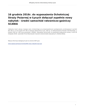 Oficjalny Serwis Internetowy Gminy Łyse 16 grudnia 2016r. do wyposażenia Ochotniczej Straży Pożarnej w Łysych dołączył zupełnie nowy nabytek - średni samochód ratowniczo-gaśniczy SCANIA Całkowity koszt zakupu nowego wozu strażackiego po przeprowadzonym postępowaniu przetargowym wyniósł 837.261 zł, w tym kwota 437.261 zł stanowi wkład Gminy Łyse, 200 tys. to dofinansowanie Powiatu Ostrołęckiego, a kolejne 200 tys. OSP Łyse pozyskała z MSWiA. Zabudowę samochodu na podstawie podpisanej umowy z dnia 28 listopada 2016r. wykonała Firma Wawrzaszek Inżynieria Samochodów Specjalnych z Bielsko-Białej. Więcej informacji dostępnych jest na stronie OSP Łyse: www.osplyse.pl/nasza-kronika/595-nowy-nabytek-osp-lyse 1