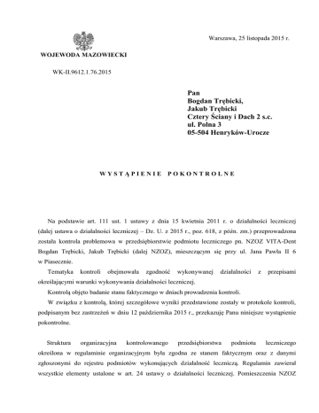 Warszawa, 25 listopada 2015 r. WOJEWODA MAZOWIECKI WK-II.9612.1.76.2015 Pan Bogdan Trębicki, Jakub Trębicki Cztery Ściany i Dach 2 s.c. ul. Polna 3 05-504 Henryków-Urocze WYSTĄPIENIE POKONTROLNE Na podstawie art. 111 ust. 1 ustawy z dnia 15 kwietnia 2011 r. o działalności leczniczej (dalej ustawa o działalności leczniczej – Dz. U. z 2015 r., poz. 618, z późn. zm.) przeprowadzona została kontrola problemowa w przedsiębiorstwie podmiotu leczniczego pn. NZOZ VITA-Dent Bogdan Trębicki, Jakub Trębicki (dalej NZOZ), mieszczącym się przy ul. Jana Pawła II 6 w Piasecznie. Tematyka kontroli obejmowała zgodność wykonywanej działalności z przepisami określającymi warunki wykonywania działalności leczniczej. Kontrolą objęto badanie stanu faktycznego w dniach prowadzenia kontroli. W związku z kontrolą, której szczegółowe wyniki przedstawione zostały w protokole kontroli, podpisanym bez zastrzeżeń w dniu 12 października 2015 r., przekazuję Panu niniejsze wystąpienie pokontrolne. Struktura organizacyjna kontrolowanego przedsiębiorstwa podmiotu leczniczego określona w regulaminie organizacyjnym była zgodna ze stanem faktycznym oraz z danymi zgłoszonymi do rejestru podmiotów wykonujących działalność leczniczą. Regulamin zawierał wszystkie elementy ustalone w art. 24 ustawy o działalności leczniczej. Pomieszczenia NZOZ spełniały wymagania ogólne oraz szczegółowe określone dla ambulatorium w rozporządzeniu Ministra Zdrowia z dnia 26 czerwca 2012 r. w sprawie szczegółowych wymagań, jakim powinny odpowiadać pomieszczenia i urządzenia podmiotu wykonującego działalność leczniczą (Dz. U. z 2012 r., poz. 739). W dokumentacji podmiotu zgromadzono dokumenty potwierdzające prawo wykonywania zawodu aktualnie zatrudnionych lekarzy dentystów. Podmiot posiadał umowę ubezpieczenia odpowiedzialności cywilnej, zgodnie z obowiązkiem ustalonym w art. 25 ust. 1 pkt 1 i ust. 2 ustawy o działalności leczniczej. W placówce umieszczono informację o prawach pacjenta, zgodnie z wymogiem określonym w art. 11 ust. 1 ustawy z dnia 6 listopada 2008 r. o prawach pacjenta i Rzeczniku Praw Pacjenta (dalej ustawa o prawach pacjenta i Rzeczniku Praw Pacjenta – Dz. U. z 2012 r., poz. 159, z późn. zm.). NZOZ dysponował dokumentacją potwierdzającą sprawność techniczną aparatury i sprzętu medycznego wykorzystywanego przy udzielaniu świadczeń medycznych, do której posiadania i okazania organowi kontroli podmiot jest zobowiązany na podstawie art. 90 ust. 6, 7 i 9 ustawy z dnia 20 maja 2010 r. o wyrobach medycznych (Dz. U. z 2015 r., poz. 876). Zbiorcza dokumentacja medyczna prowadzona i przechowywana była zgodnie z normami ustalonymi w rozporządzeniu Ministra Zdrowia z dnia 21 grudnia 2010 r. w sprawie rodzajów i zakresu dokumentacji medycznej oraz sposobu jej przetwarzania (dalej rozporządzenie w sprawie rodzajów i zakresu dokumentacji medycznej – Dz. U. z 2014 r., poz. 177, z późn. zm.). W wyniku kontroli indywidualnej dokumentacji medycznej 50 pacjentów stwierdzono następujące nieprawidłowości: a) we wszystkich przypadkach – brak oświadczenia pacjenta o upoważnieniu osoby bliskiej do uzyskiwania informacji o jego stanie zdrowia i udzielonych świadczeniach zdrowotnych, ze wskazaniem imienia i nazwiska osoby upoważnionej oraz danych umożliwiających kontakt z tą osobą, albo oświadczenia o braku takiego upoważnienia, oraz oświadczenia pacjenta o upoważnieniu osoby bliskiej do uzyskiwania dokumentacji, ze wskazaniem imienia i nazwiska osoby upoważnionej, albo oświadczenia o braku takiego upoważnienia, co jest niezgodne z § 8 pkt 1 i 2 rozporządzenia w sprawie rodzajów i zakresu dokumentacji medycznej, b) we wszystkich przypadkach – brak oznaczenia osoby udzielającej świadczeń zdrowotnych, co stanowi naruszenie § 10 ust. 1 pkt 3 rozporządzenia w sprawie rodzajów i zakresu dokumentacji medycznej, c) w 5 przypadkach – brak numeru PESEL pacjenta, co jest niezgodne z art. 25 pkt 1 lit. e ustawy o prawach pacjenta i Rzeczniku Praw Pacjenta. 2 Przedstawiając powyższe ustalenia zobowiązuję Pana do prowadzenia indywidualnej dokumentacji medycznej w szczegółowości ustalonej w przepisach rozporządzenia w sprawie rodzajów i zakresu dokumentacji medycznej oraz do poinformowania Wojewody Mazowieckiego, z powołaniem znaku pisma WK-II.9612.1.76.2015, o sposobie realizacji zalecenia pokontrolnego, niezwłocznie po otrzymaniu wystąpienia. z up. WOJEWODY MAZOWIECKIEGO Edyta Ostrowska Dyrektor Wydziału Kontroli 3