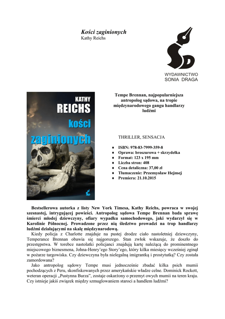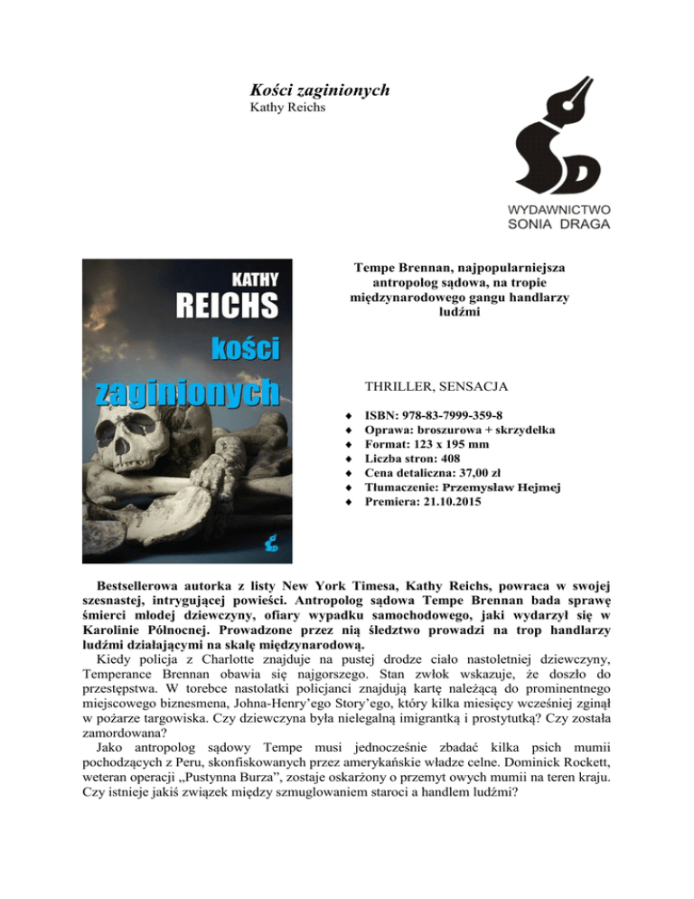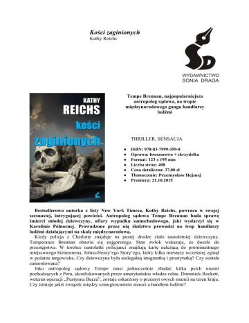 Kości zaginionych Kathy Reichs Tempe Brennan, najpopularniejsza antropolog sądowa, na tropie międzynarodowego gangu handlarzy ludźmi THRILLER, SENSACJA ISBN: 978-83-7999-359-8 Oprawa: broszurowa + skrzydełka Format: 123 x 195 mm Liczba stron: 408 Cena detaliczna: 37,00 zł Tłumaczenie: Przemysław Hejmej Premiera: 21.10.2015 Bestsellerowa autorka z listy New York Timesa, Kathy Reichs, powraca w swojej szesnastej, intrygującej powieści. Antropolog sądowa Tempe Brennan bada sprawę śmierci młodej dziewczyny, ofiary wypadku samochodowego, jaki wydarzył się w Karolinie Północnej. Prowadzone przez nią śledztwo prowadzi na trop handlarzy ludźmi działającymi na skalę międzynarodową. Kiedy policja z Charlotte znajduje na pustej drodze ciało nastoletniej dziewczyny, Temperance Brennan obawia się najgorszego. Stan zwłok wskazuje, że doszło do przestępstwa. W torebce nastolatki policjanci znajdują kartę należącą do prominentnego miejscowego biznesmena, Johna-Henry’ego Story’ego, który kilka miesięcy wcześniej zginął w pożarze targowiska. Czy dziewczyna była nielegalną imigrantką i prostytutką? Czy została zamordowana? Jako antropolog sądowy Tempe musi jednocześnie zbadać kilka psich mumii pochodzących z Peru, skonfiskowanych przez amerykańskie władze celne. Dominick Rockett, weteran operacji „Pustynna Burza”, zostaje oskarżony o przemyt owych mumii na teren kraju. Czy istnieje jakiś związek między szmuglowaniem staroci a handlem ludźmi? W miarę rozwoju wypadków Tempe zmuszona jest również zmagać się z osobistymi zawirowaniami. Jej córka Katy, pogrążona w żałobie po poległym w Afganistanie chłopaku, impulsywnie zaciąga się do armii. Jednocześnie ojciec Katy, Pete, czuje się sfrustrowany opieszałością, z jaką Tempe finalizuje ich rozwód. Problemy narastają ze wszystkich stron; niebawem Tempe zostaje uwikłana w sieć nielegalnych powiązań, które obejmują zarówno Amerykę Południową, Afganistan, jak i samo miasto Charlotte. W wielu moich książkach przygody Tempe służą mi do ilustrowania ważnych problemów społecznych. Bezwzględność sekt religijnych. Przemyt zagrożonych gatunków zwierząt. Tragedia ludzi pozbawionych wszelkich praw. Czarny rynek ludzkich narządów do przeszczepów. Pornografia dziecięca w Internecie. Także Kości zaginionych podążają tą drogą. Kathy Reichs Kathy Reichs, podobnie jak bohaterka jej książek Temperance Brennan, jest antropologiem klinicznym, do niedawna pracującym w Biurze Naczelnego Patologa Sądowego w Karolinie Północnej, obecnie zaś w Laboratoire de science judiciaires et de médicine légale w Montrealu, w kanadyjskiej prowincji Quebek. Profesor na Wydziale Antropologii Uniwersytetu Karoliny Północnej w Charlotte, jedna z zaledwie osiemdziesięciu ośmiu antropologów sądowych, certyfikowanych przez Amerykańską Radę Antropologii Klinicznej, była wiceprzewodnicząca zarówno Amerykańskiej Akademii Nauk Sądowych, jak i Amerykańskiej Rady Antropologii Klinicznej. Zasiada także w kanadyjskiej Krajowej Radzie Konsultacyjnej ds. Policji. Sławę przyniosła jej pierwsza książka Déjà Dead, która stała się bestsellerem „New York Timesa” i zdobyła Ellis Award w 1997 r. za debiut powieściowy. Jej ostatnia książka z Temperance Brennan w roli głównej, zatytułowana Kości są wieczne, natychmiast weszła na listę bestsellerów „New York Timesa”. Więcej informacji na stronie internetowej autorki: www.kathyreichs.com. Recenzje Kości zaginionych „Człowiek pragnie przerzucić kolejną stronę książki, nawet jeśli zgaśnie światło, żeby się dowiedzieć, co stanie się dalej. Znajomość prawdziwego życia pisarki przydaje jej powieściom tak wiele autentyczności, że inni autorzy kryminałów powinni być zdolni za to zabić”. –Daily Express „Czytelnik znający Kathy Reichs wie, że znajduje się w rękach eksperta”. – Sunday Express „Idealne połączenie fascynującej wiedzy naukowej i precyzyjnych portretów psychologicznych postaci, nie wspominając już o akcji rozwijającej się jak trąba powietrzna, sprawiają, że książki Kathy Reichs są lekturą obowiązkową. – Jeffery Deaver „Kathy Reichs, geniusz w budowaniu napięcia, w swojej najlepszej formie także w tej najnowszej, emocjonującej powieści”. – Daily News, Nowy Jork „Procedury sądowo-medyczne zajmują pozycję centralną w tej inteligentnie zaplanowanej i mistrzowsko poprowadzonej serii kryminałów”. – New York Times Book Reviewer „Reichs zawsze proponuje opowieść, która powoduje szybsze bicie serca”. – Publishers Weekly Sonia Draga Sp. z o.o., Pl. Grunwaldzki 8-10, 40-127 Katowice, Tel.: 32 7826477, 7826037, Fax: 032 2537728 Dział handlowy: Danuta Czarnowska, 693420384, [email protected] Promocja: Agnieszka Jedlińska, 695672067, [email protected] Redakcja: [email protected]